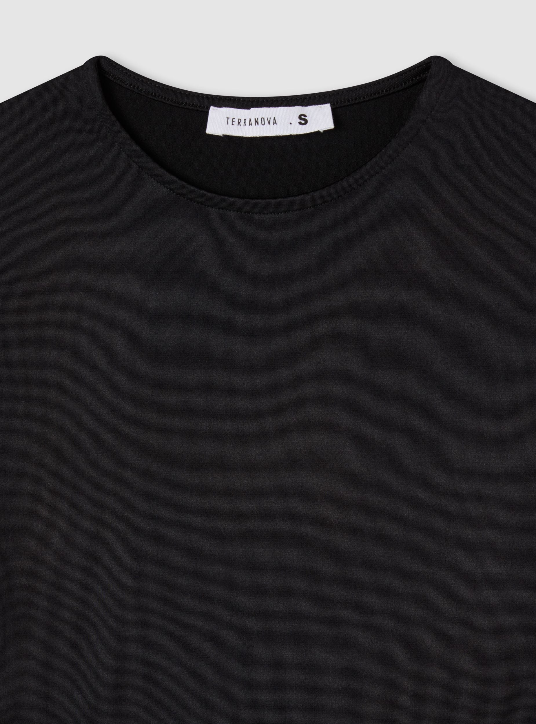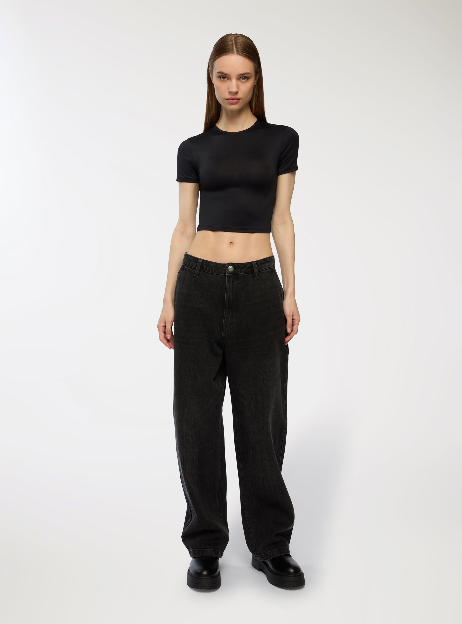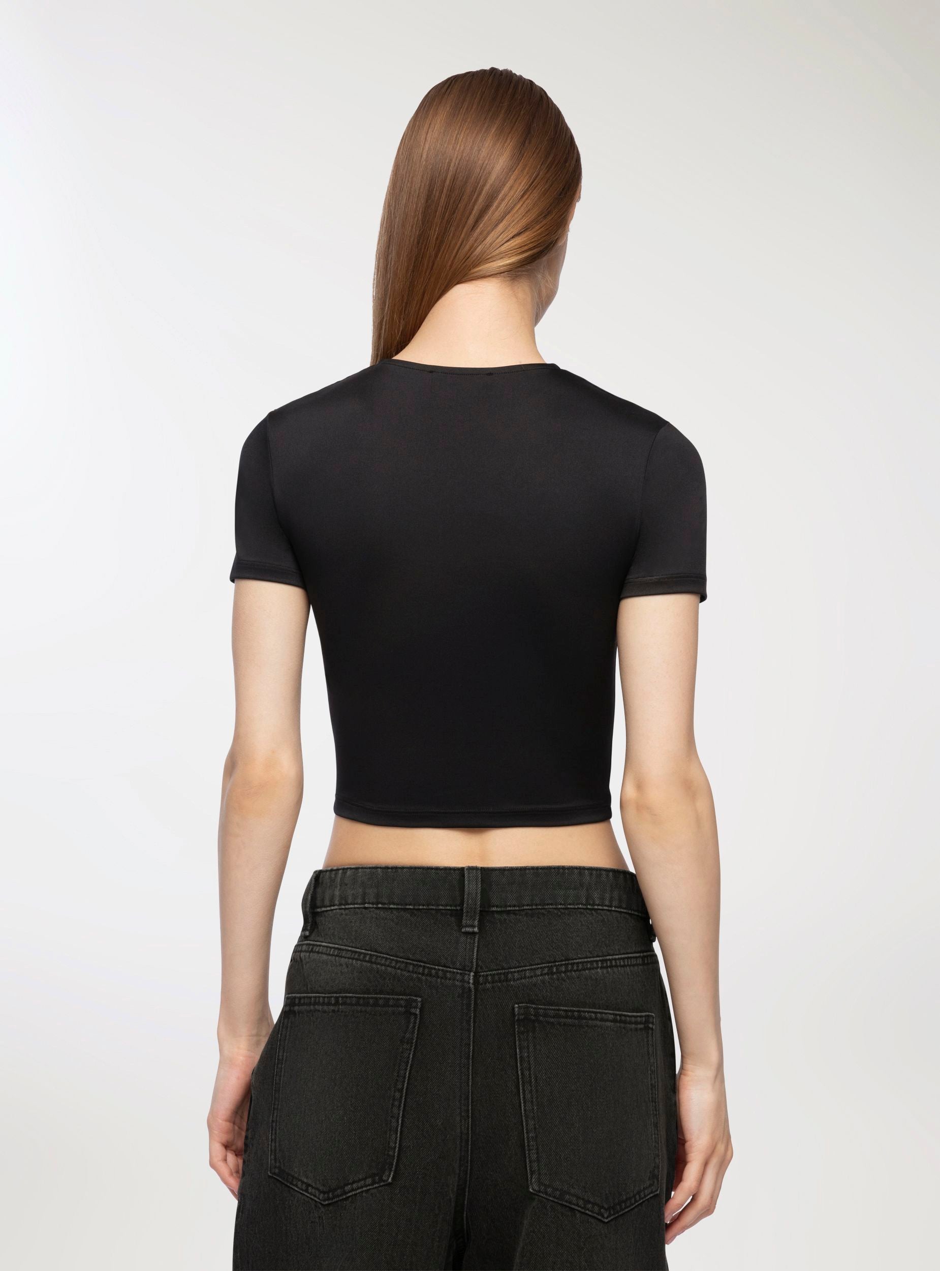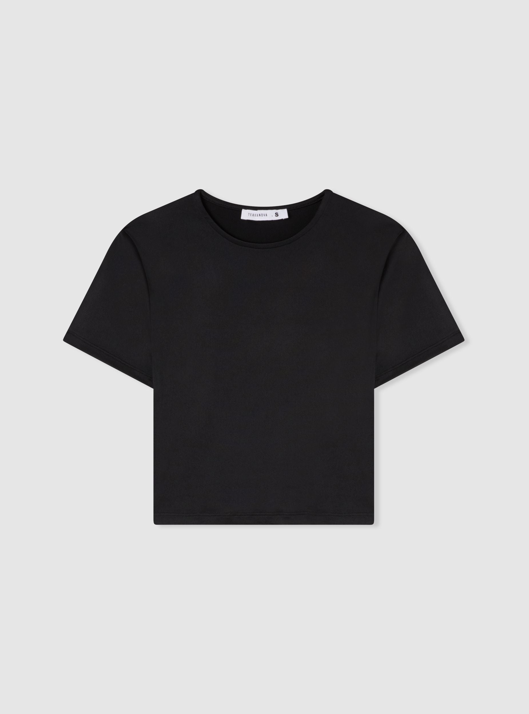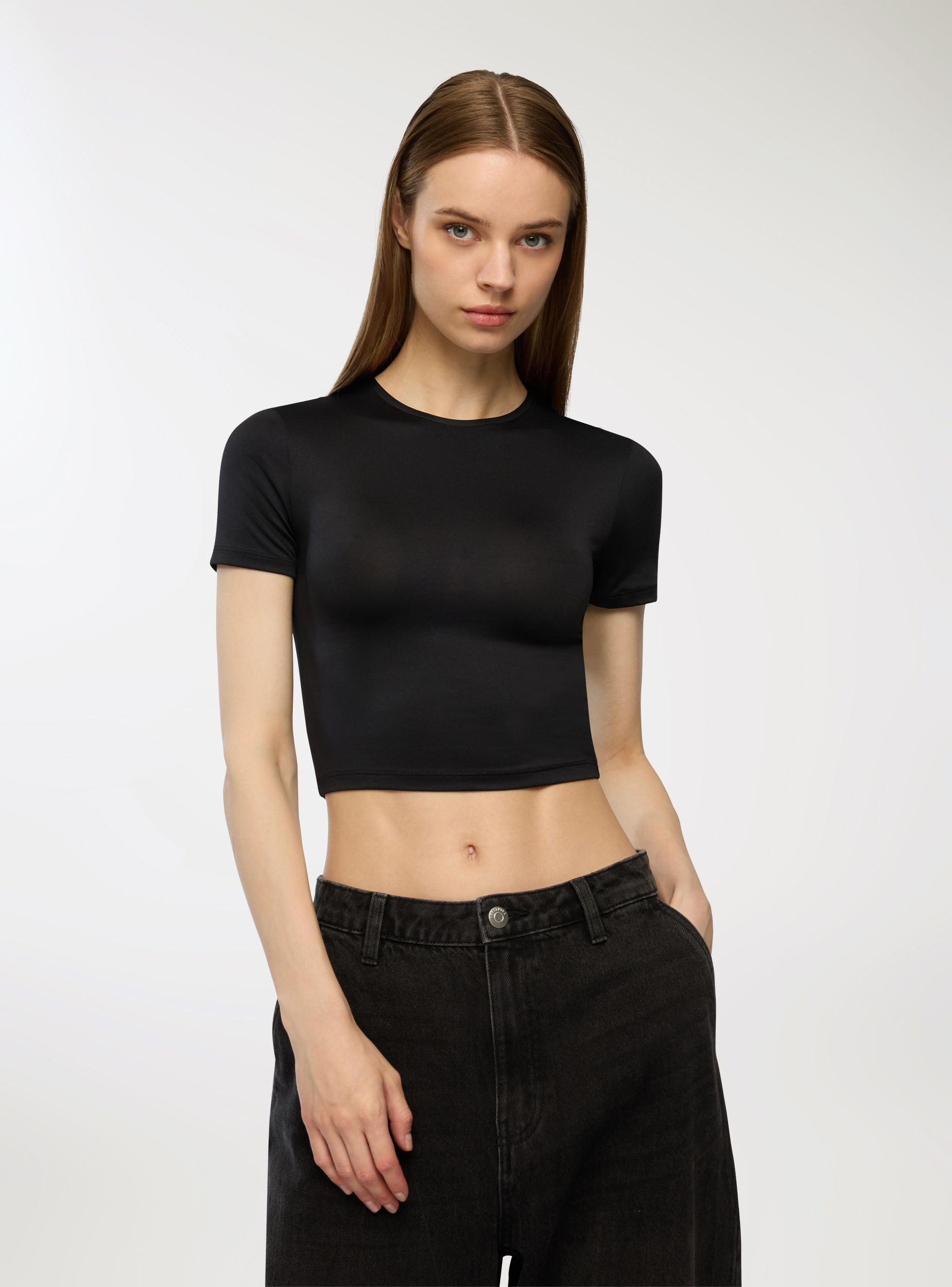 Maglietta da donna con design crop e maniche corte, realizzata in tessuto elasticizzato a tinta unita, ideale per un look casual e moderno. Presenta una vestibilità aderente che valorizza la figura, perfetta per essere abbinata a jeans o pantaloni a vita alta. Il girocollo aggiunge un tocco di semplicità e versatilità, rendendola adatta a diverse occasioni, dal tempo libero alle uscite informali.