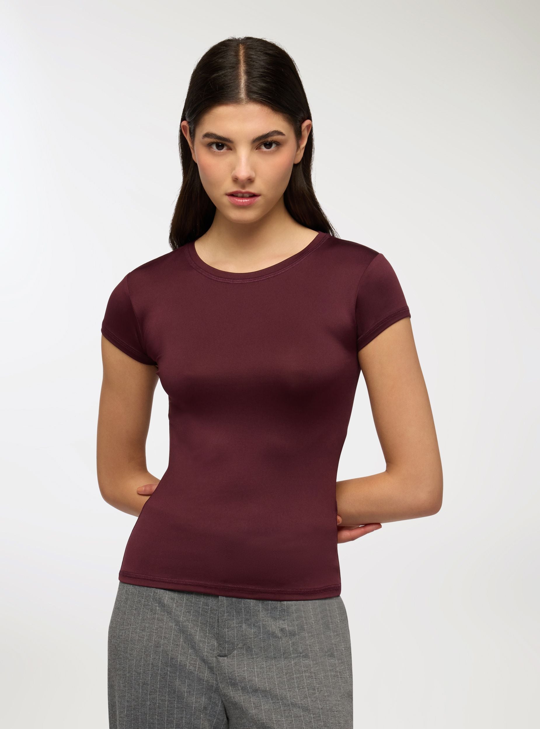 Maglietta da donna con design a tinta unita, realizzata in tessuto elasticizzato, ideale per un look casual e versatile. Presenta una vestibilità regolare con maniche corte e girocollo, perfetta per essere abbinata a jeans o pantaloni per un outfit quotidiano. Adatta per diverse occasioni, dal tempo libero alle uscite informali, garantisce comfort e stile in ogni momento.