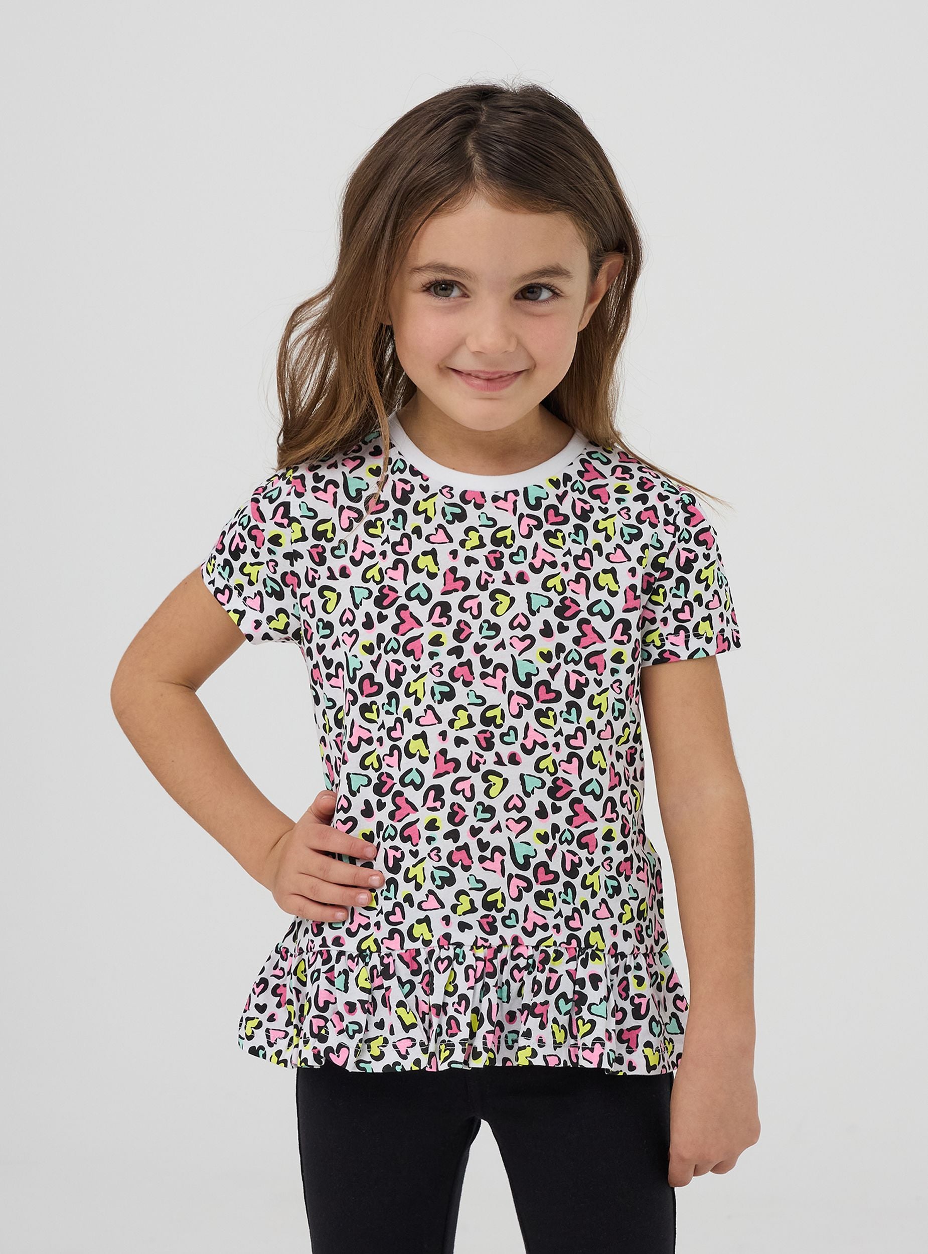 Maglietta da bimba dallo stile vivace e allegro, perfetta per portare un tocco di allegria nei look quotidiani. Con le sue maniche corte e il comodo girocollo, è ideale per la stagione calda. La stampa all-over di piccoli cuoricini aggiunge un tocco giocoso e colorato che non passerà inosservato. La balza nella parte inferiore dona un movimento leggero e femminile, rendendo questa maglietta una scelta versatile per ogni occasione, dalla scuola ai momenti di gioco. Un capo che unisce praticità e stile.