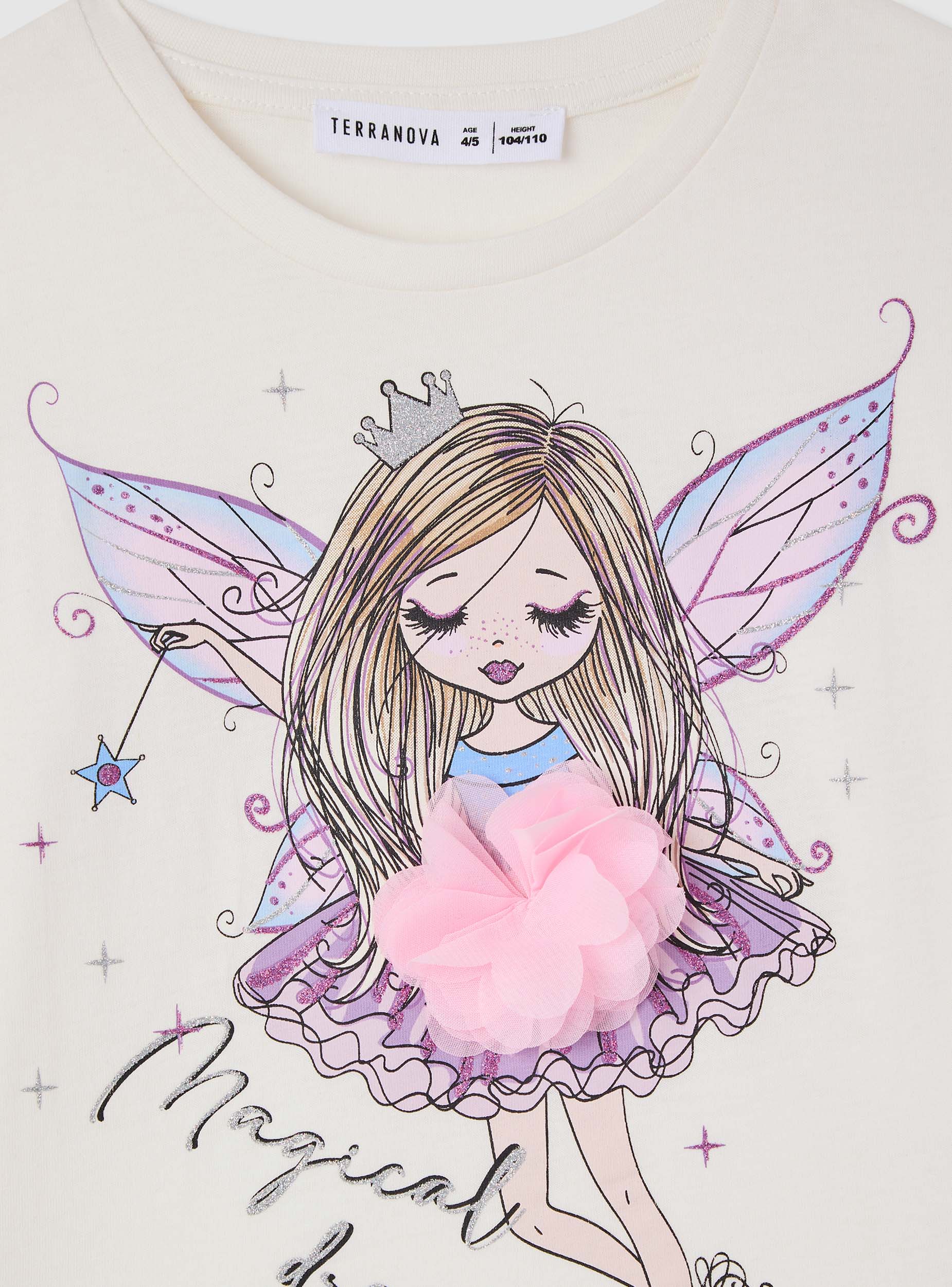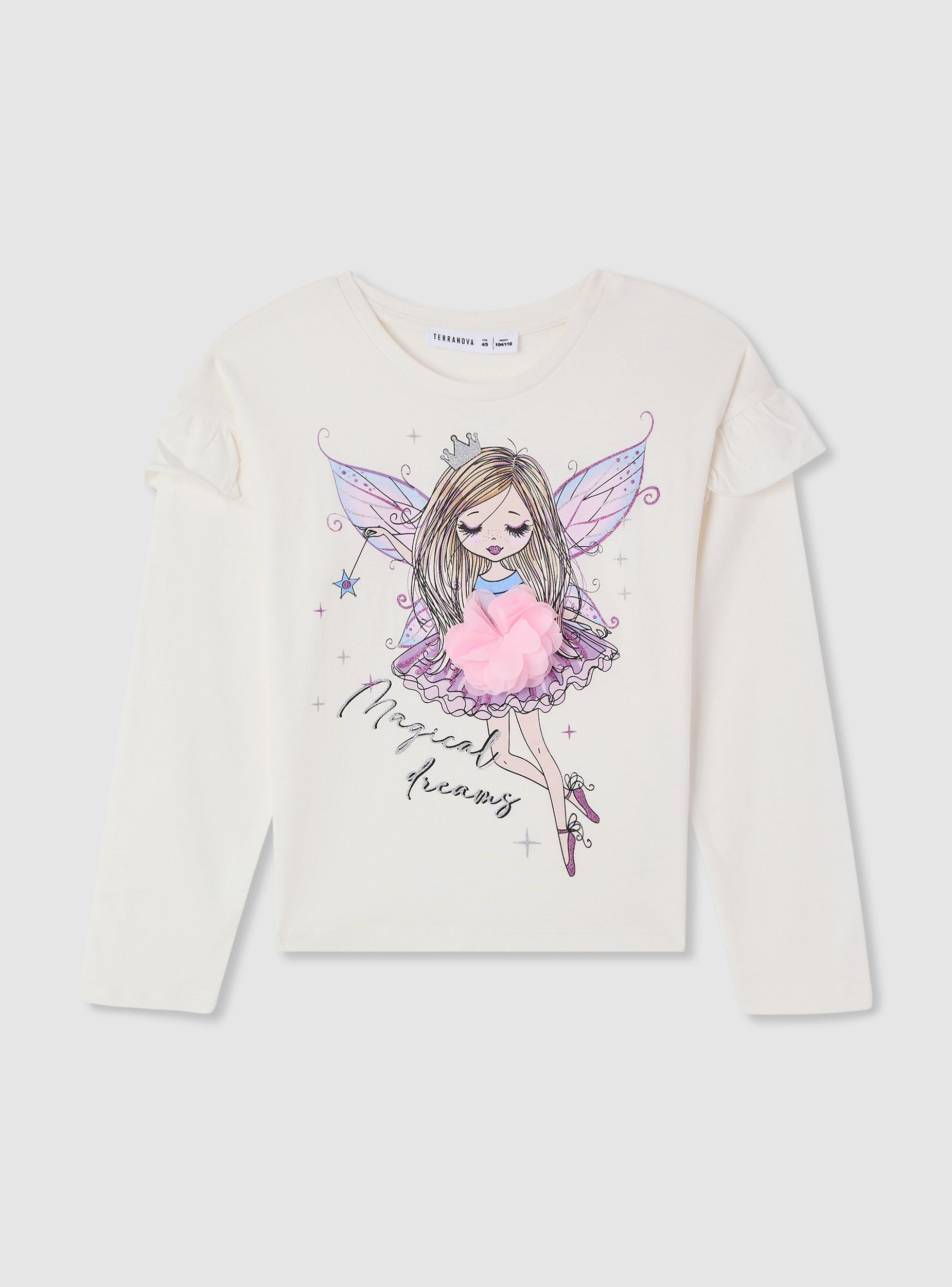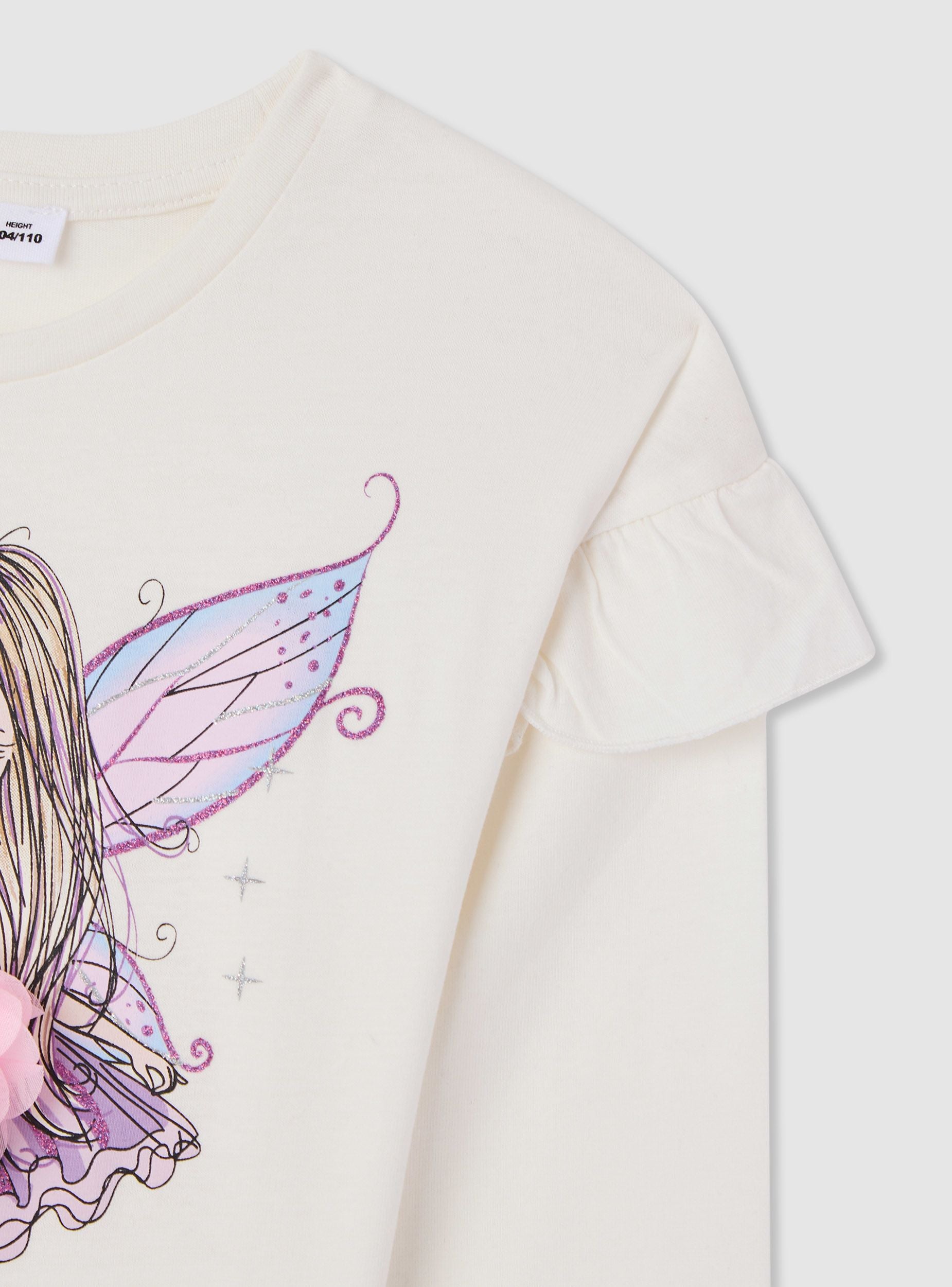 Maglietta a maniche lunghe da bimba con scollo tondo e vestibilità regular. Il fronte presenta stampa fata con scritta e applicazione 3D a fiore, ideale per scuola e tempo libero. Spalle arricciate con piccoli volant che aggiungono un tocco romantico. Facile da abbinare a jeans o gonna con sneakers o ballerine.