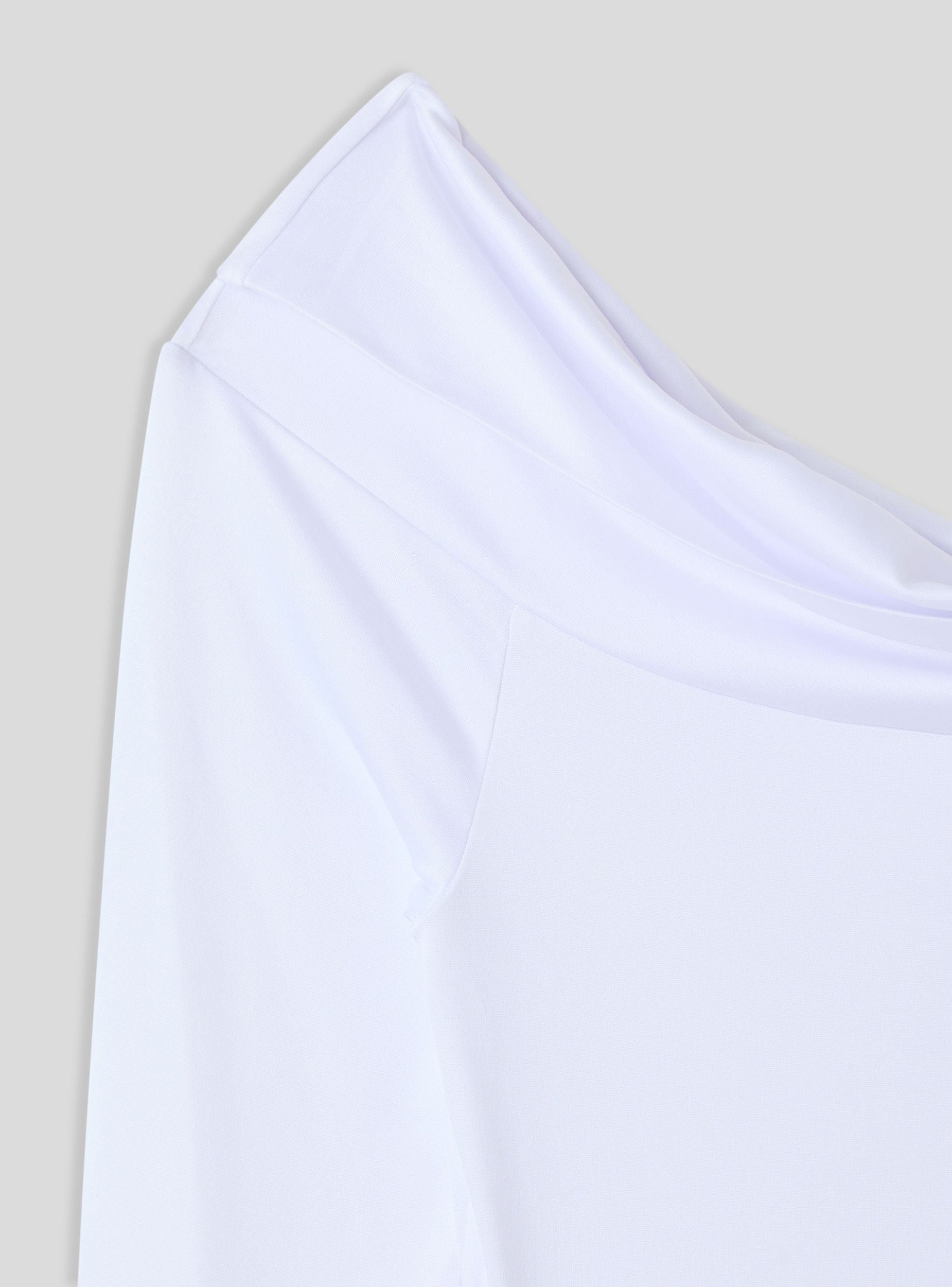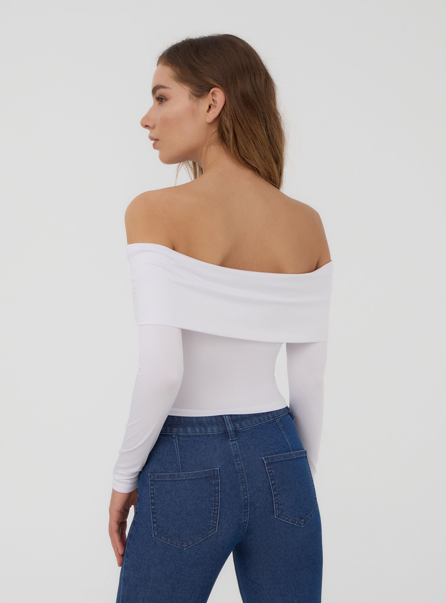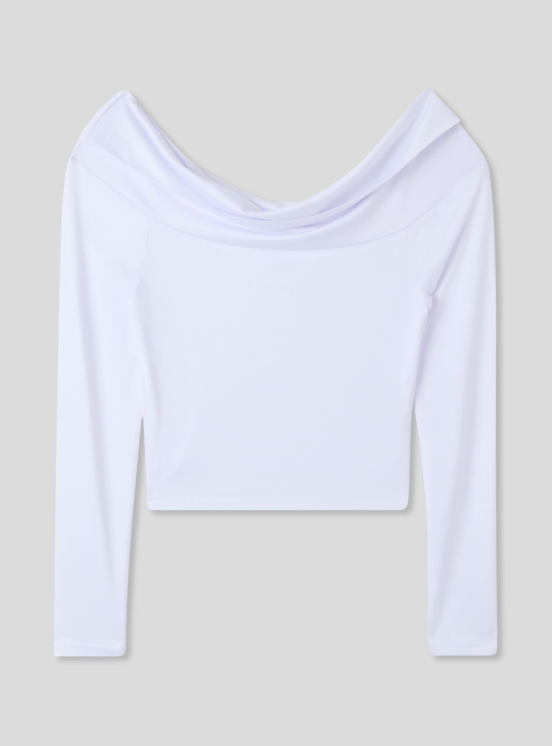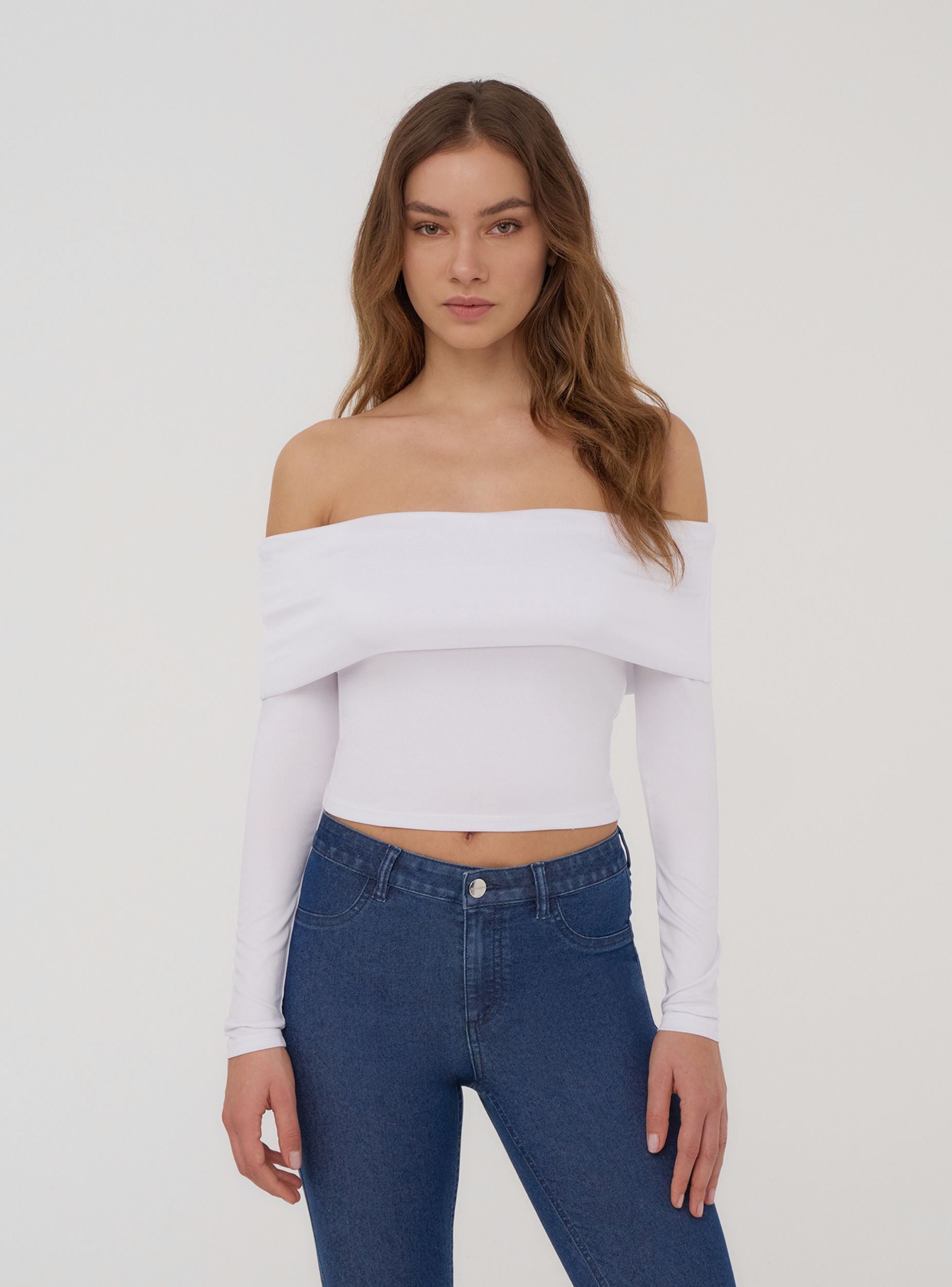 Maglia da donna elasticizzata con vestibilità crop, maniche lunghe e spalle scoperte, ideale per un look femminile e di tendenza. La tinta unita dona versatilità, perfetta per abbinamenti con jeans a vita alta o gonne aderenti. Ideale per serate fuori, eventi informali o un aperitivo, aggiunge un tocco elegante e moderno al tuo guardaroba.