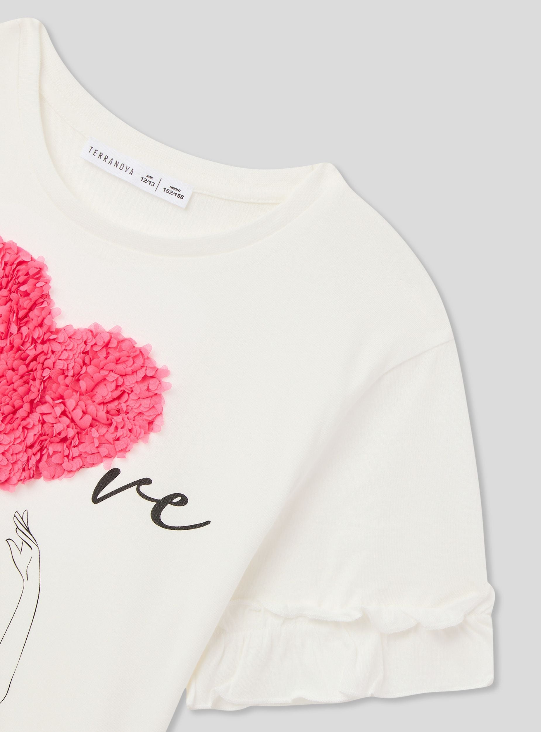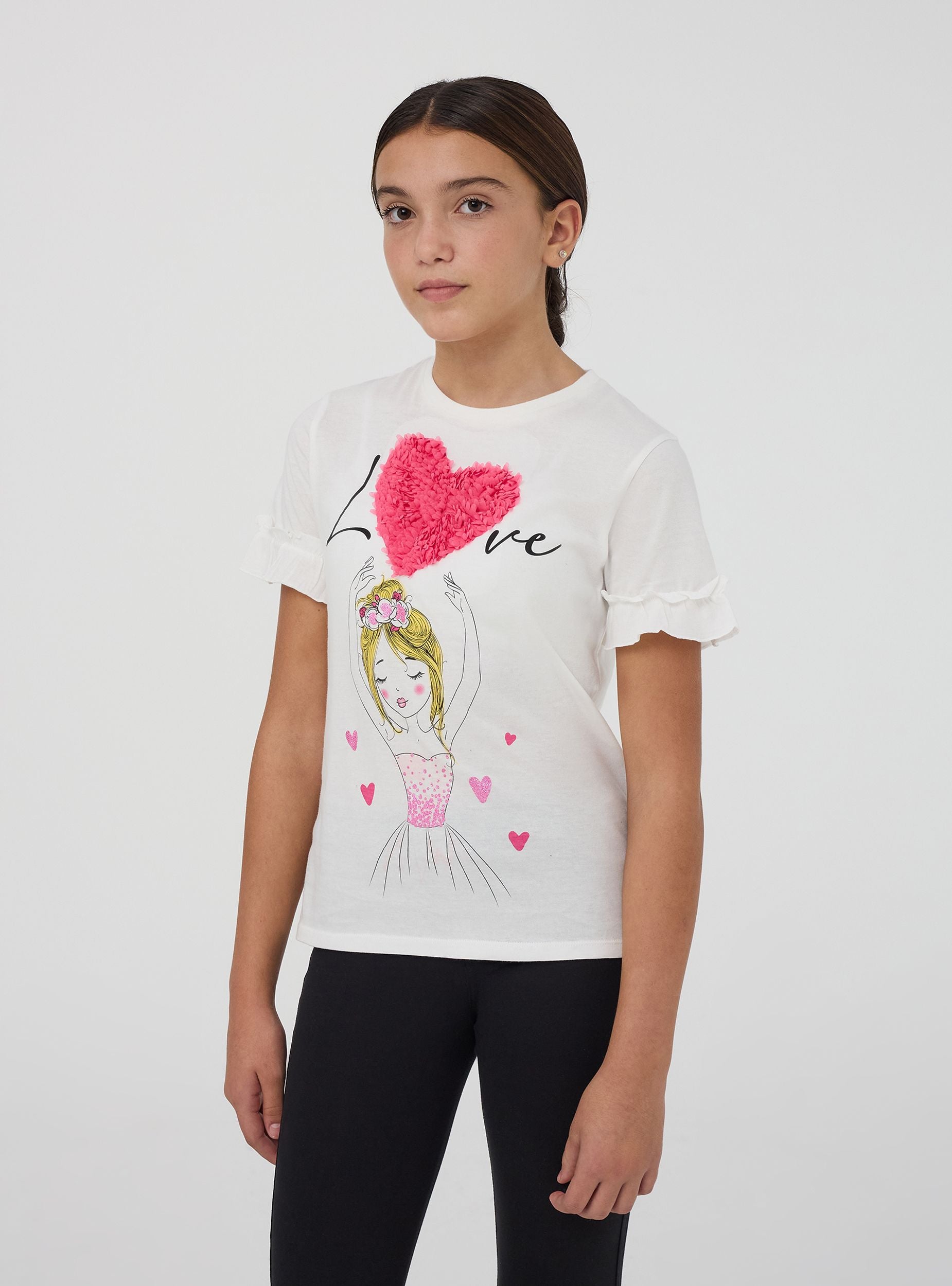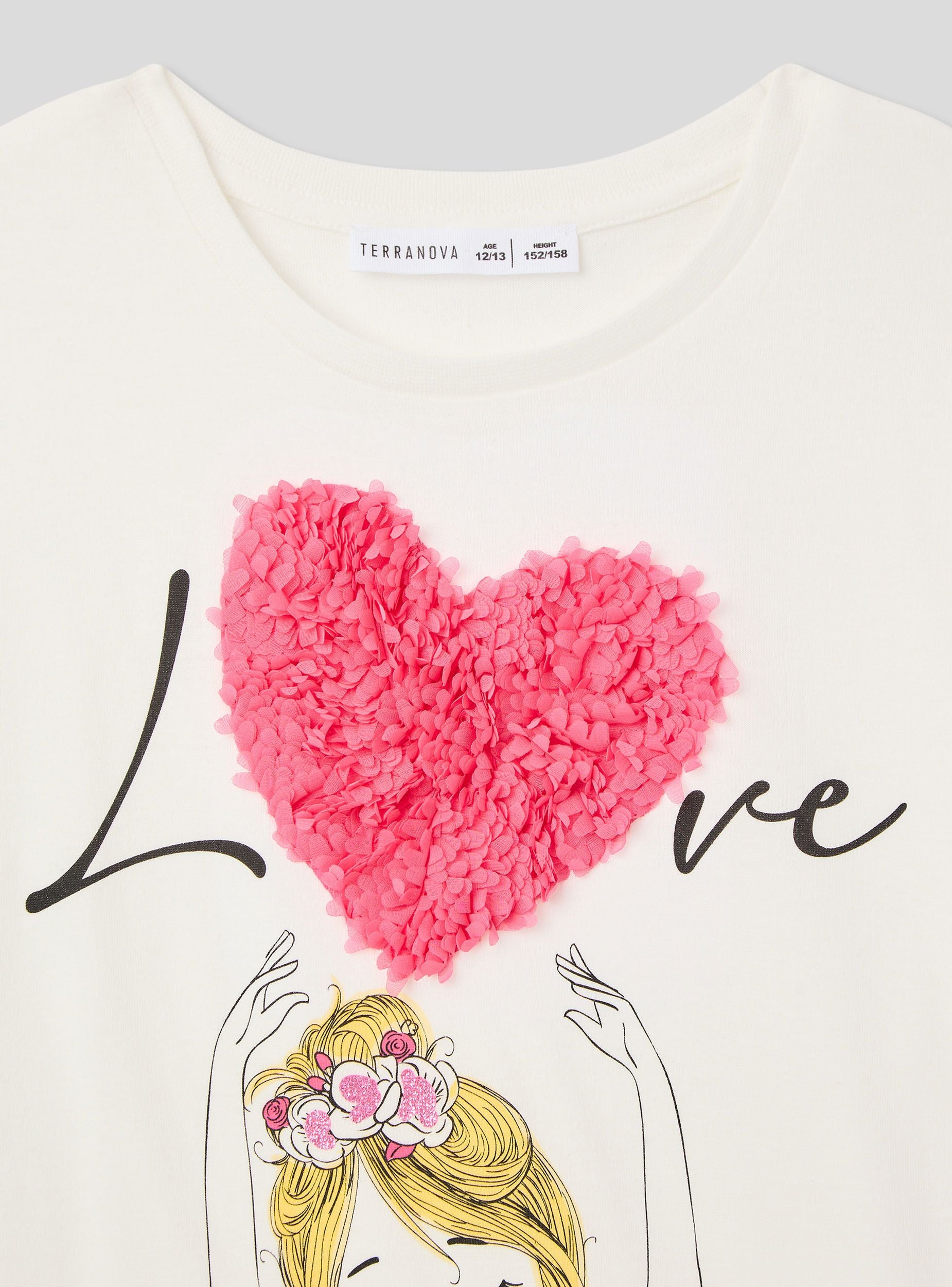 Maglietta da bambina ideale per un look dolce e giocoso, perfetta per una giornata di scuola o un'uscita con gli amici. Con maniche corte e girocollo, offre comodità e stile. La stampa è arricchita da applicazioni e un cuore con effetto petali che dona un tocco romantico e originale al design.Dettagli