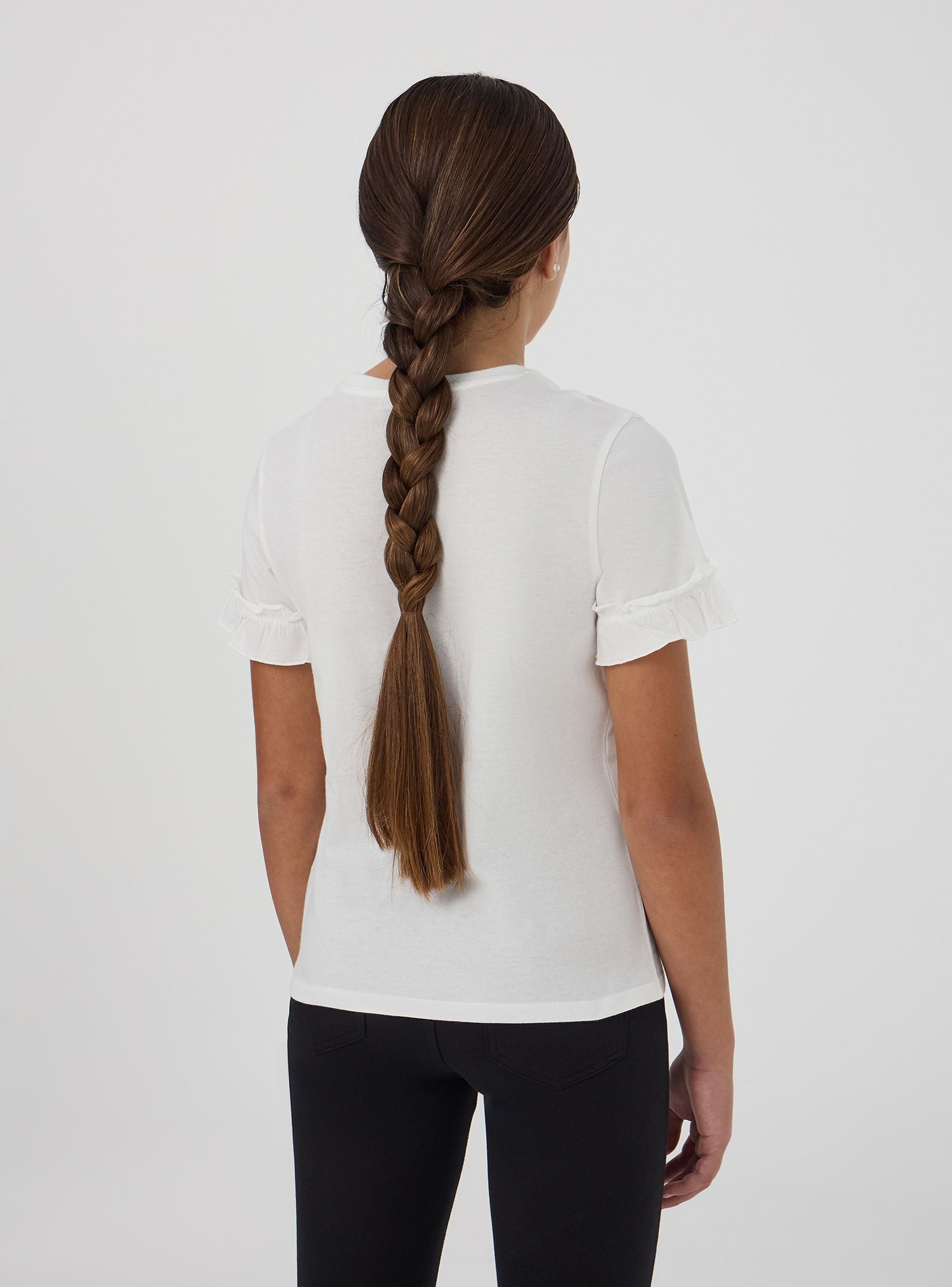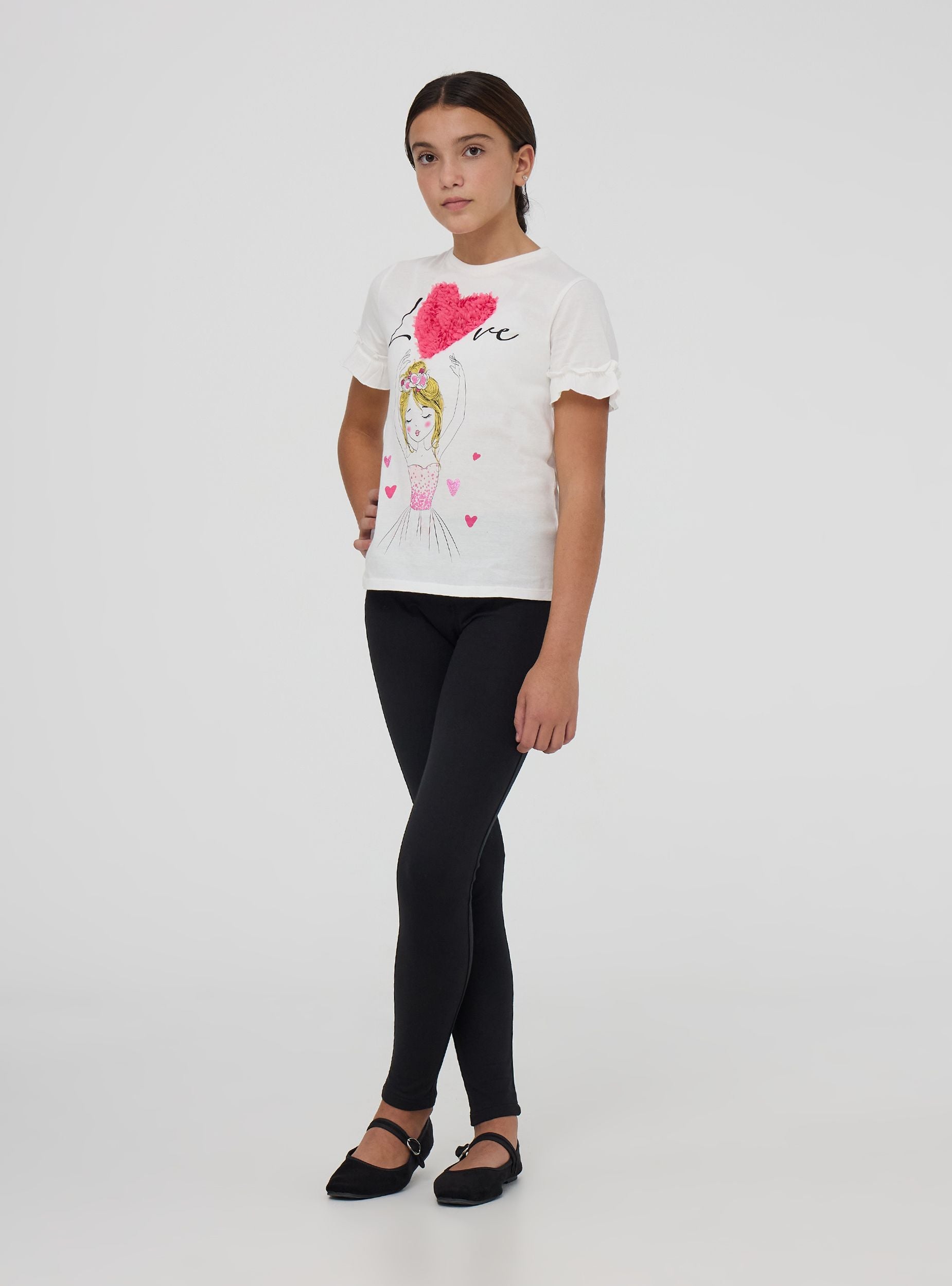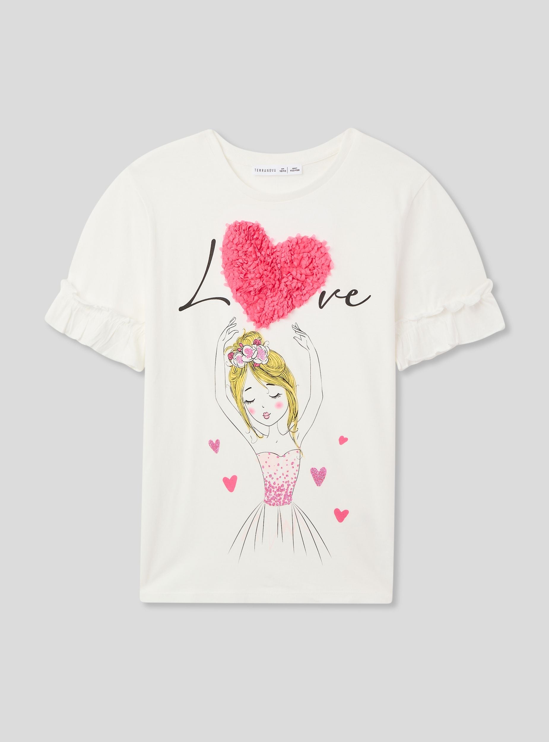 Maglietta da bambina ideale per un look dolce e giocoso, perfetta per una giornata di scuola o un'uscita con gli amici. Con maniche corte e girocollo, offre comodità e stile. La stampa è arricchita da applicazioni e un cuore con effetto petali che dona un tocco romantico e originale al design.Dettagli