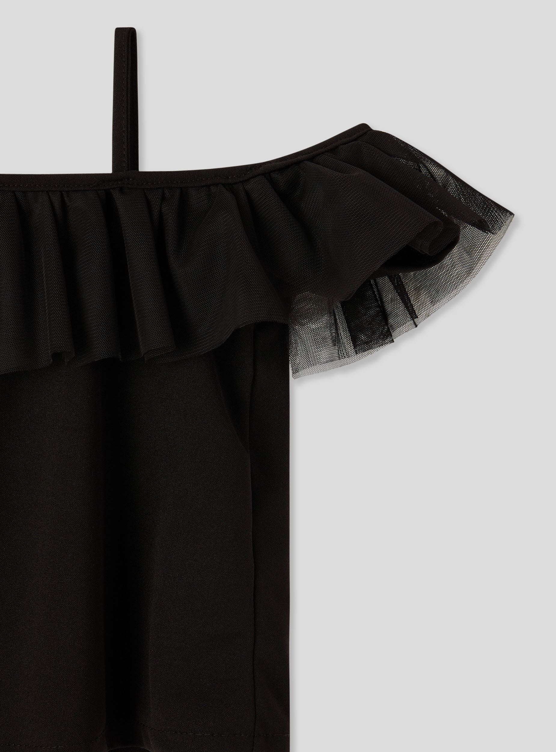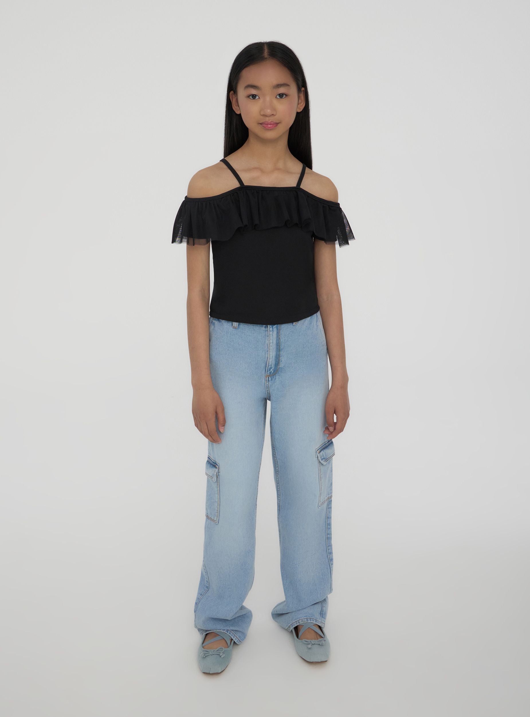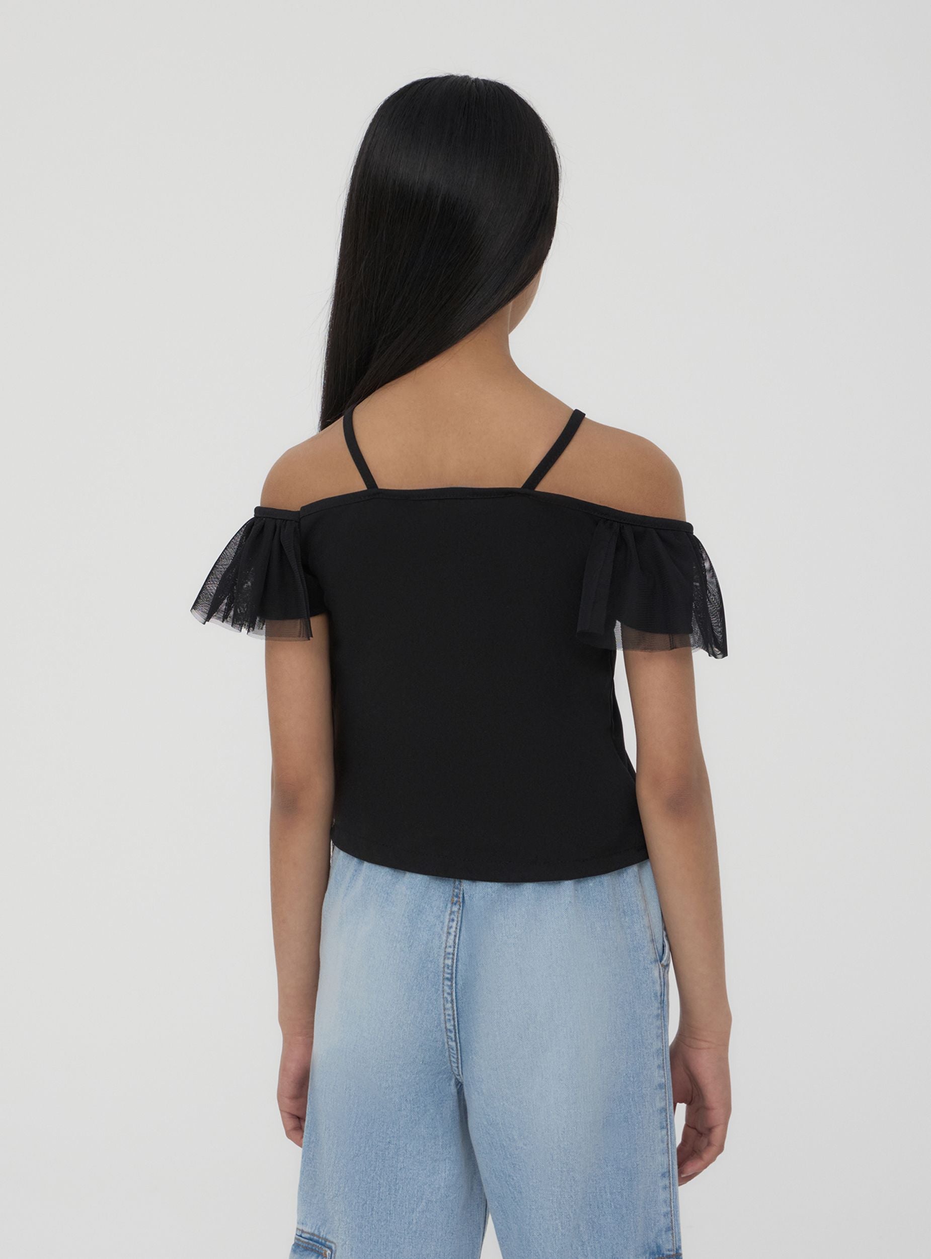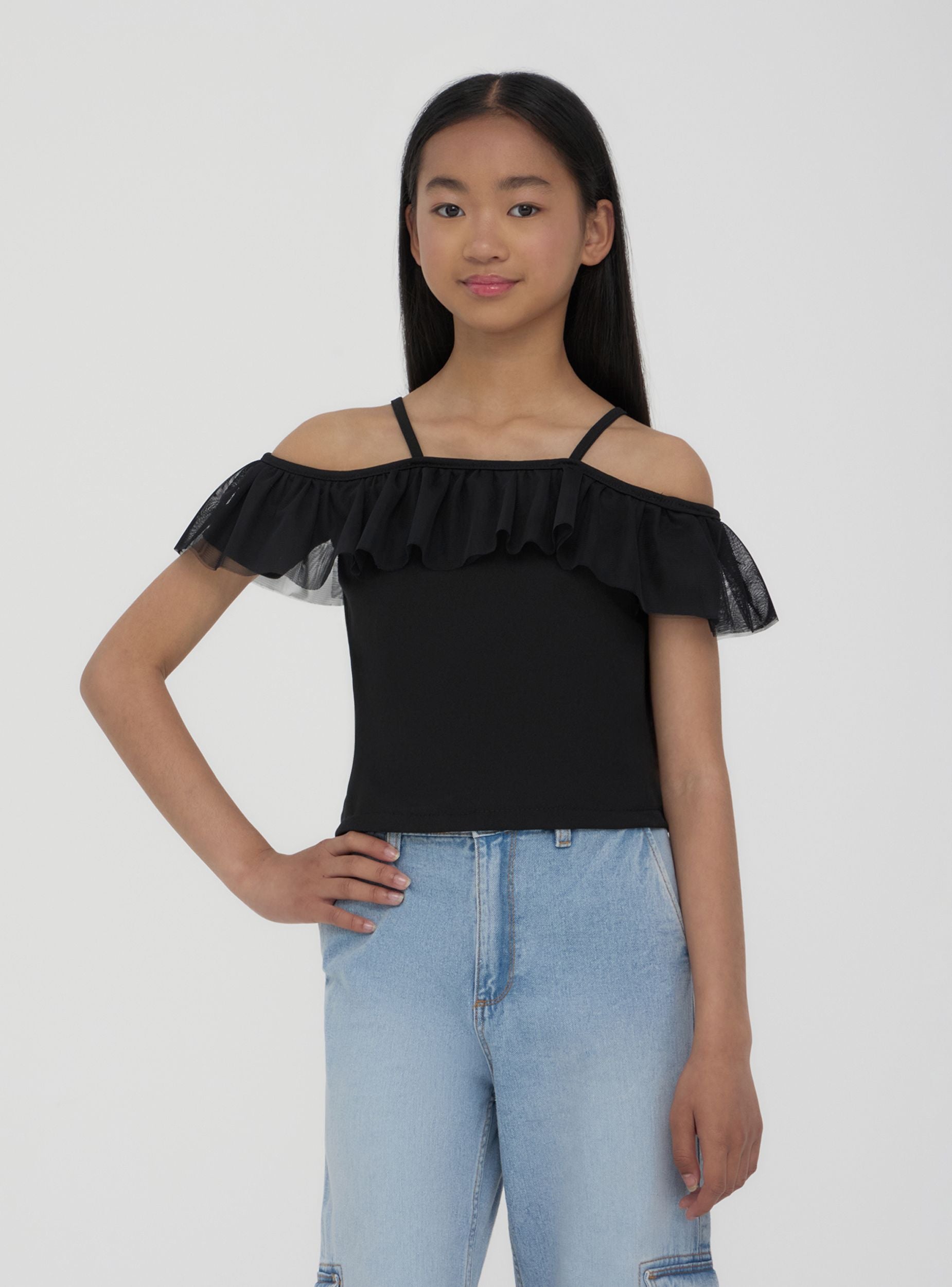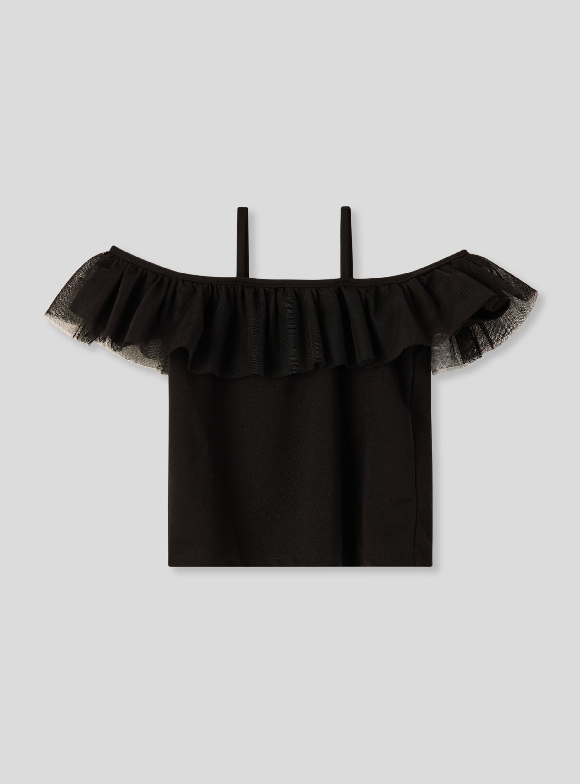 Top da bambina a tinta unita con spalle scoperte, caratterizzato da sottili spalline e ampia balza in tulle che dona un tocco romantico e moderno. Ideale per look estivi, si abbina facilmente a gonne o pantaloncini per outfit freschi e versatili. Vestibilità regolare, design leggero e raffinato, perfetto per aggiungere un dettaglio speciale ai look quotidiani.Dettagli