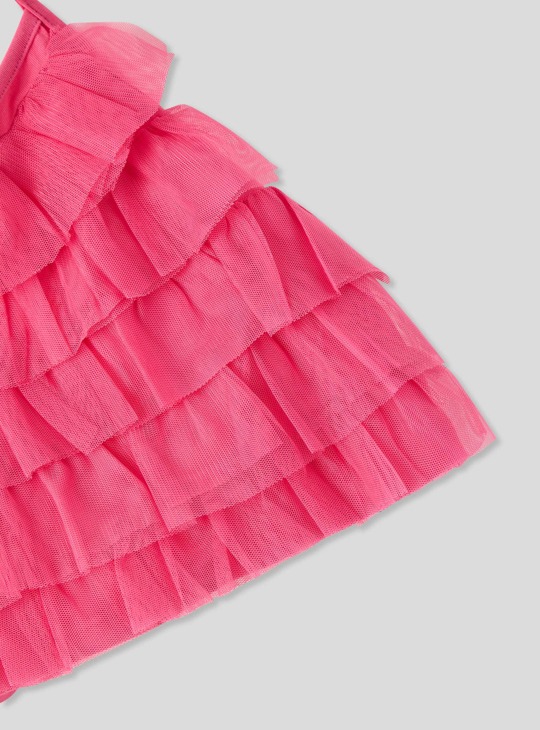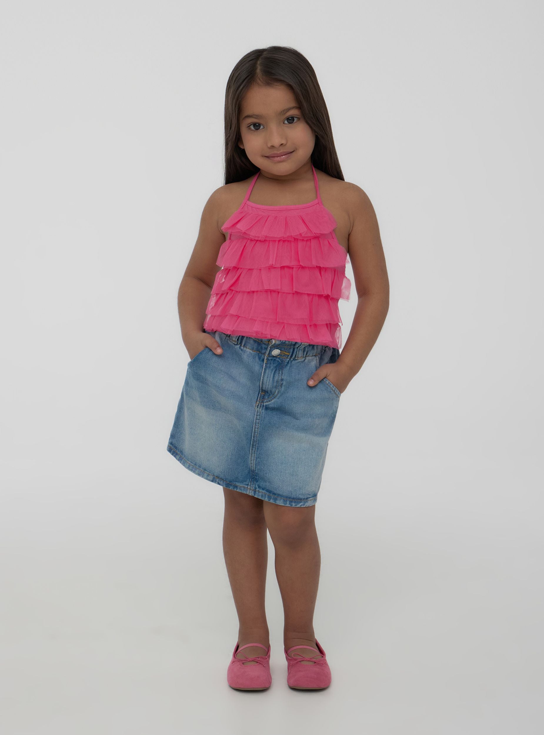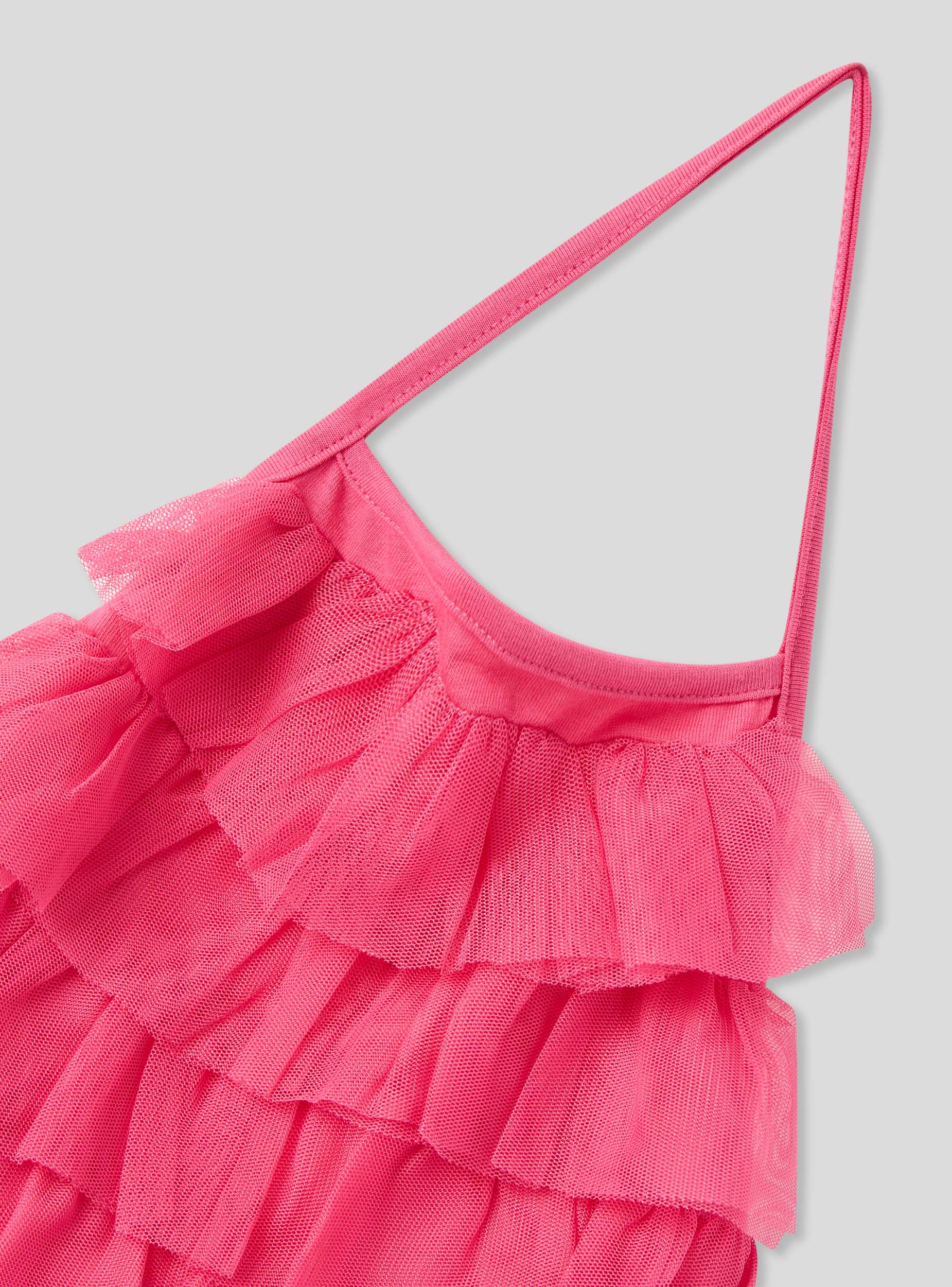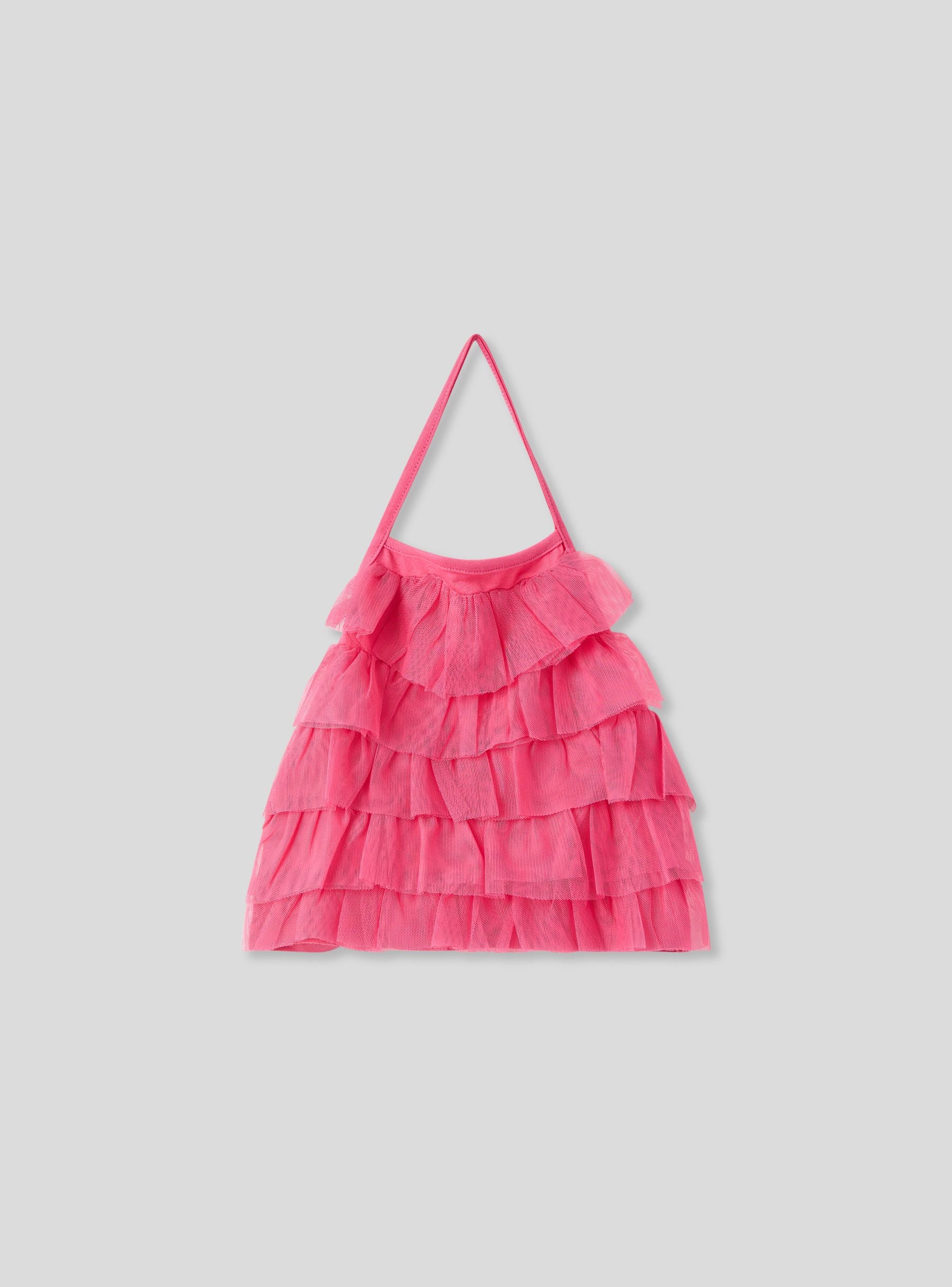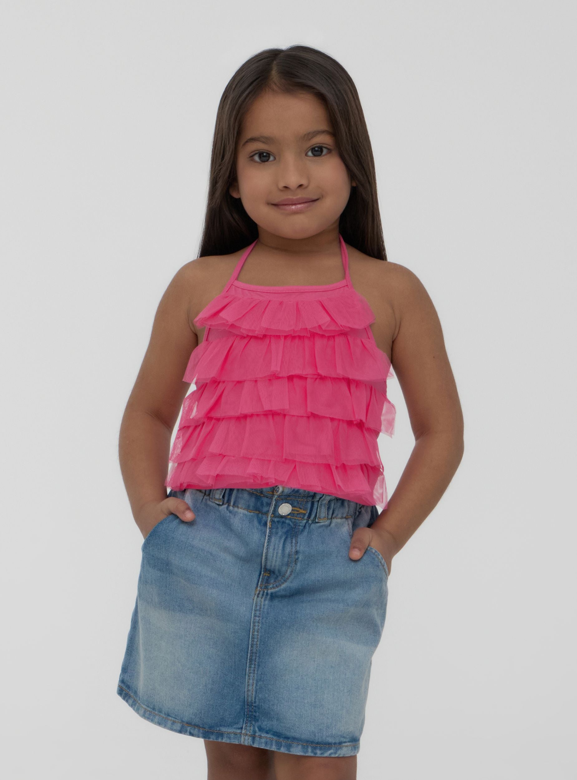 Top crop da bimba dal design elegante e giocoso, caratterizzata da una texture in tulle e romantiche balze che aggiungono volume e movimento. Il modello a tinta unita si abbina perfettamente a gonne svolazzanti o pantaloncini per un look raffinato e sbarazzino. Ideale per occasioni speciali, feste o semplicemente per aggiungere un tocco di fantasia agli outfit quotidiani.
