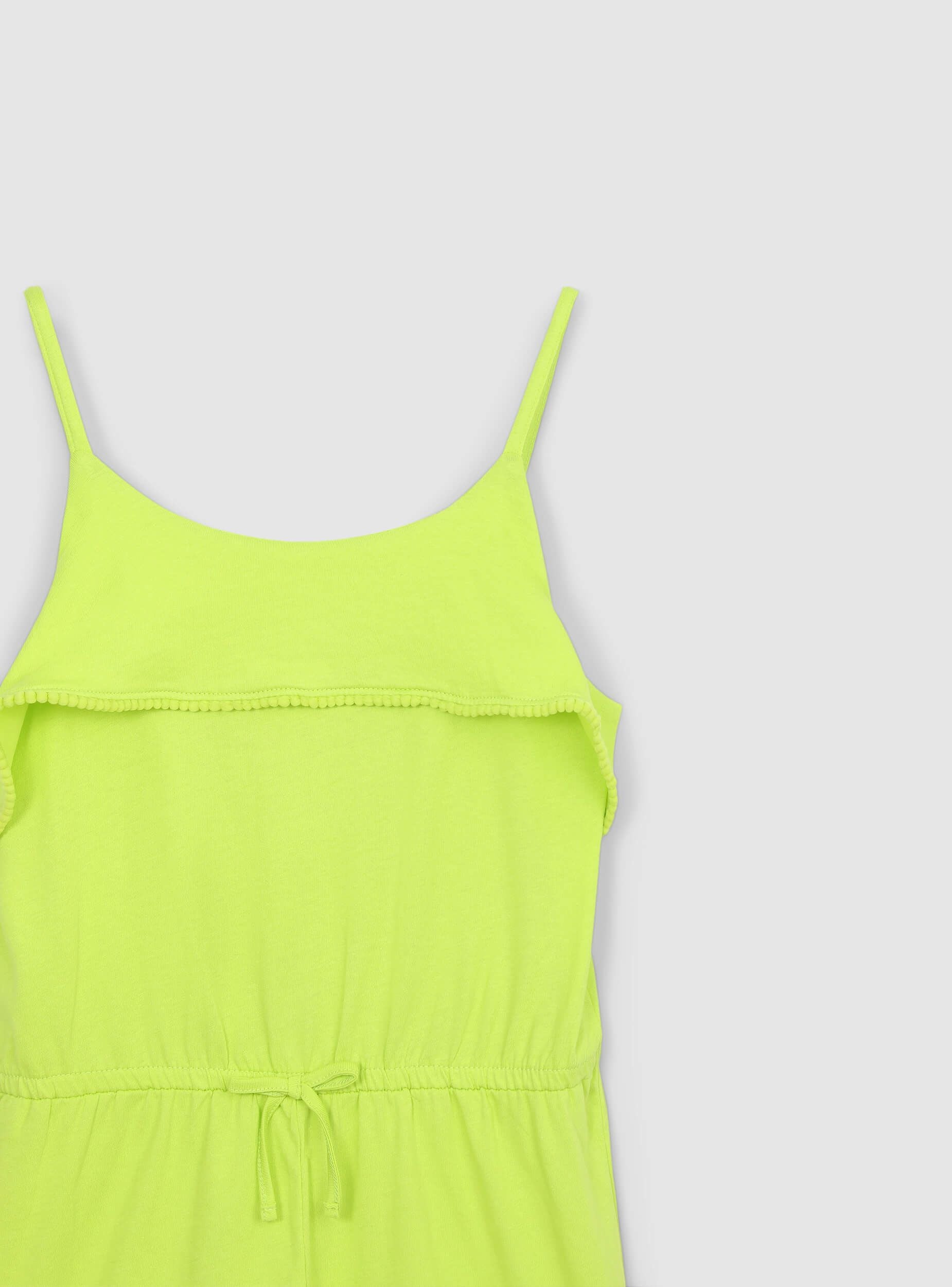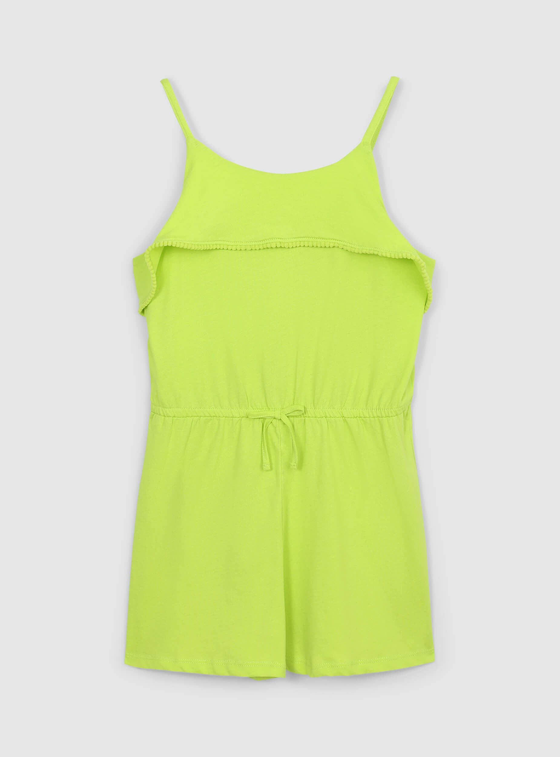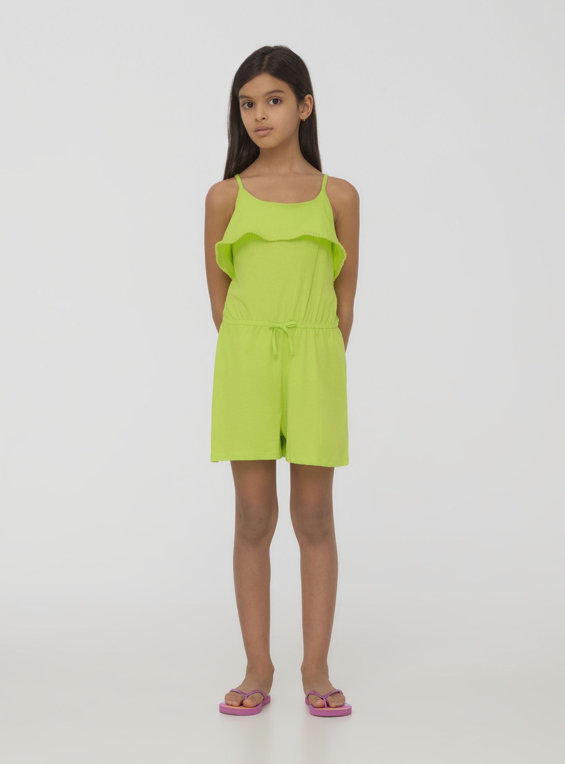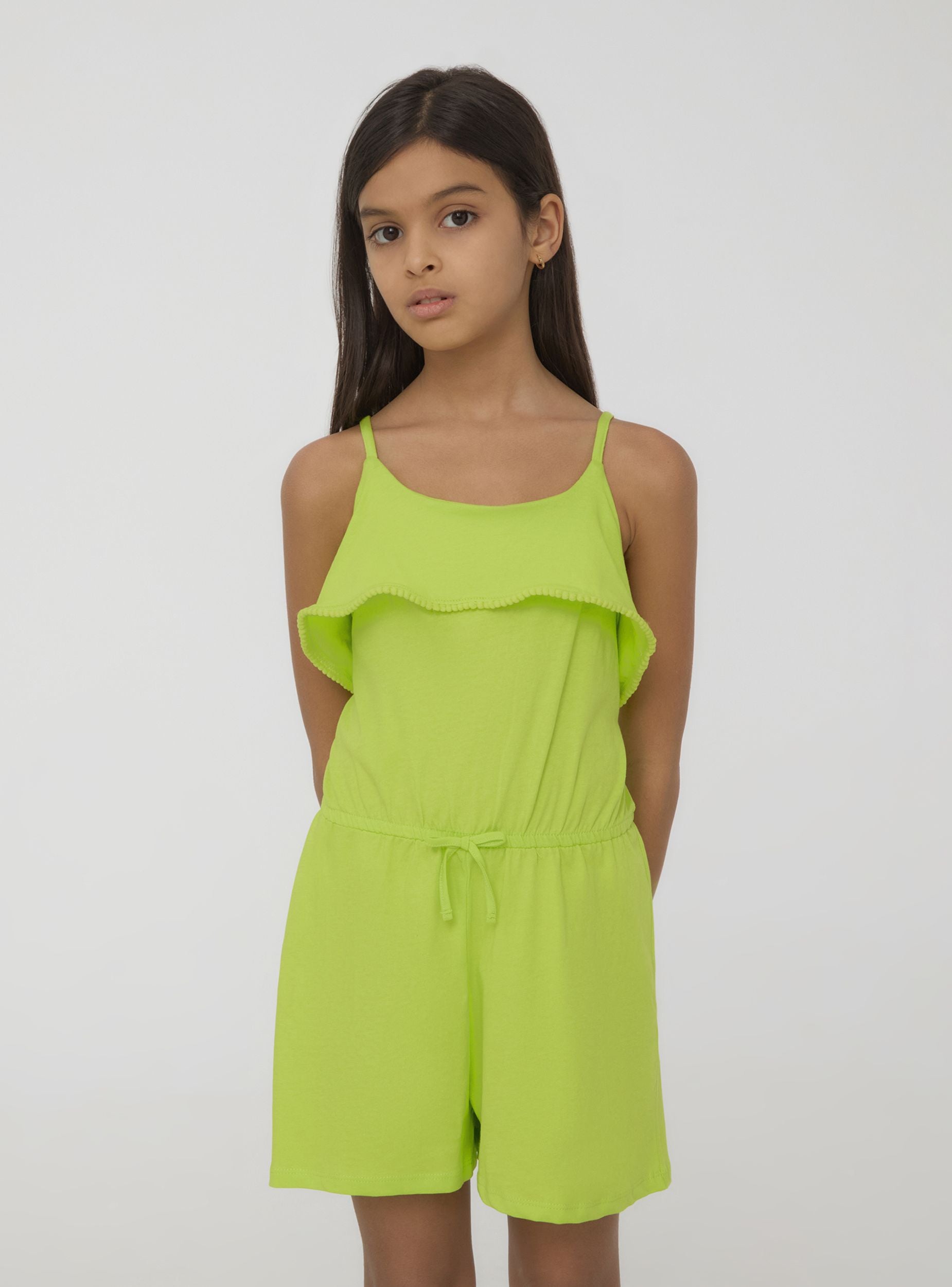 Tuta da bambina a tinta unita, ideale per le giornate primaverili ed estive. Presenta spalline sottili per un look fresco e confortevole. Il modello in jersey di cotone garantisce morbidezza e traspirabilità. Il dettaglio della balza decorativa sul busto aggiunge un tocco di femminilità, mentre i pompon lungo i bordi conferiscono un elemento giocoso. Perfetta per abbinamenti casual.