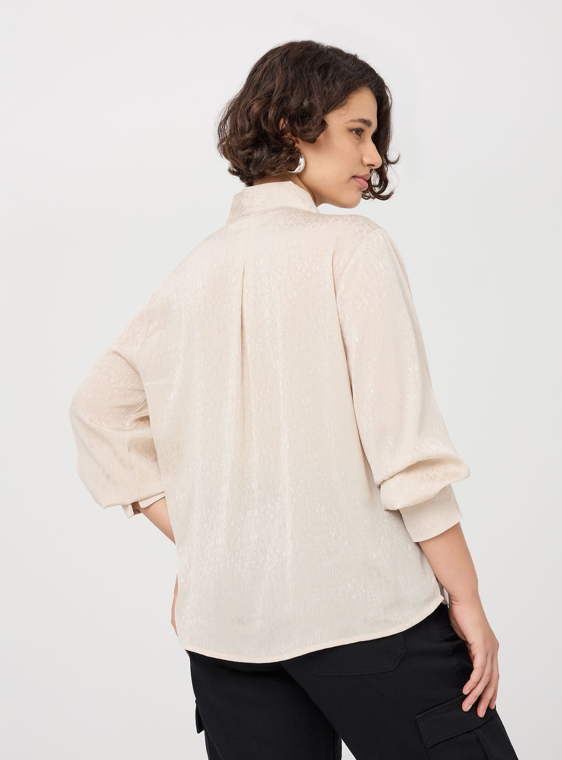 Blusa da donna con un delicato motivo damascato. Il design avvolgente, senza bottoni, offre una vestibilità comoda ma raffinata, ideale per un look chic e sofisticato. Le maniche lunghe con polsini ampi aggiungono un tocco di classe. Perfetta per occasioni formali e incontri di lavoro, questa blusa è un must-have per ogni guardaroba di stile.
