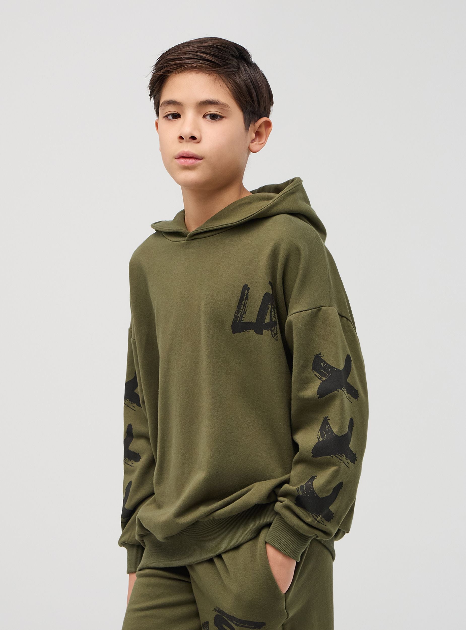 Felpa da bambino con cappuccio, caratterizzata dalla scritta "Los Angeles" stampata sul retro e "LA" sul davanti. Le maniche presentano un motivo grafico ripetuto lungo tutta la loro lunghezza, aggiungendo un tocco moderno e dinamico al capo.