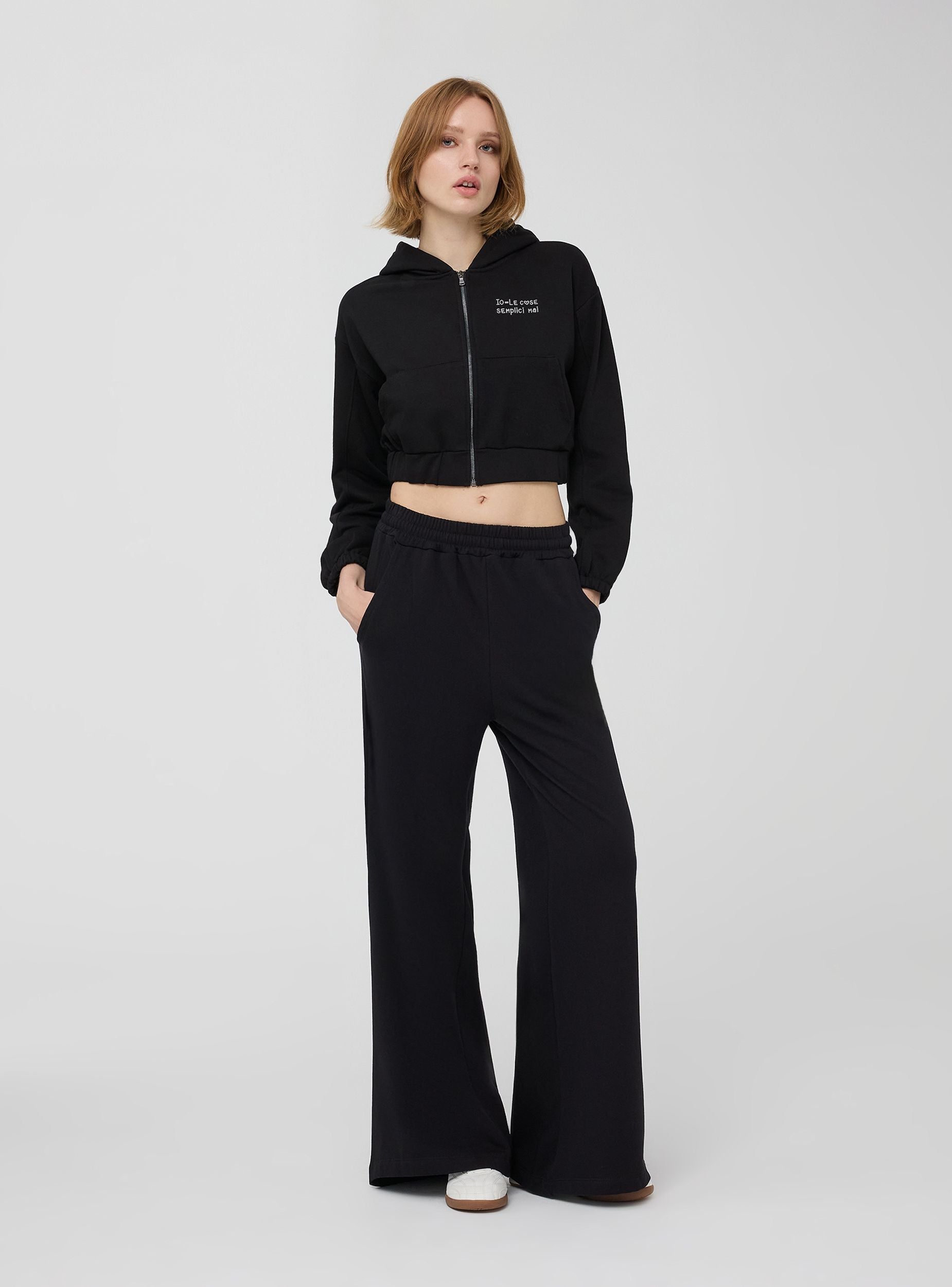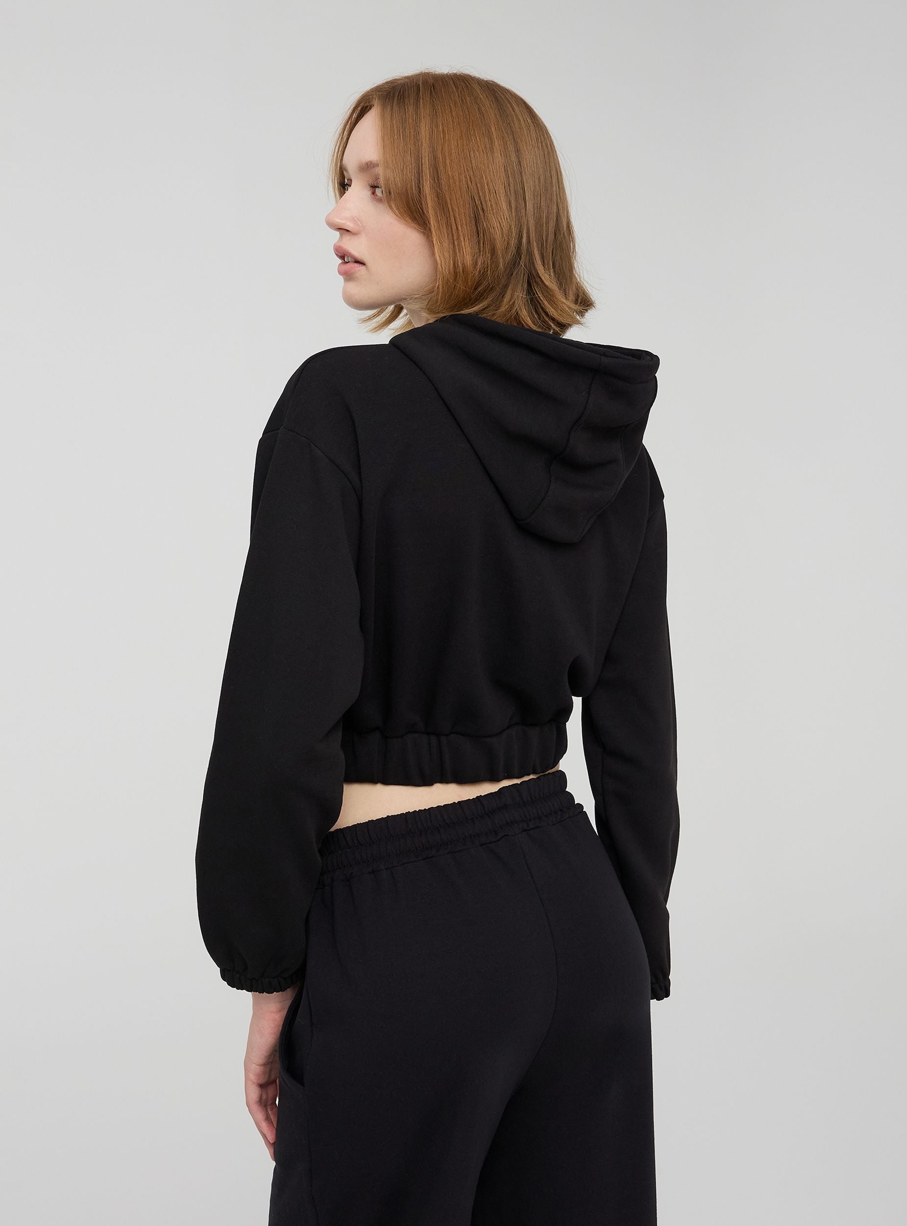 Felpa da donna, modello con cappuccio e chiusura frontale con zip. Presenta una scritta laterale. Vestibilità crop.
