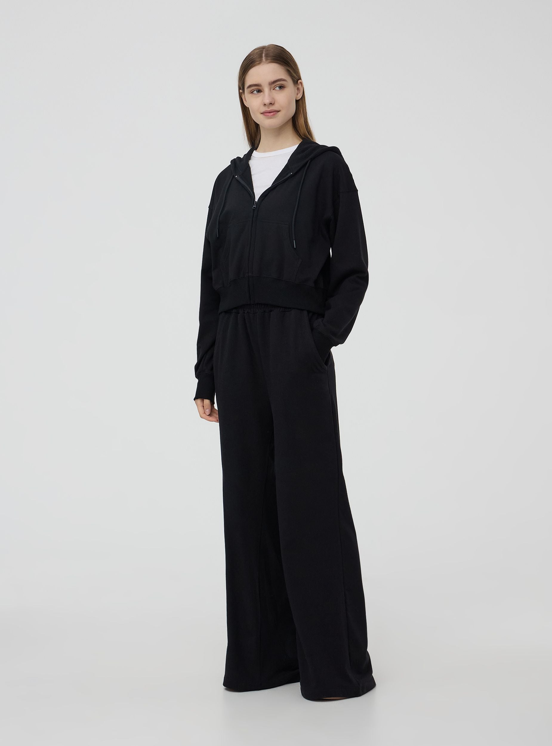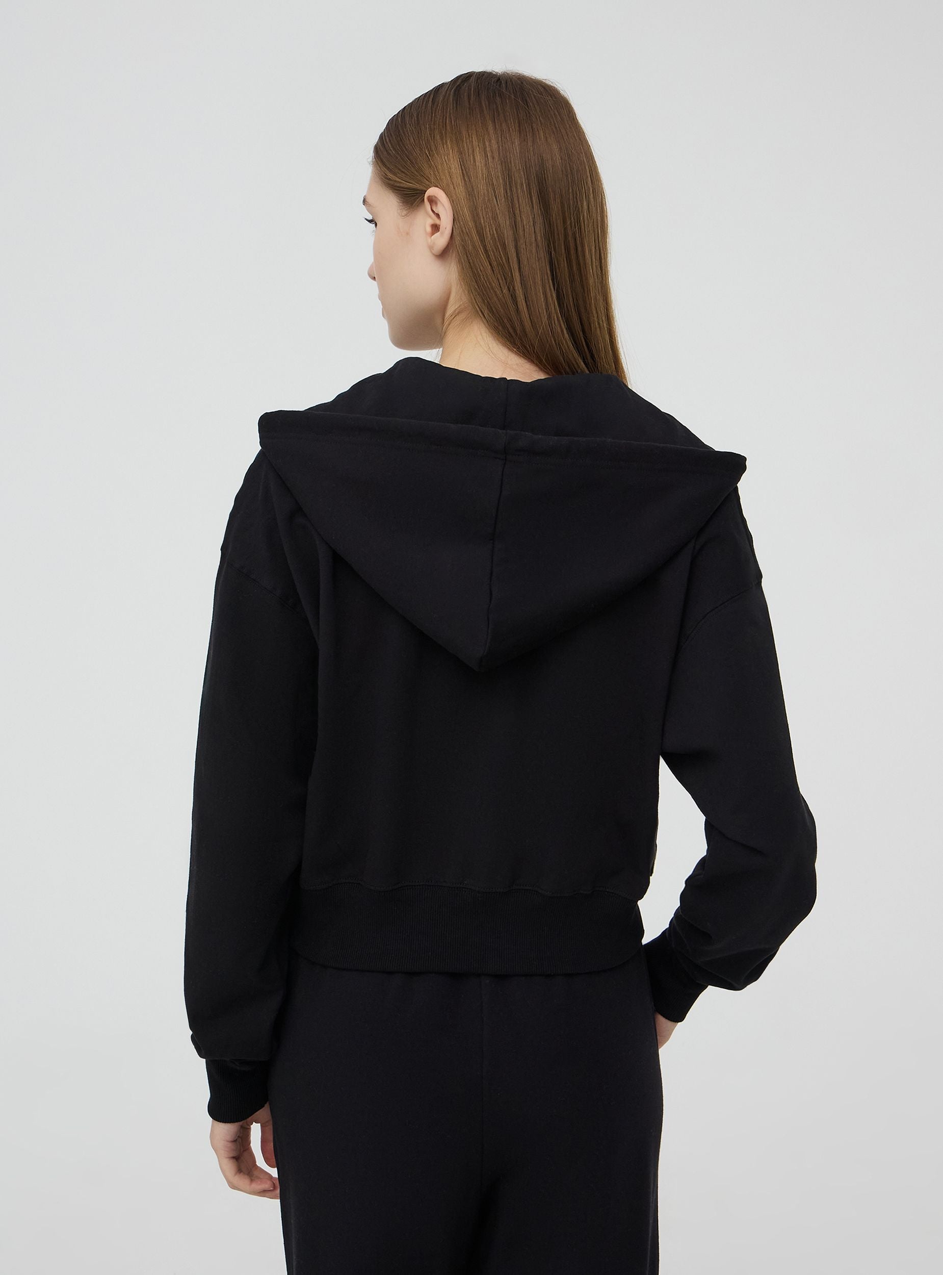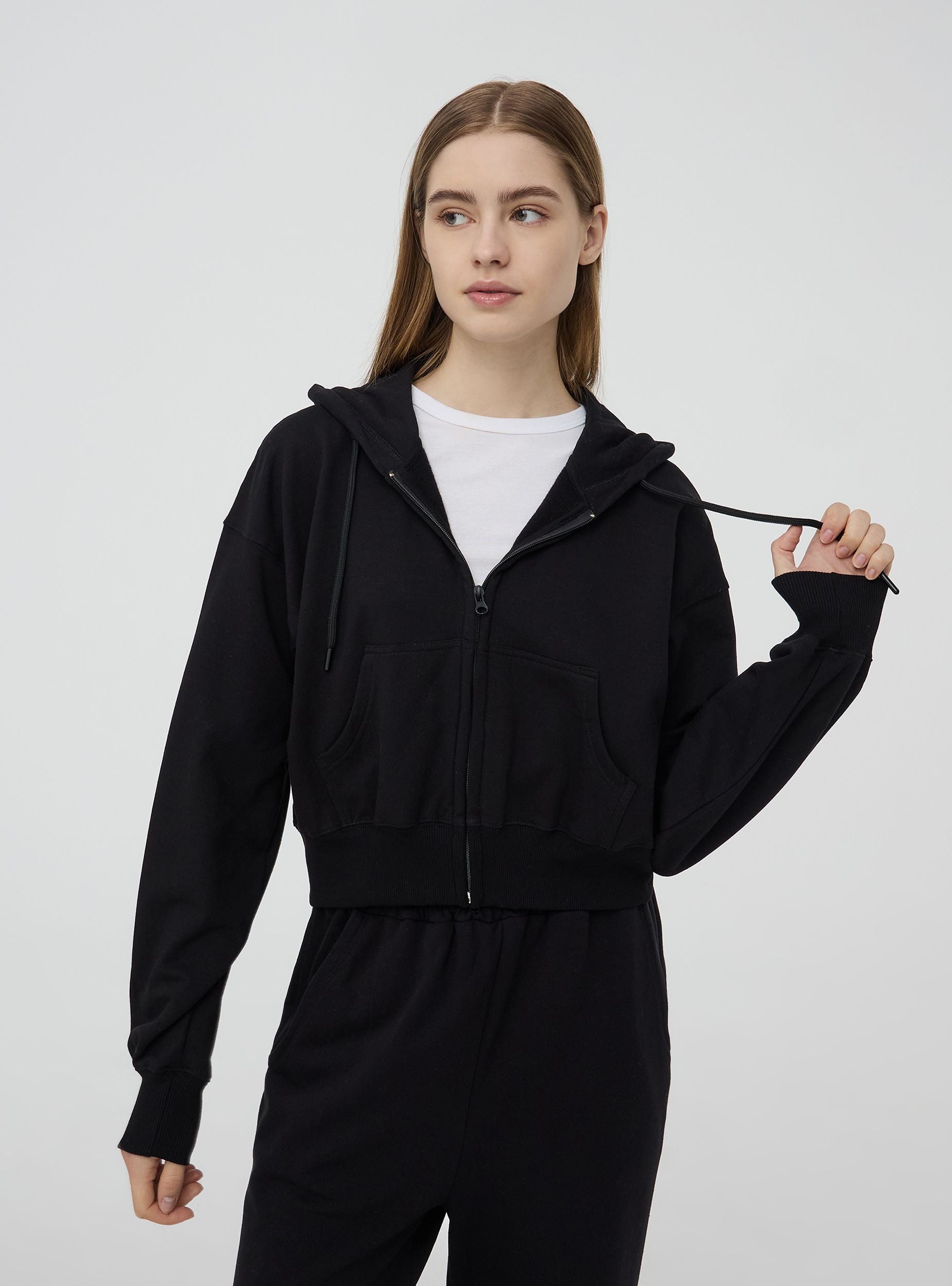 Felpa da donna dal taglio crop e vestibilità over. Modello dotato di cappuccio con coulisse e chiusura frontale con zip. Presenta tasche frontali a marsupio. Il tessuto a tinta unita la rende un capo basic indispensabile da avere nell'armadio.