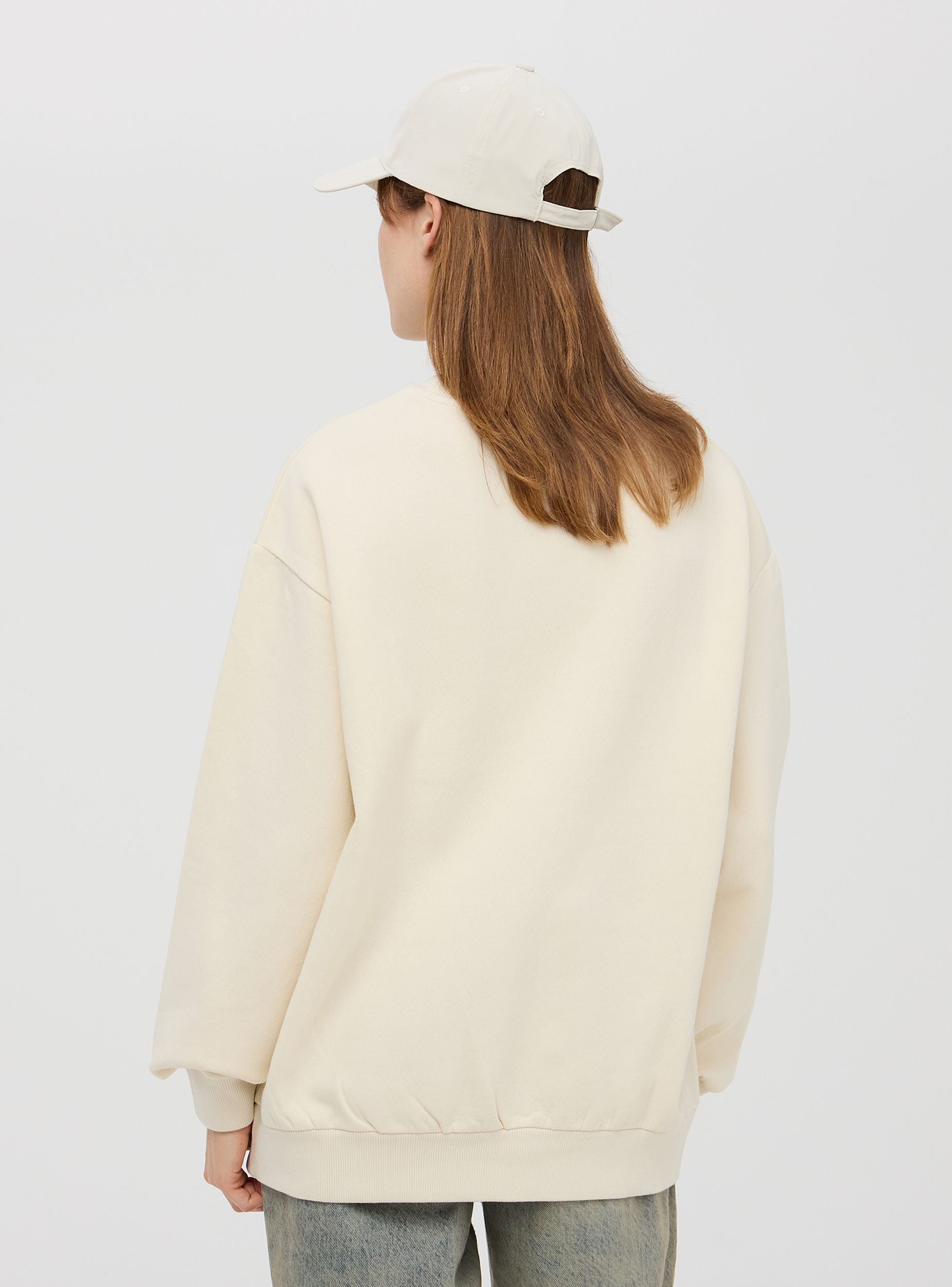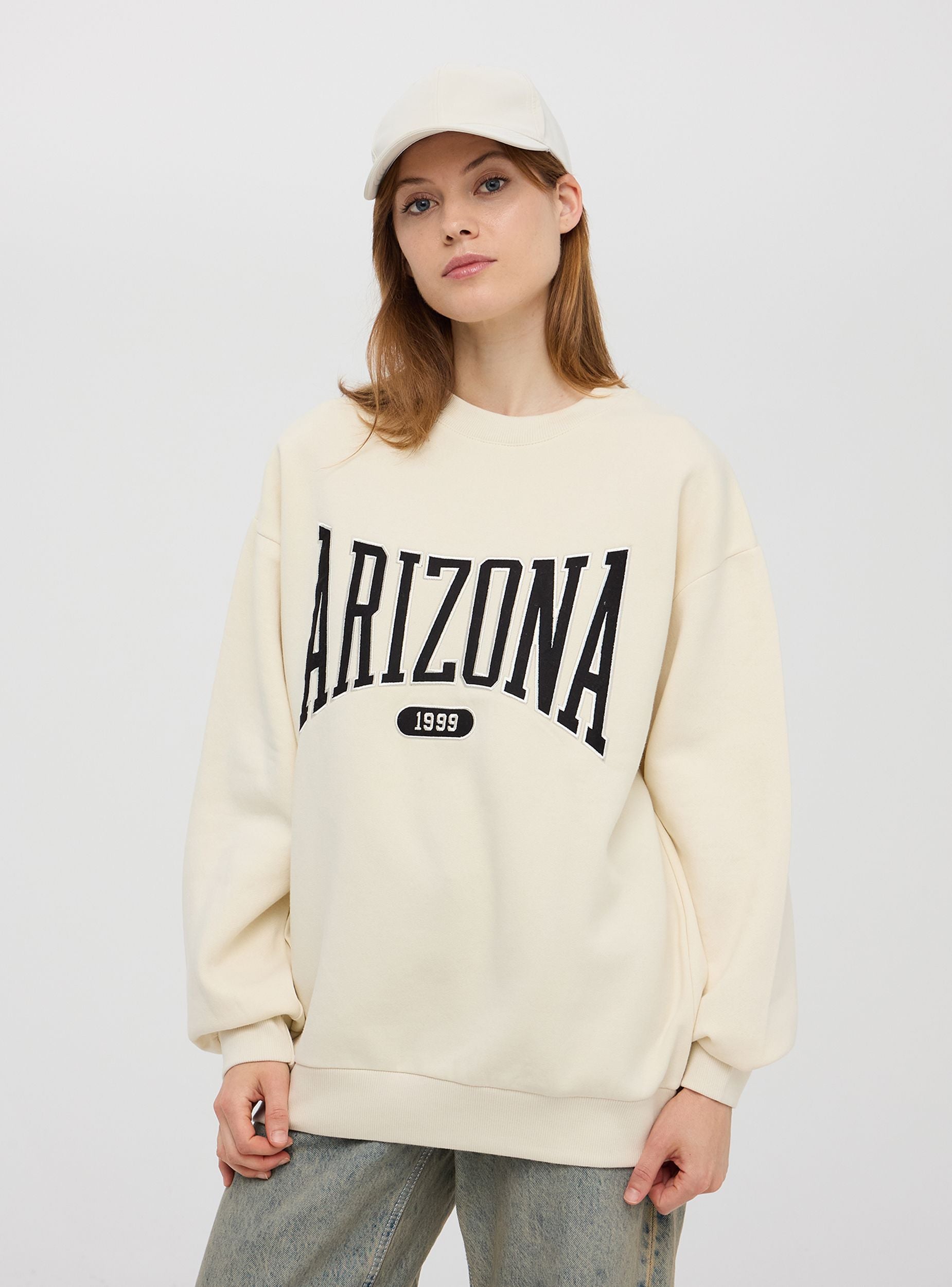 Felpa da donna, modello chiuso senza cappuccio, in tessuto pesante a tinta unita con patch ricamati in stile college. Perfetta per un outfit casual e comodo. Vestibilità ampia.