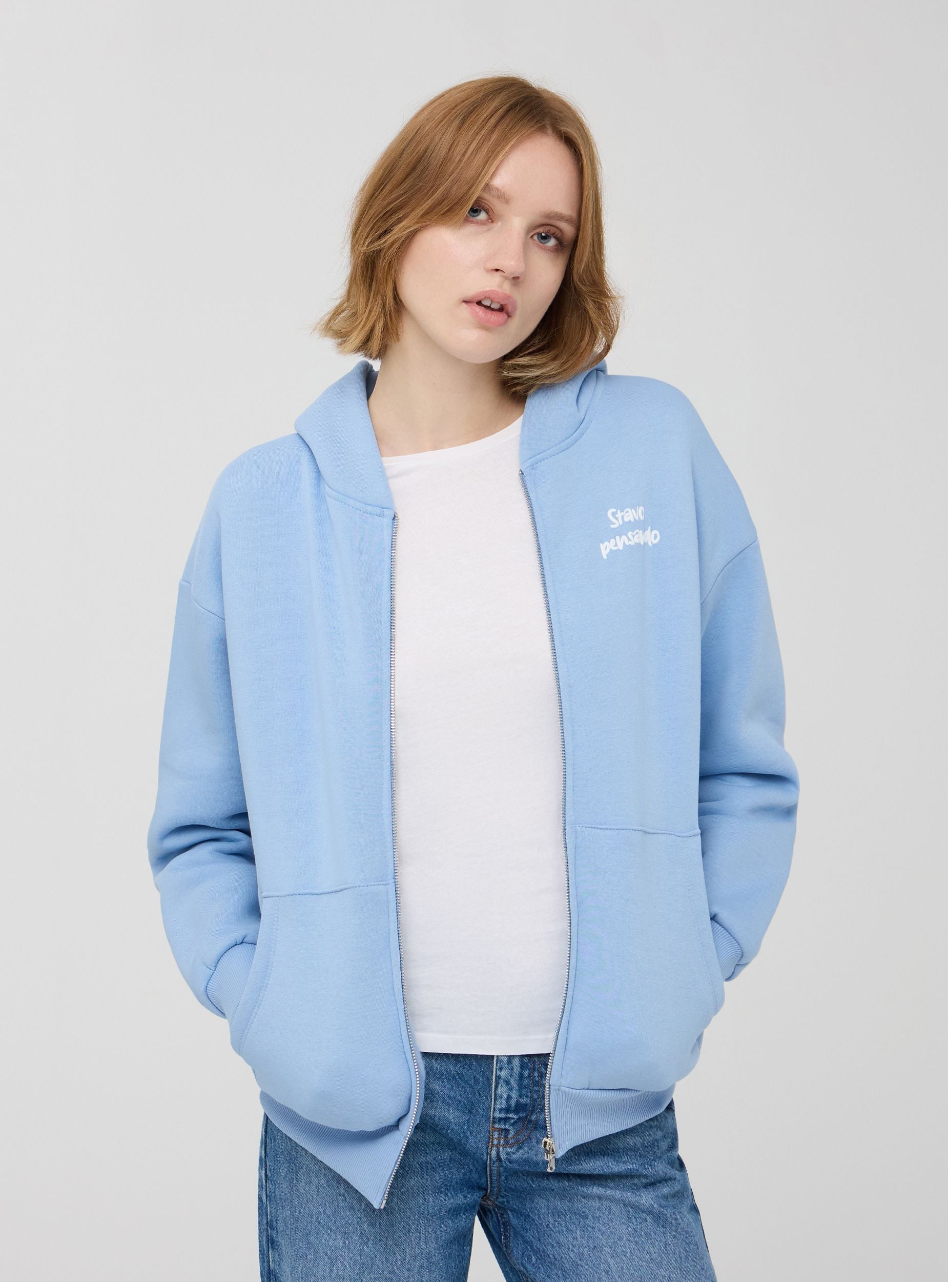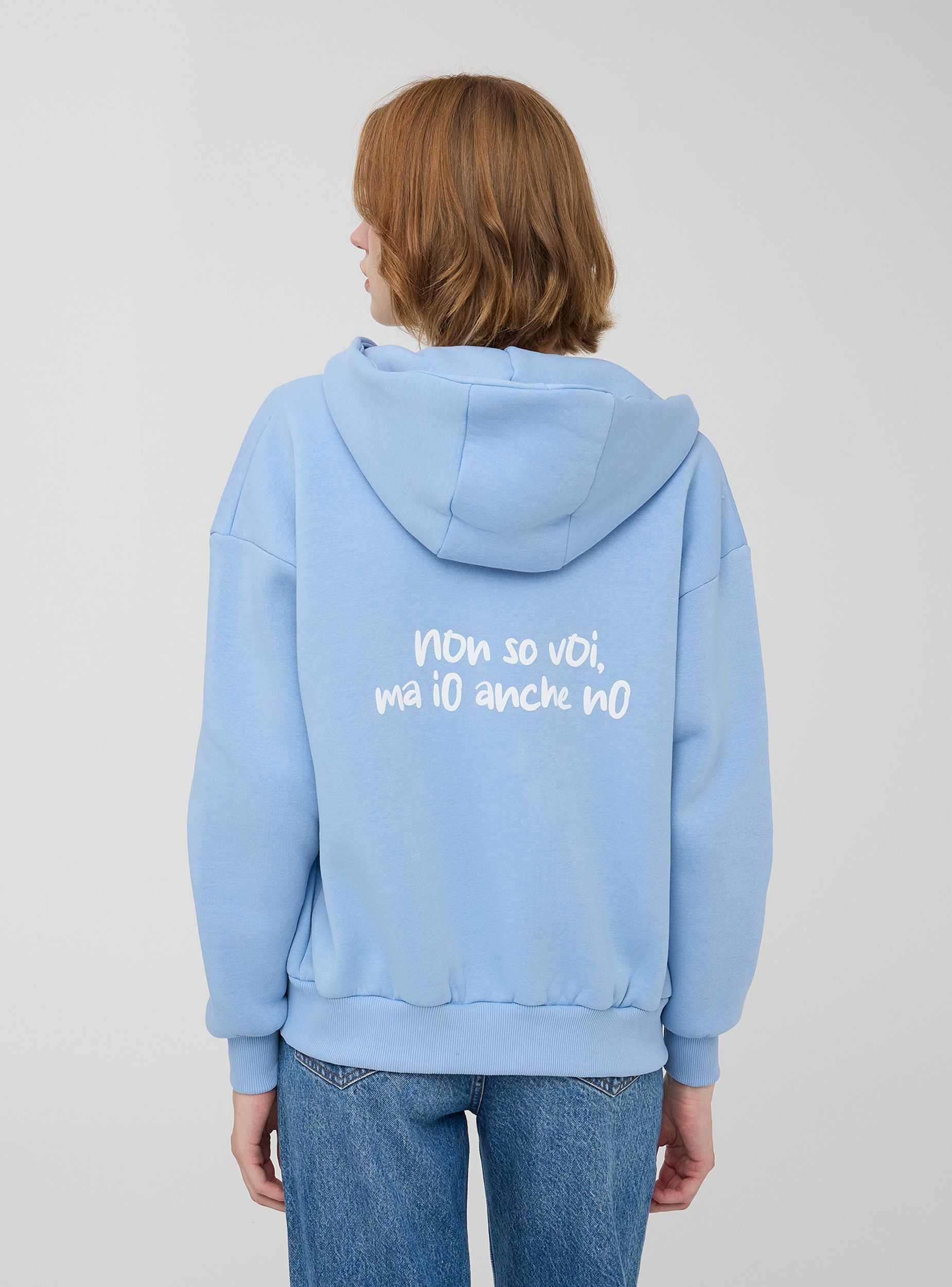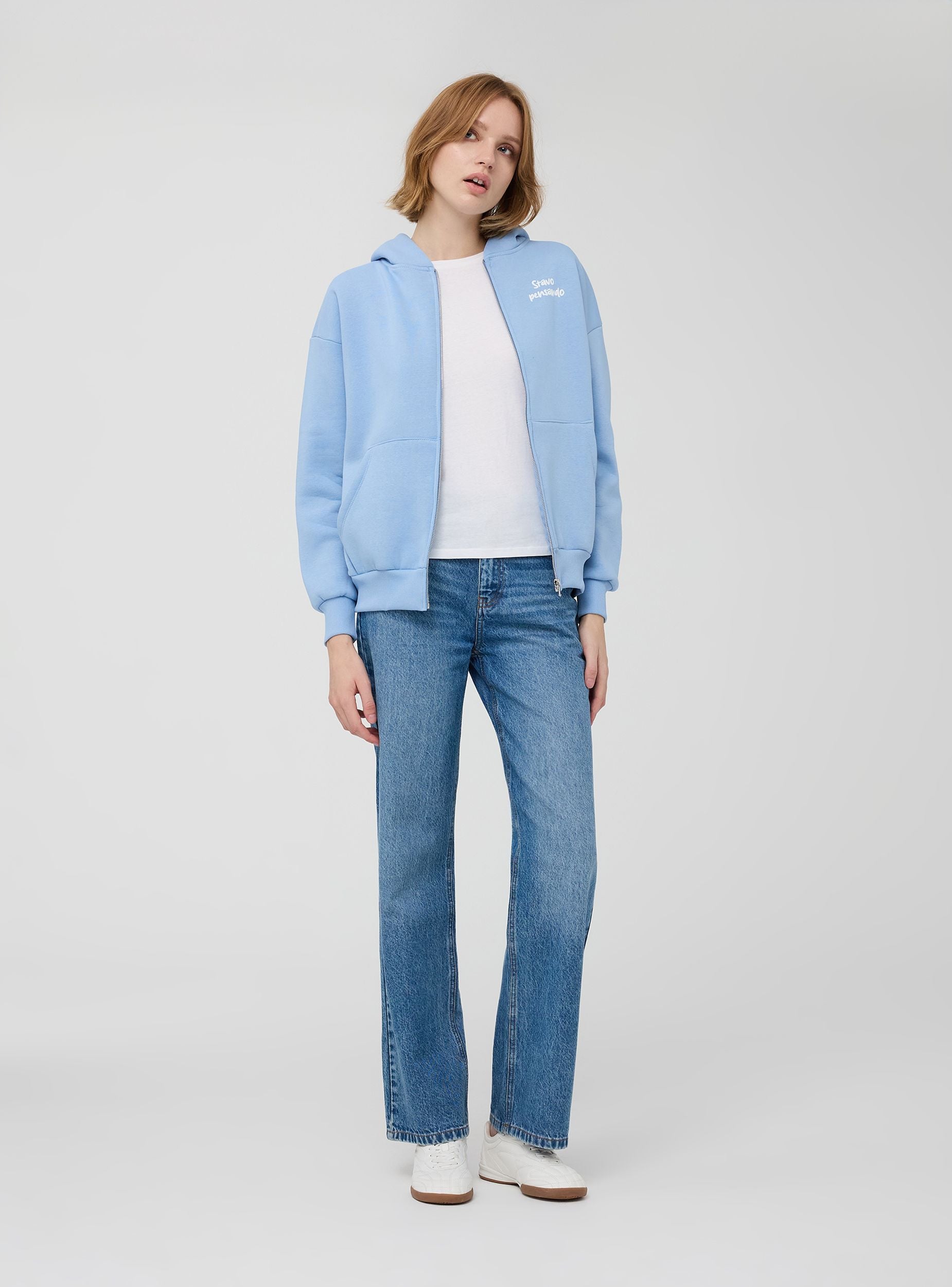 Felpa da donna con cappuccio, chiusura frontale con zip e scritta. Vestibilità over. Ideale per outfit casual e comodi.