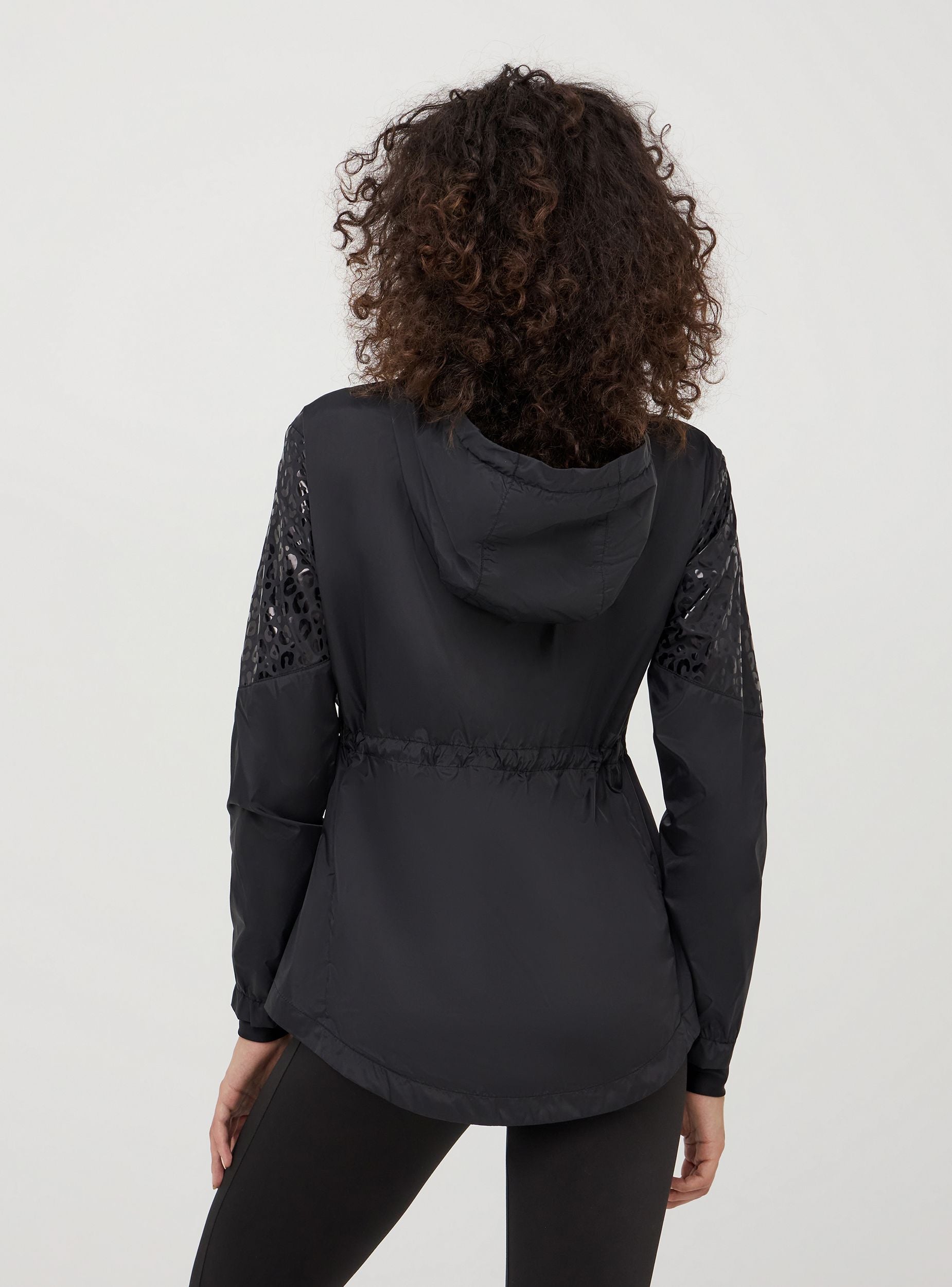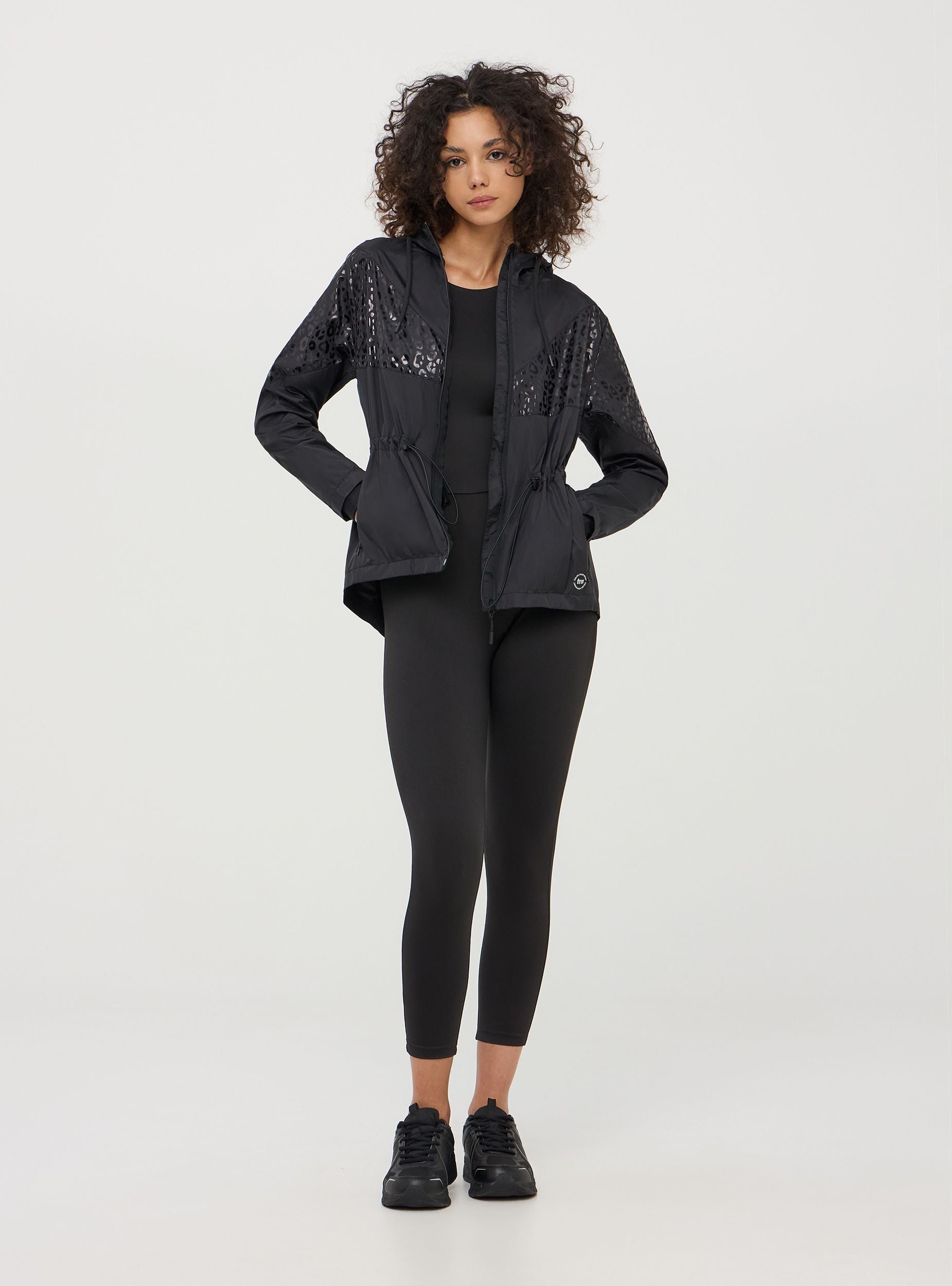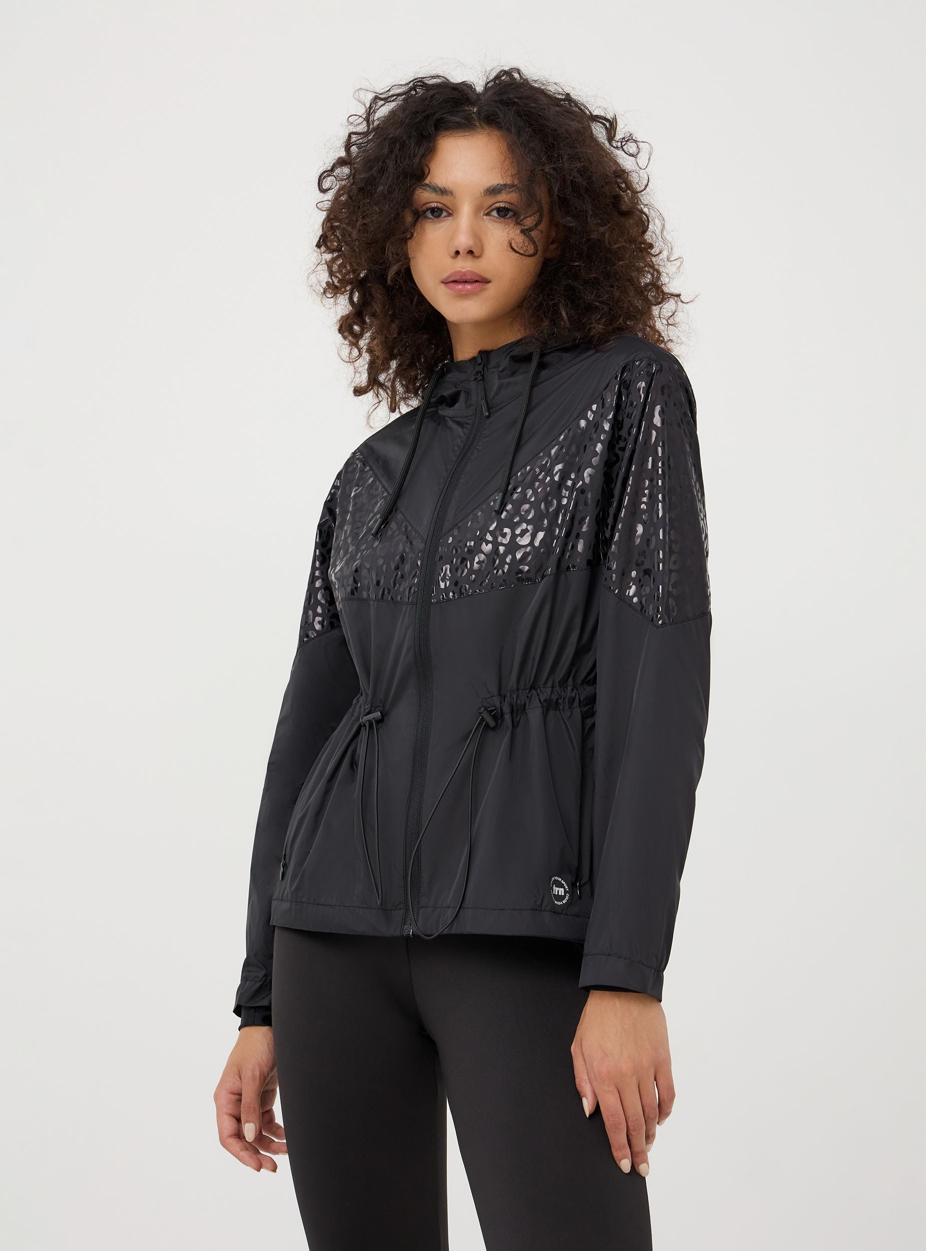 Giacca antivento da donna in nylon con dettaglio maculato tono su tono. Foderata internamente con tessuto in rete. Questo capo è progettato per proteggere dalle intemperie durante attività all'aperto come corsa, escursionismo e ciclismo, realizzato in materiali leggeri e resistenti all'acqua, la giacca è traspirante. Dispone di una chiusura a cerniera frontale, cappuccio regolabile con coulisse, e coulisse in vita. Tasche con zip per riporre piccoli oggetti. Polsini elasticizzati nelle maniche con foro per il pollice per una migliore vestibilità e per impedire l'ingresso del vento. Linea active. Vestibilità regular.