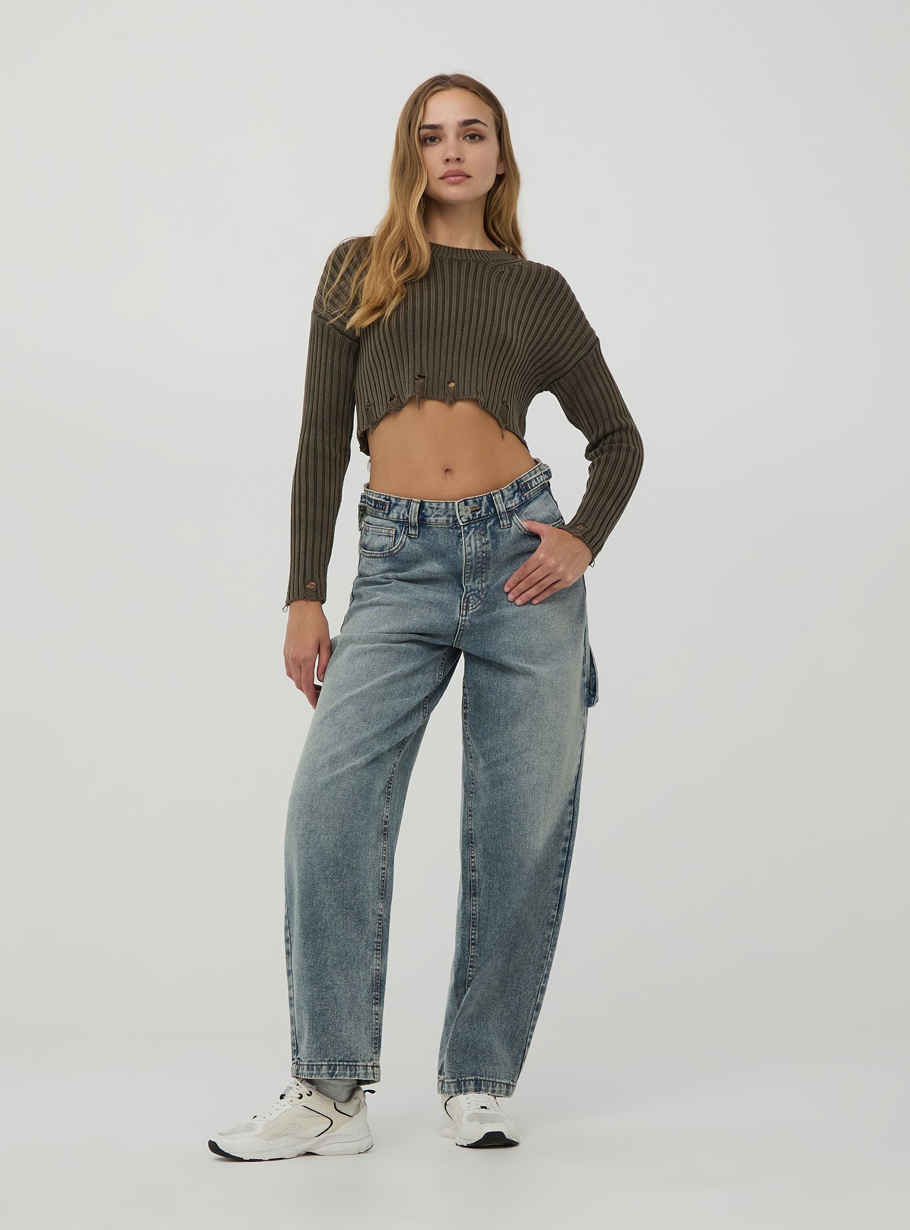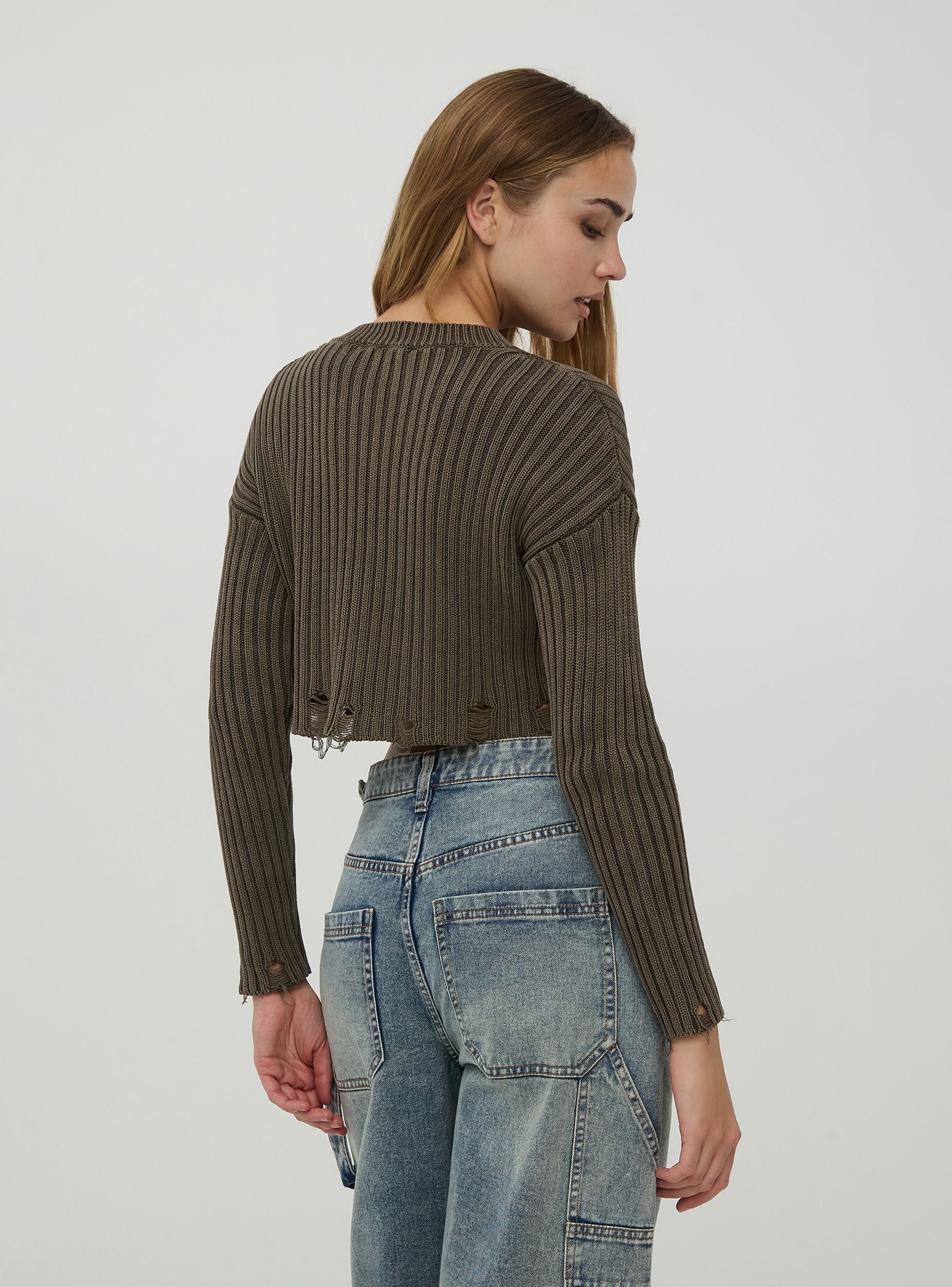 Maglia da donna a coste, caratterizzata da un effetto strappi per un look casual e grintoso. Il modello è dotato di girocollo e maniche lunghe, con una vestibilità crop che aggiunge un tocco moderno. Perfetta per essere abbinata a jeans o gonne a vita alta, questa maglia si distingue per il suo design originale e audace, ideale per chi desidera esprimere uno stile unico e disinvolto.