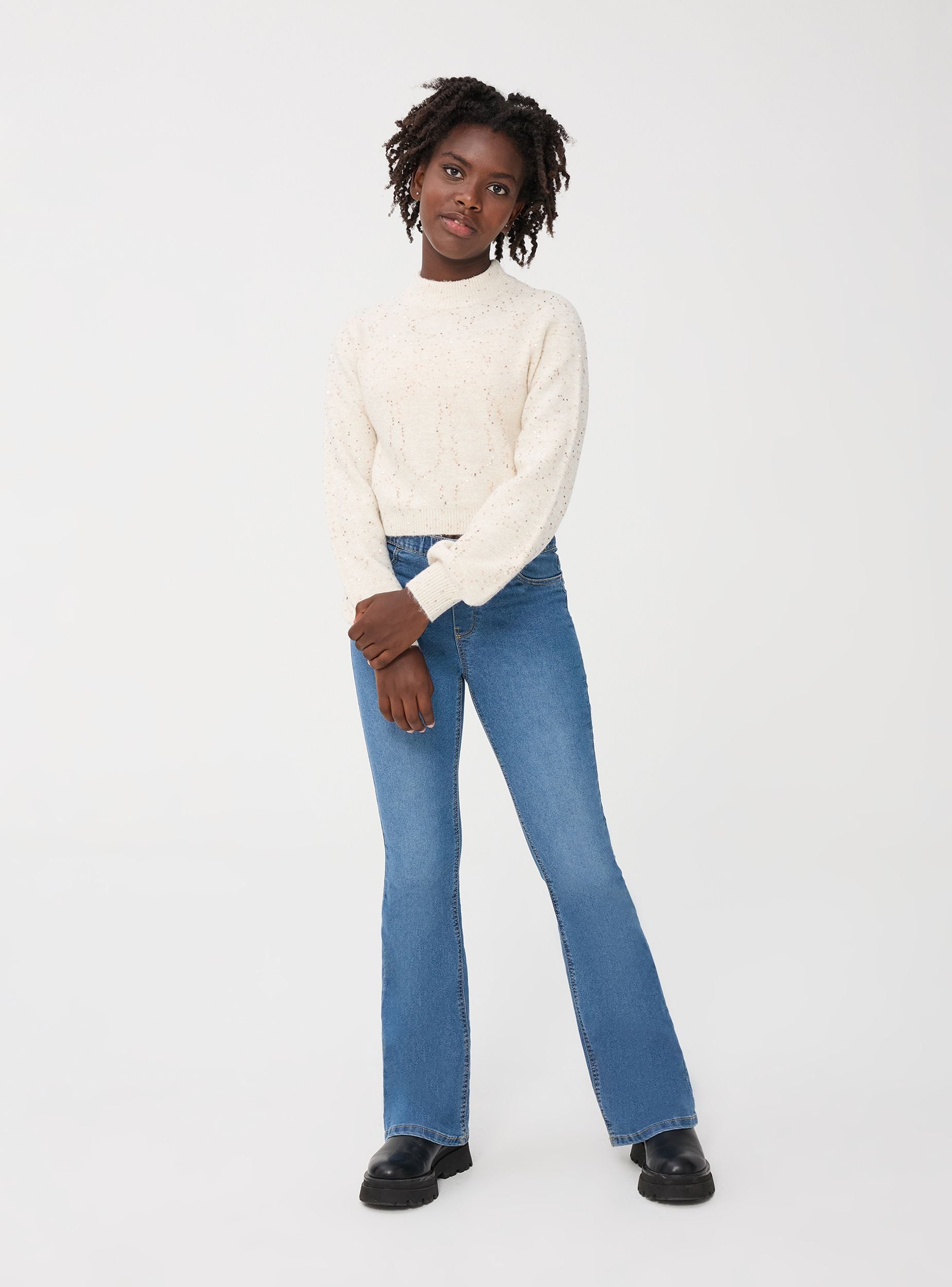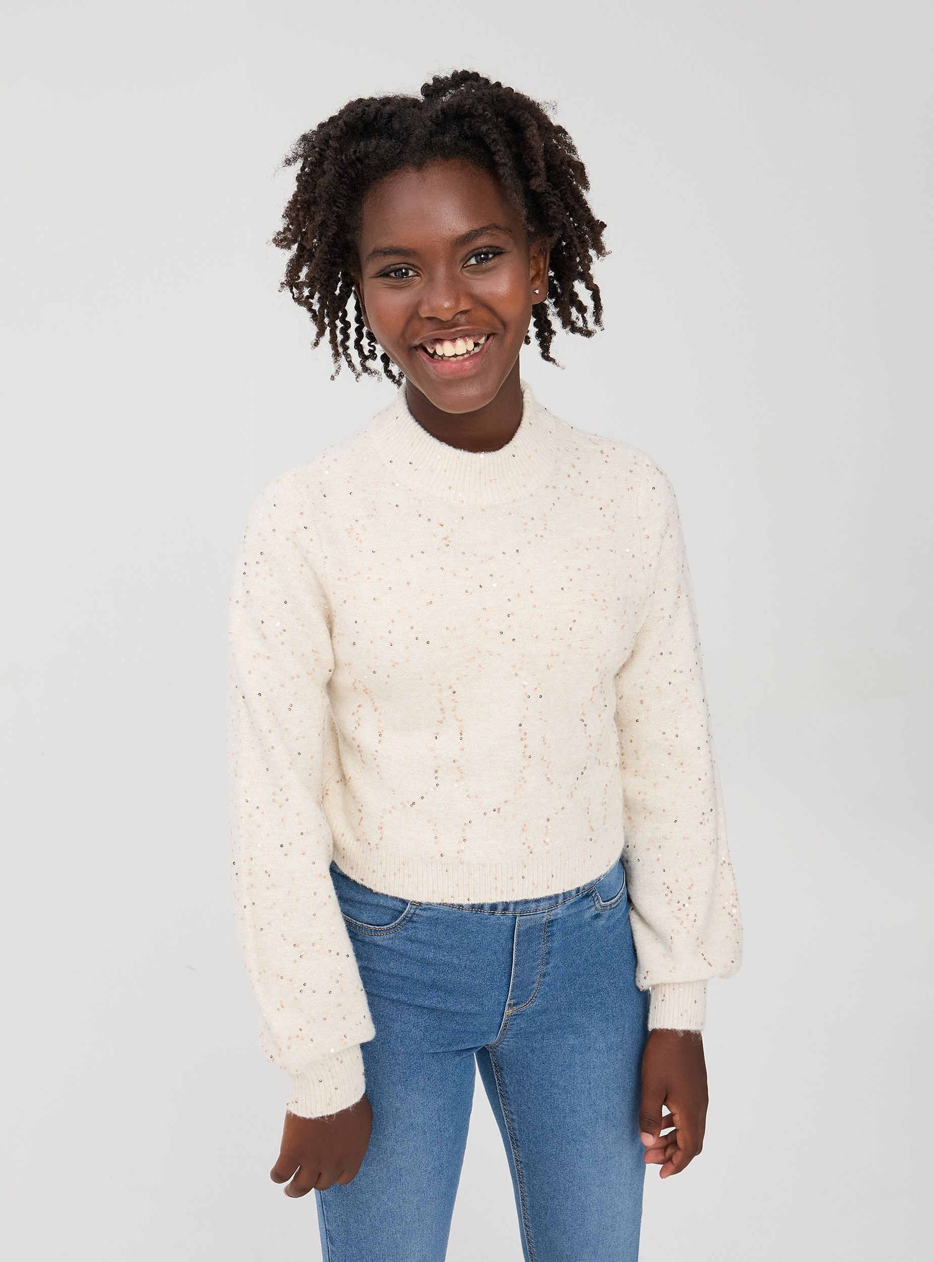 Maglia da bambina a maniche lunghe con collo alto, realizzata in tessuto a tinta unita impreziosito da paillettes che aggiungono un tocco di brillantezza. Questa maglia in materiale morbido e confortevole offre una vestibilità calda e avvolgente, perfetta per le giornate più fredde. Ideale per occasioni speciali come feste di compleanno o eventi familiari, questa maglia può essere abbinata a gonne eleganti o pantaloni chic per un look raffinato. È anche una scelta eccellente per le giornate casual comode ma alla moda. Un capo versatile che aggiunge un tocco di glamour a qualsiasi outfit. Vestibilità crop.