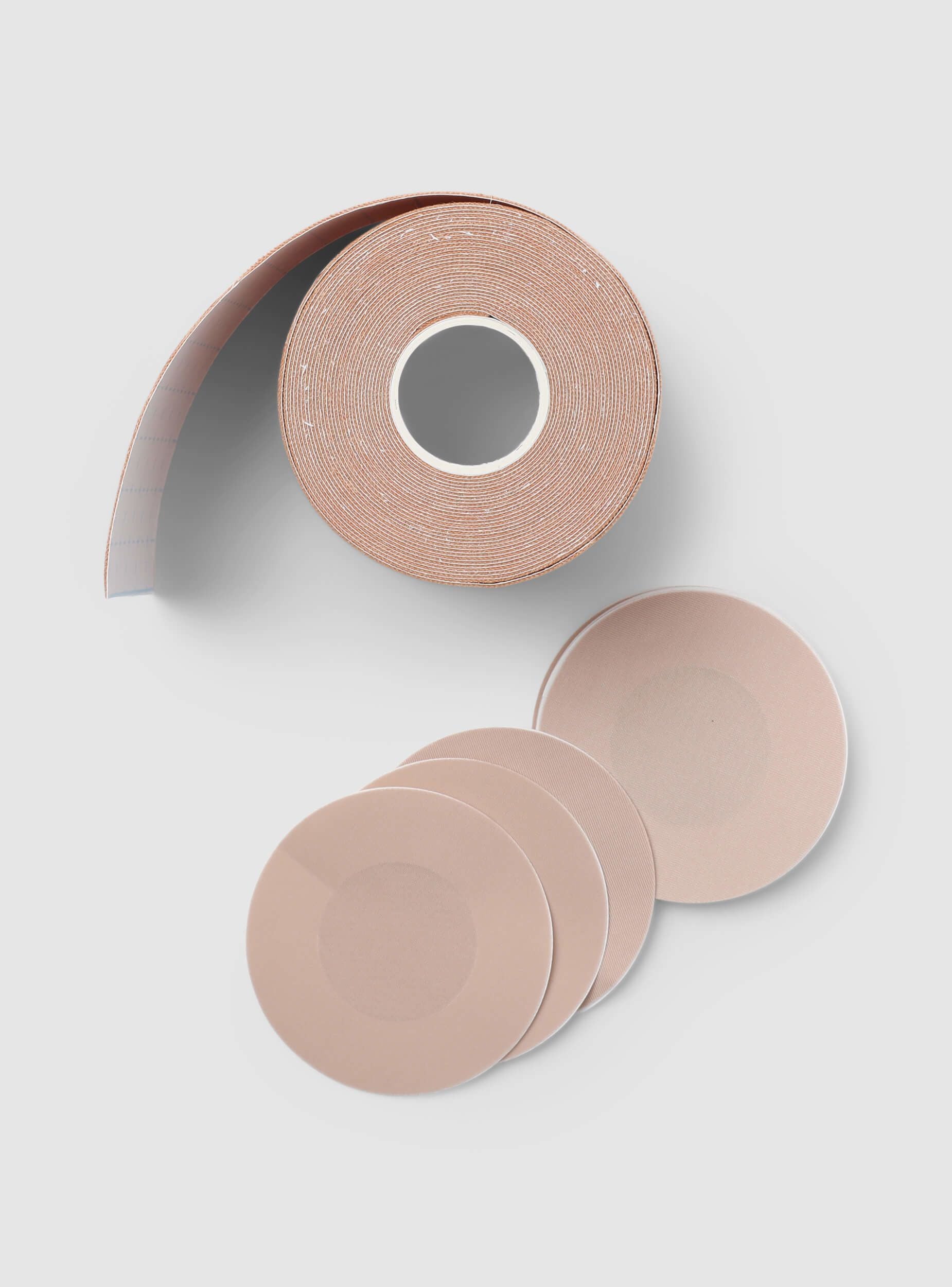 Accessori da donna ideali per occasioni speciali. Questo set include copricapezzoli adesivi e nastro adesivo, perfetti per garantire discrezione e comfort sotto abiti eleganti o casual. I copricapezzoli sono progettati per adattarsi comodamente alla pelle, mentre il nastro adesivo offre un supporto aggiuntivo. Un accessorio versatile e indispensabile per il guardaroba femminile.