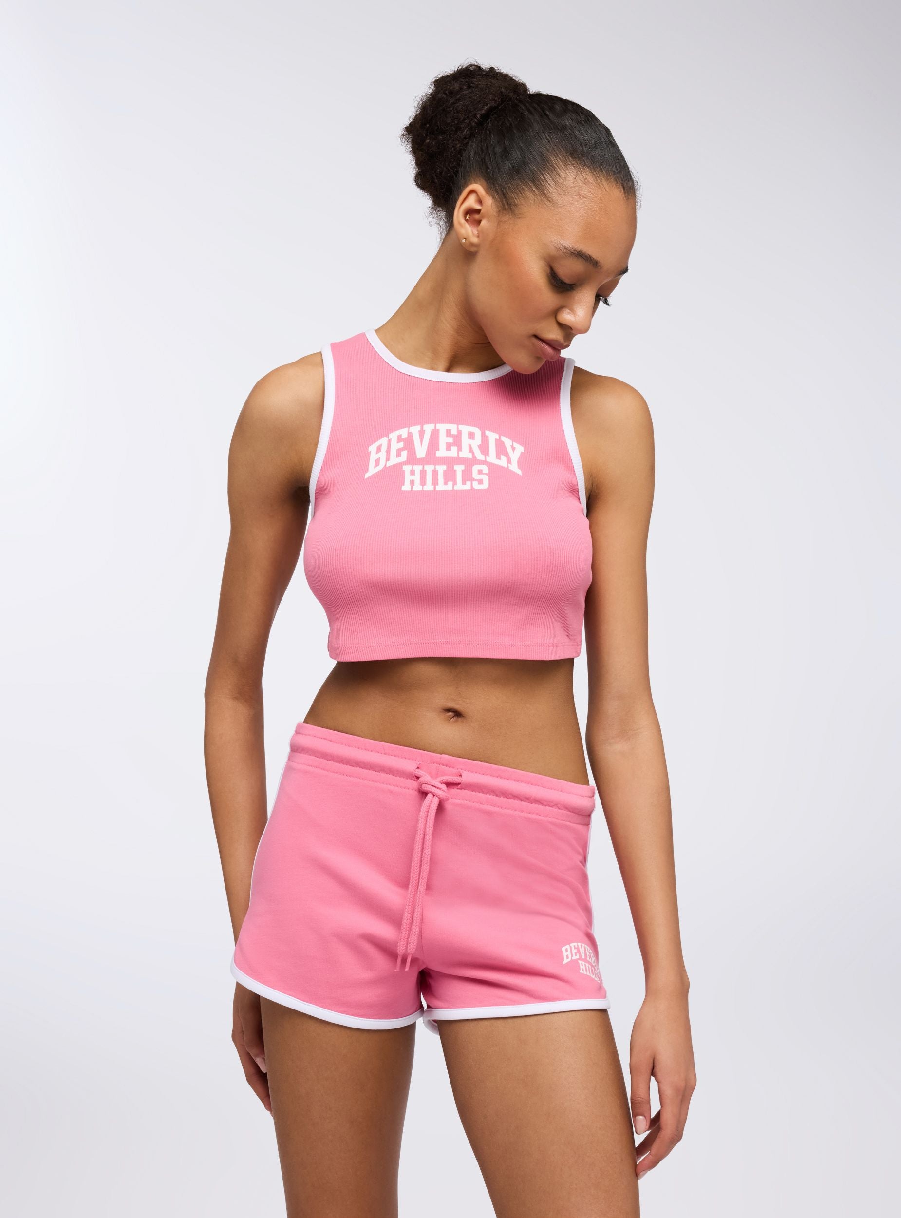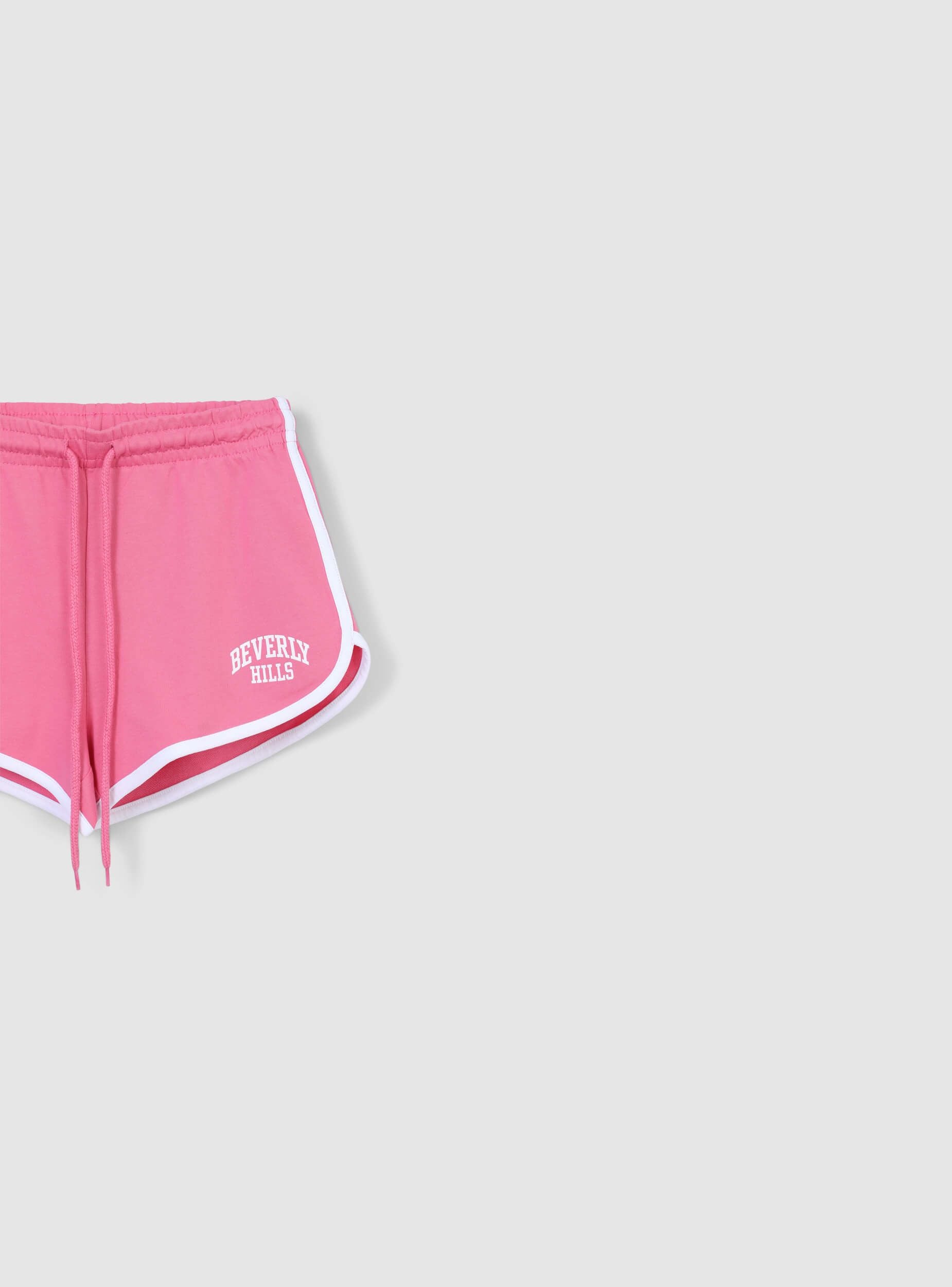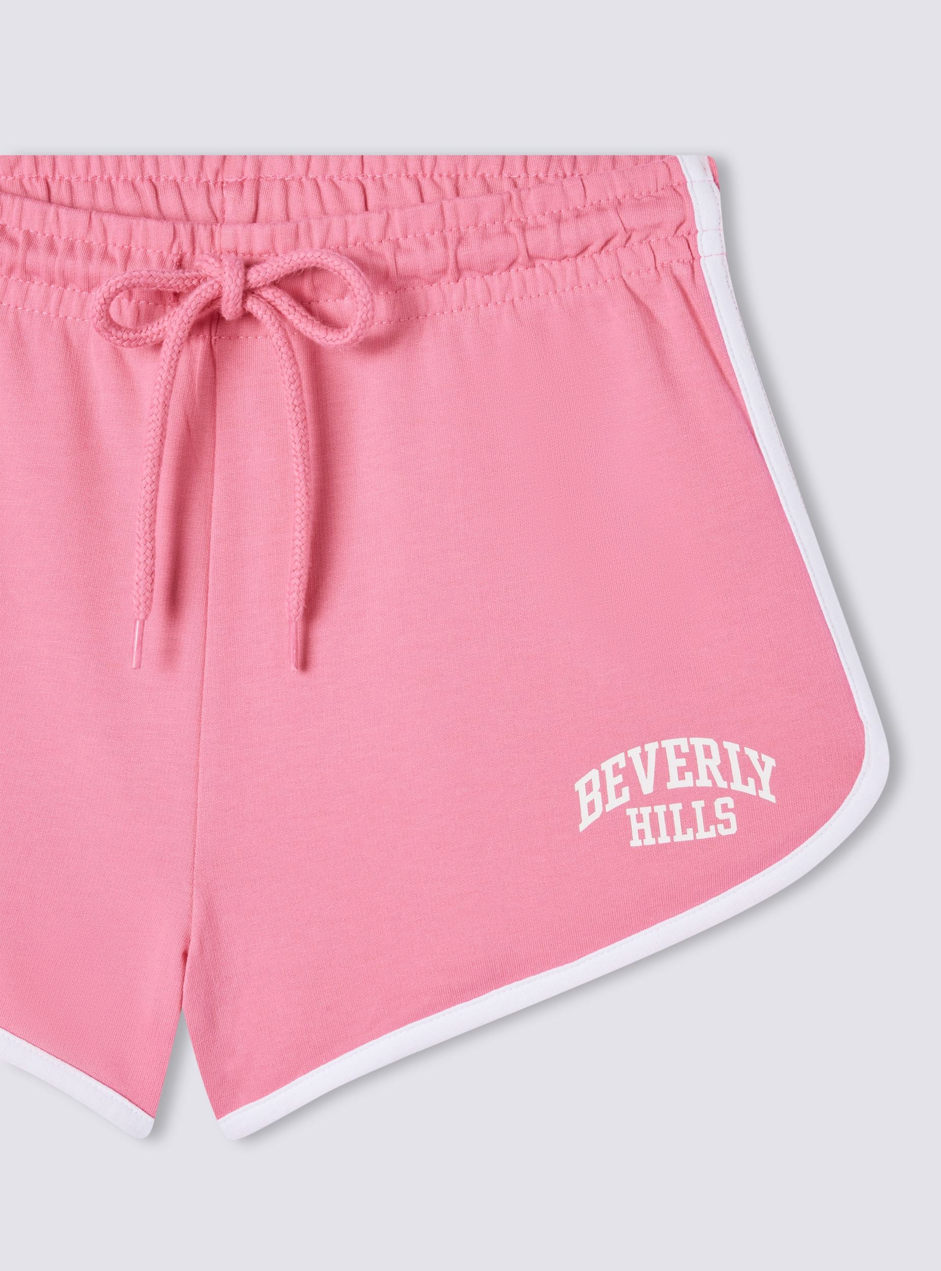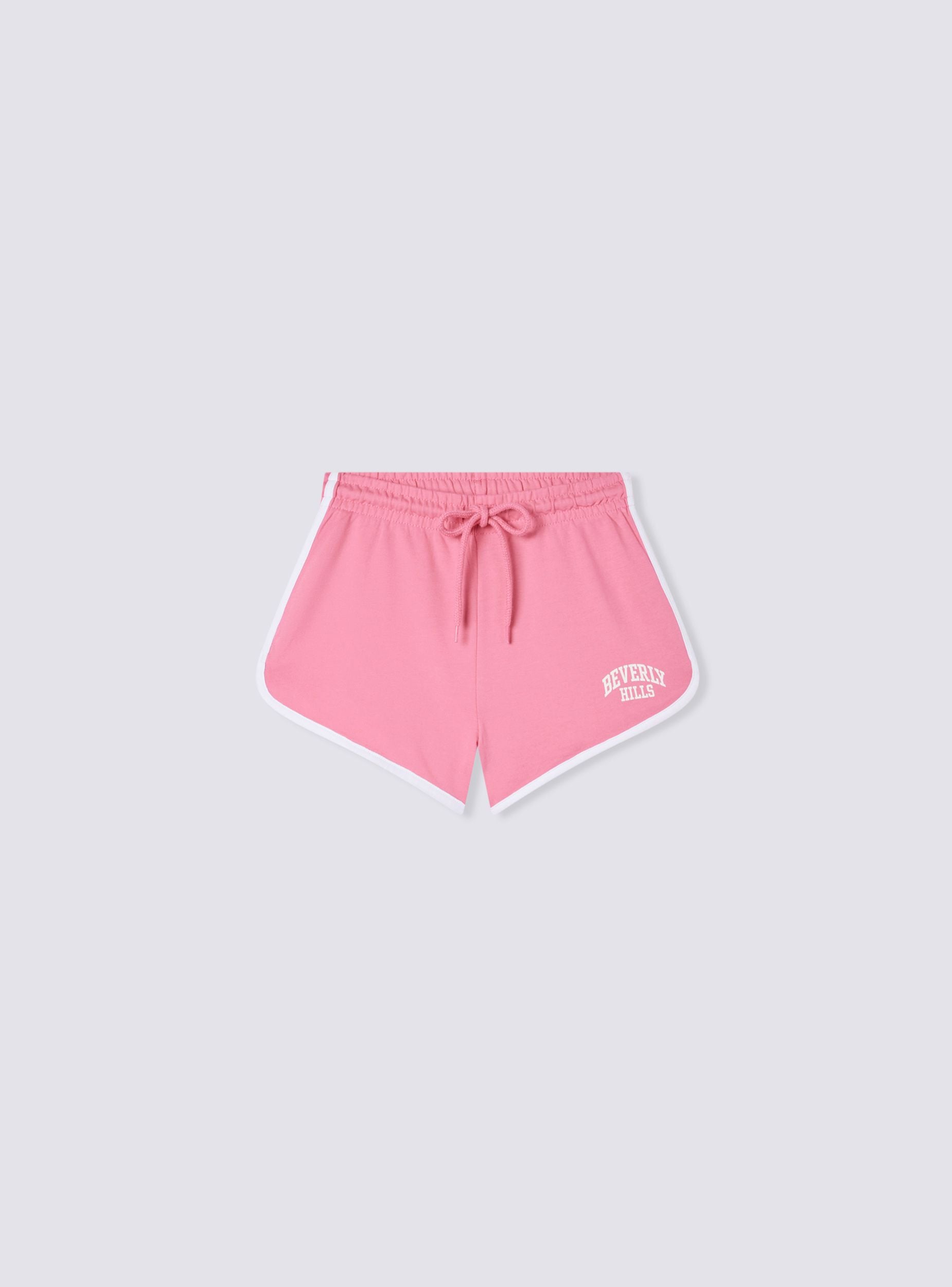 Pantaloncini da donna leggeri con un design sportivo e una stampa college sul davanti. Presentano una comoda coulisse in vita per regolarne la vestibilità e sono rifiniti con profili a contrasto che donano un tocco dinamico al look. Ideali per il tempo libero, questi pantaloncini offrono praticità e stile con un aspetto casual ma curato.