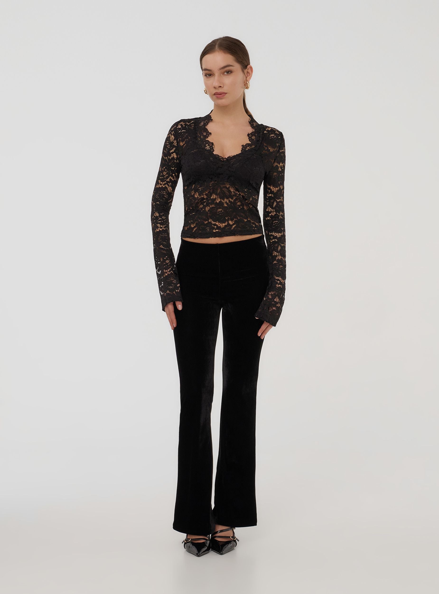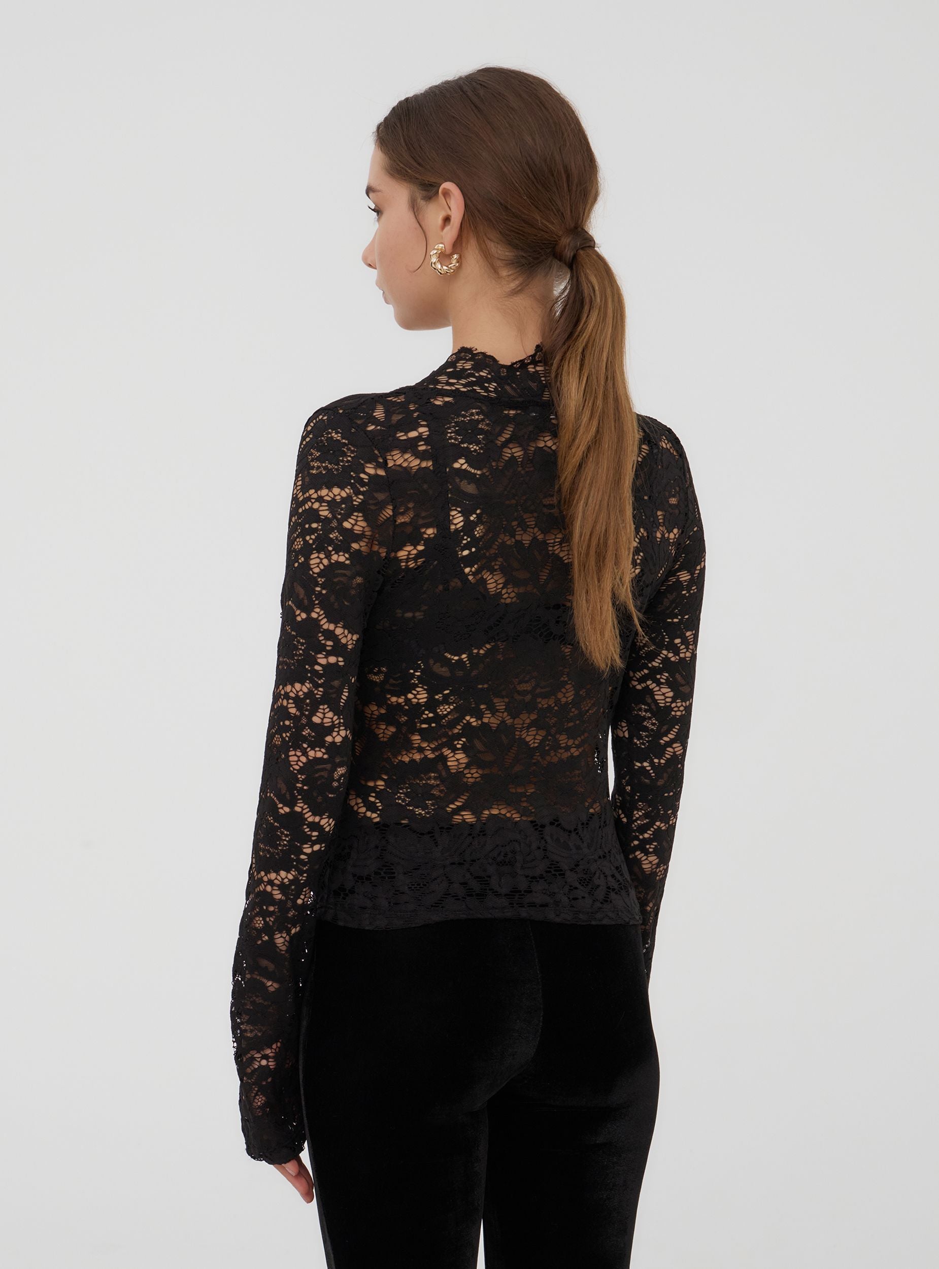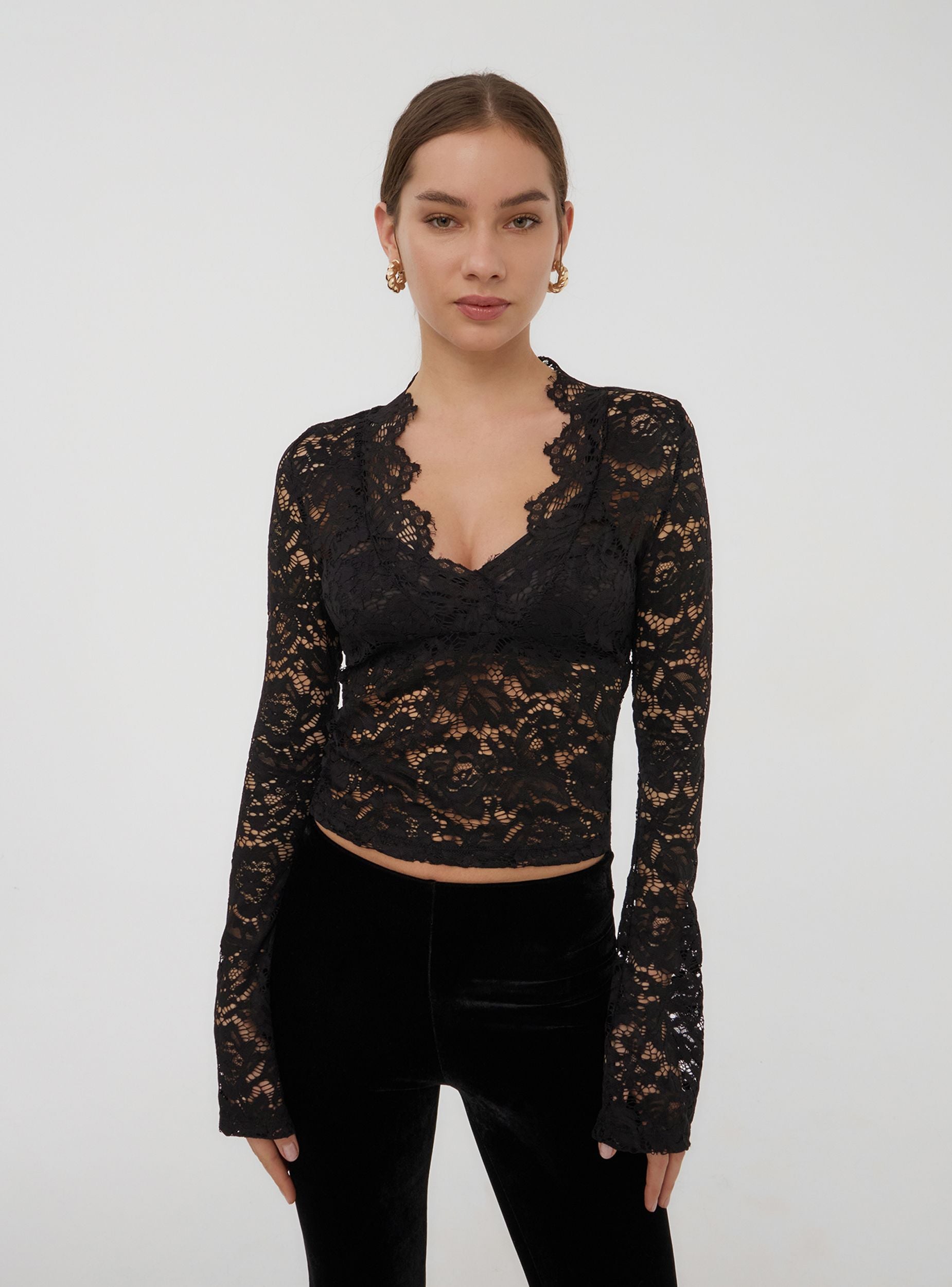 Maglia da donna dallo stile sofisticato e femminile, realizzata in tinta unita con una raffinata lavorazione in pizzo che dona un tocco di eleganza. Lo scollo a V esalta il décolleté e crea un look sensuale e moderno, perfetto per serate o occasioni speciali. Le maniche lunghe completano il design, offrendo un'ulteriore nota di raffinatezza. La trasparenza del pizzo aggiunge un dettaglio delicato e romantico, ideale da abbinare a top sottostanti o lingerie per un effetto vedo-non-vedo.Dettagli