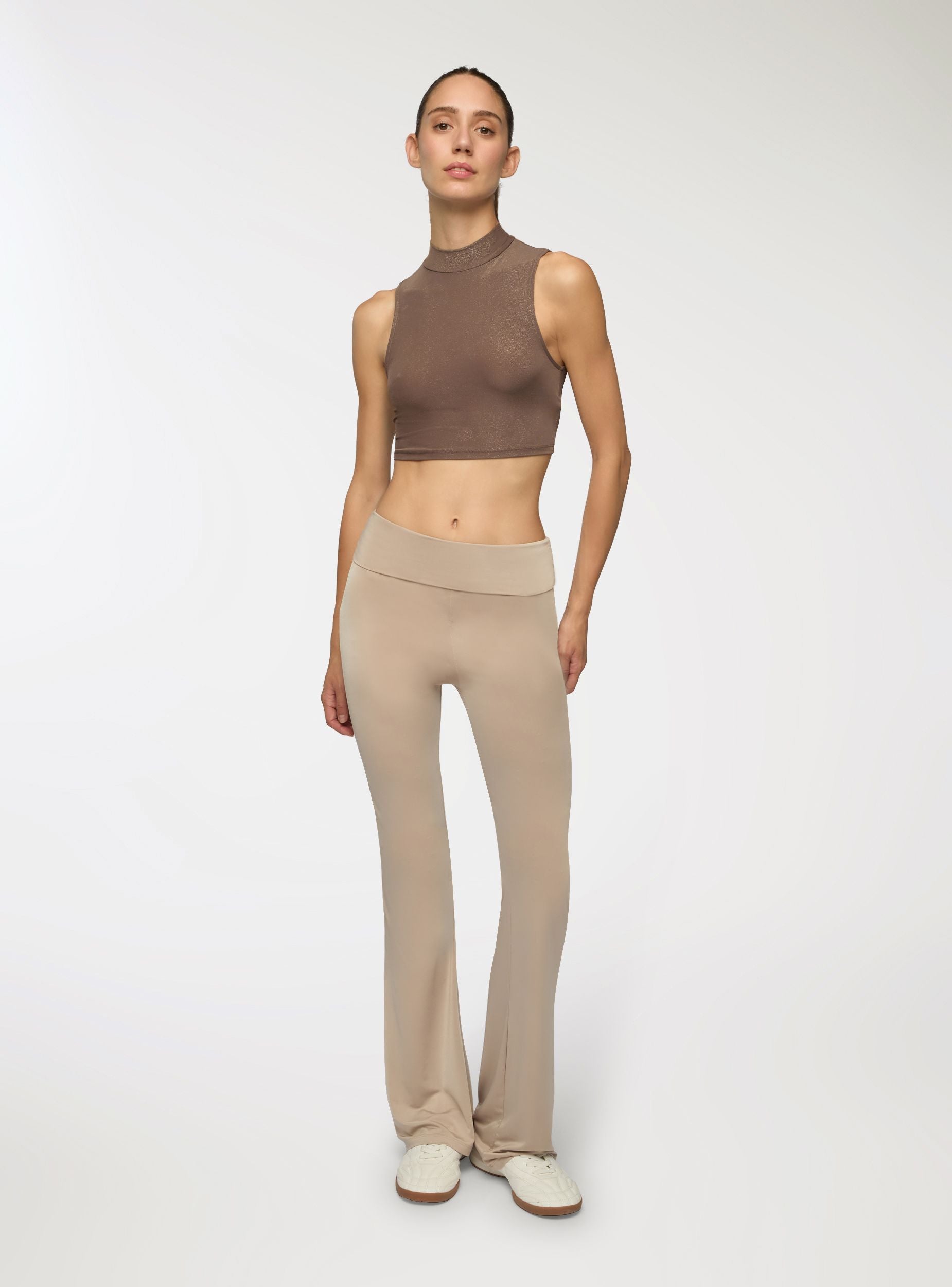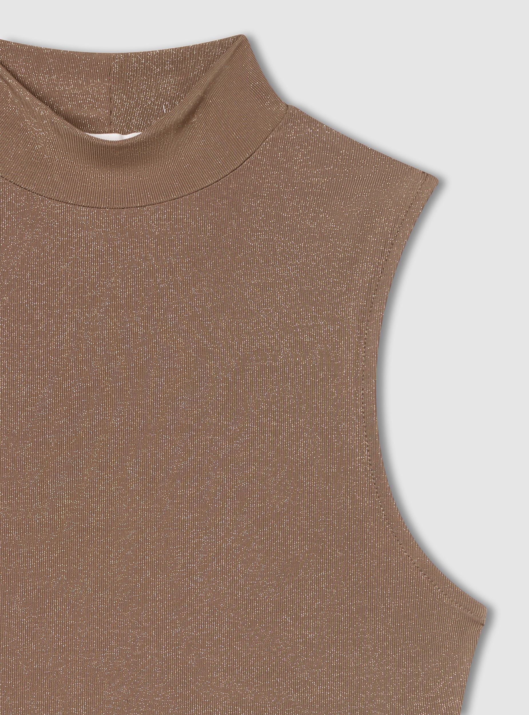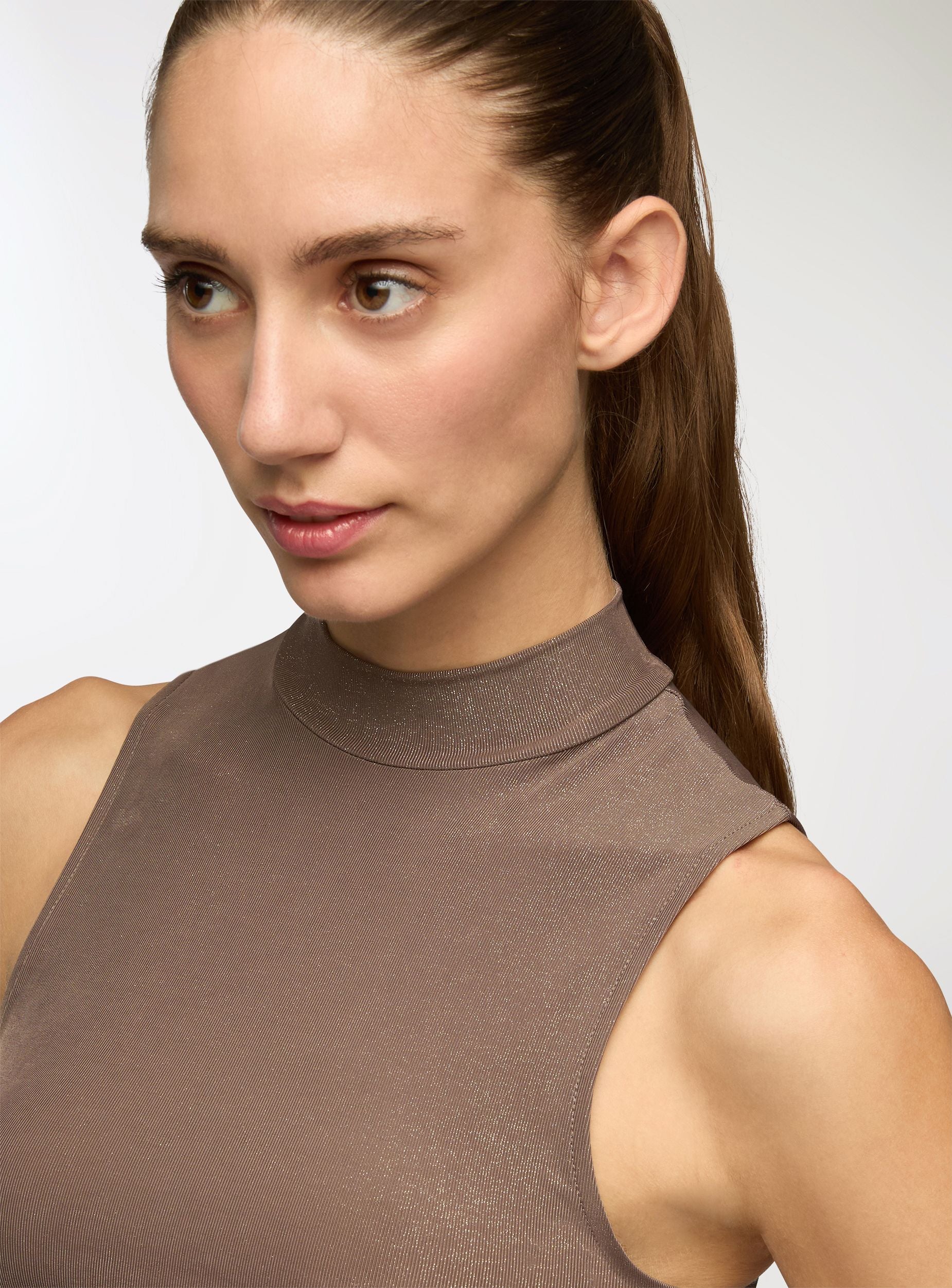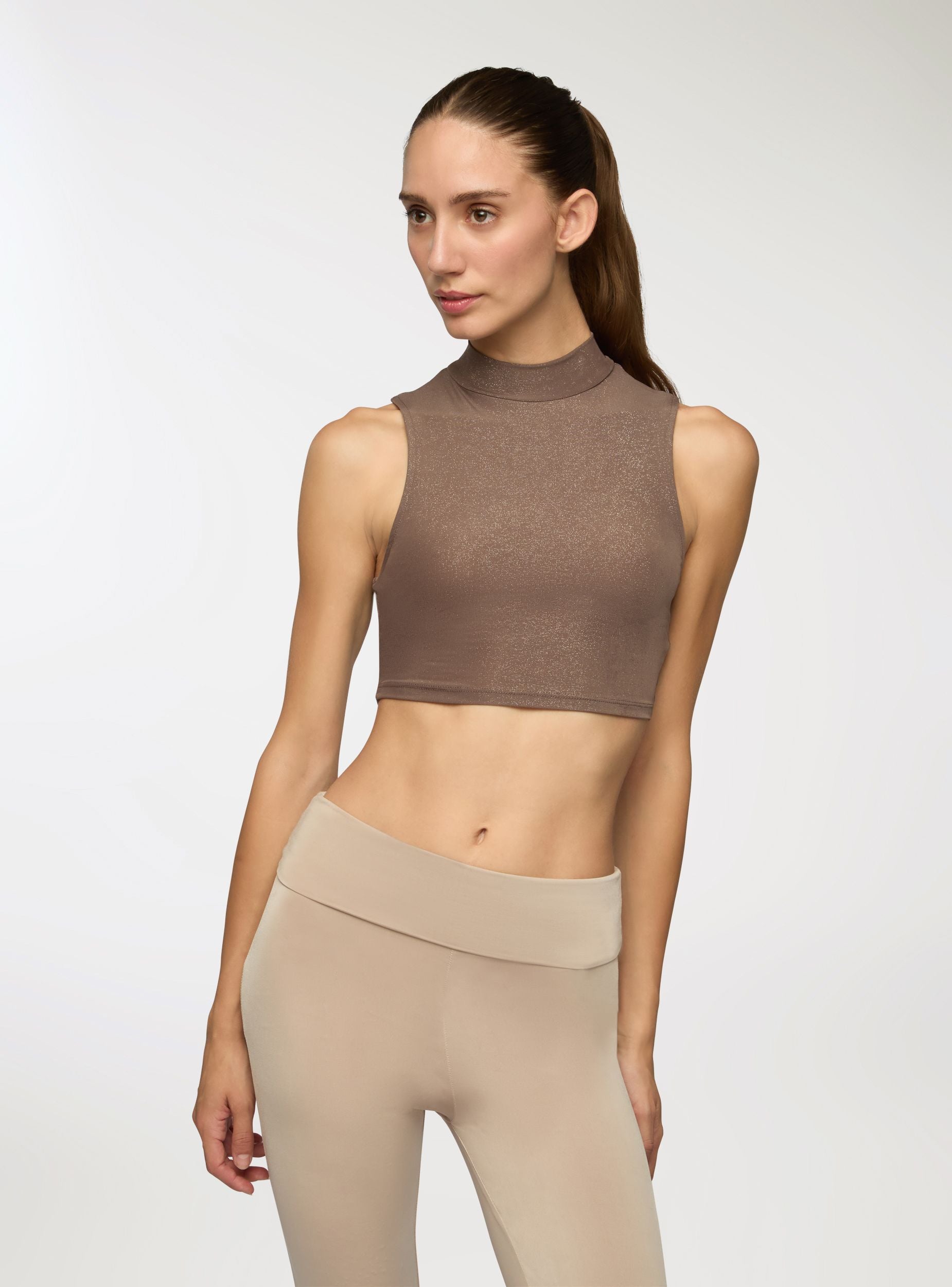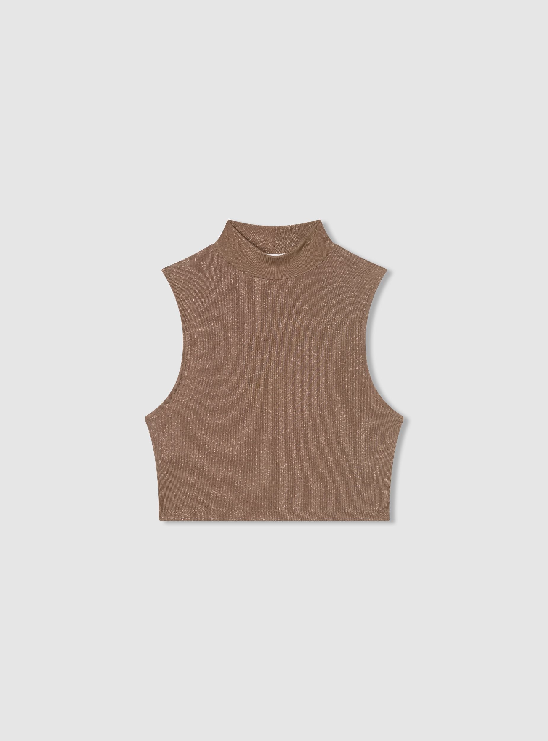 Canotta da donna con collo alto e senza maniche, caratterizzata da una vestibilità crop che esalta la silhouette. Il design minimalista e l'effetto luccicante la rendono ideale per outfit moderni e sofisticati. Perfetta per essere abbinata a pantaloni a vita alta o gonne, si adatta a diverse occasioni, dal casual al formale, offrendo versatilità e stile.Dettagli