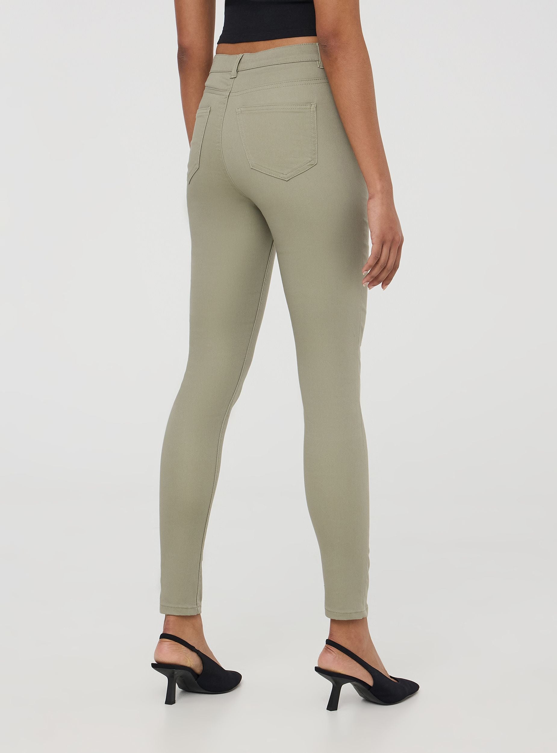 Pantaloni da donna, modello skinny a vita alta, perfetti per valorizzare la silhouette con eleganza. Presentano una chiusura con bottone e zip, passanti in vita e cinque tasche funzionali. La tinta unita li rende ideali per look casual o formali, abbinandoli a camicie o maglie aderenti e scarpe con tacco o sneakers per uno stile versatile e sofisticato.