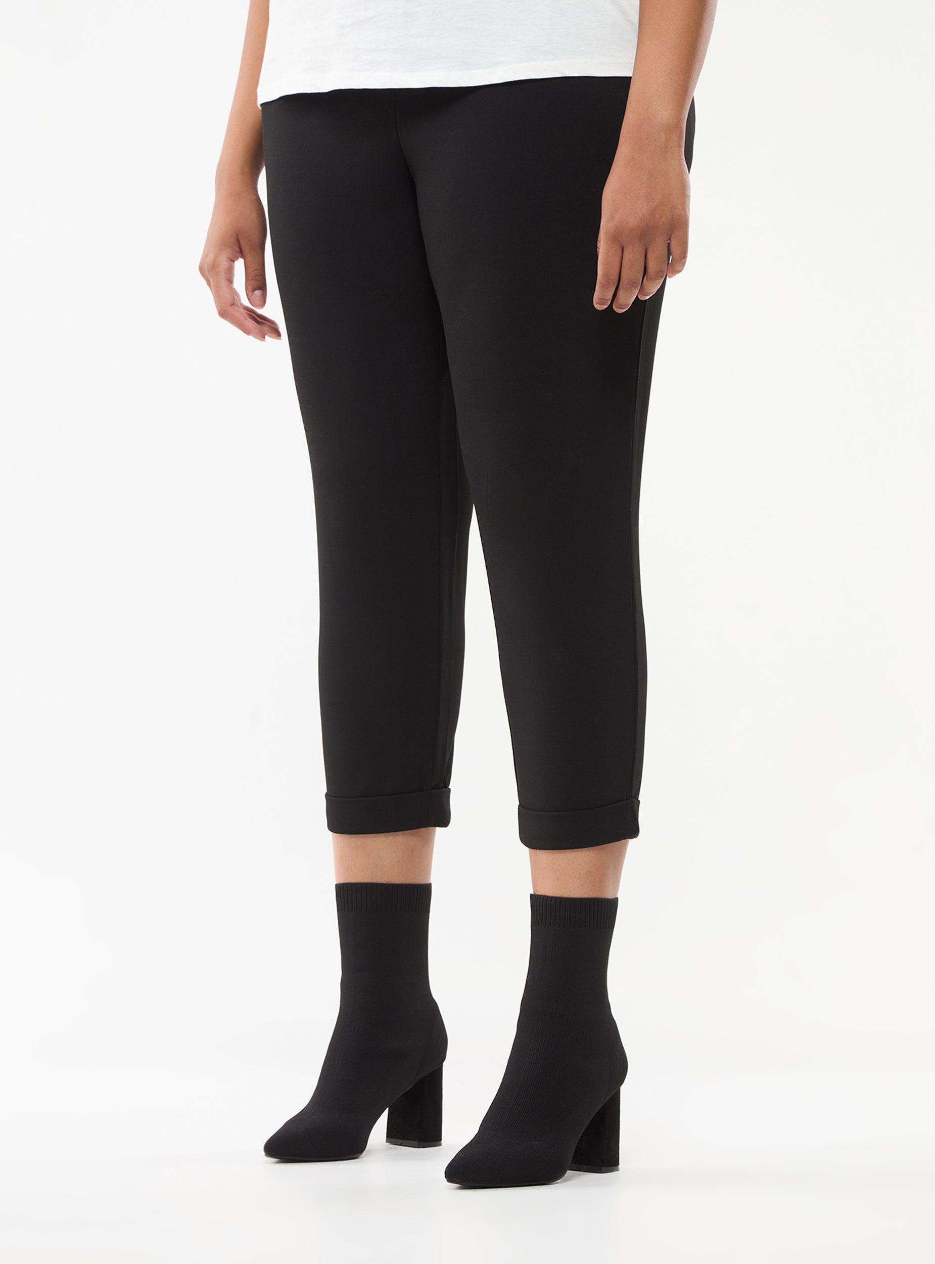 Pantaloni chino da donna tinta unita. Tasche alla francese e doppia pinces. Elastico dietro in vita, orlo con risvolto.Vestibilità è regular, linea Curvy.
