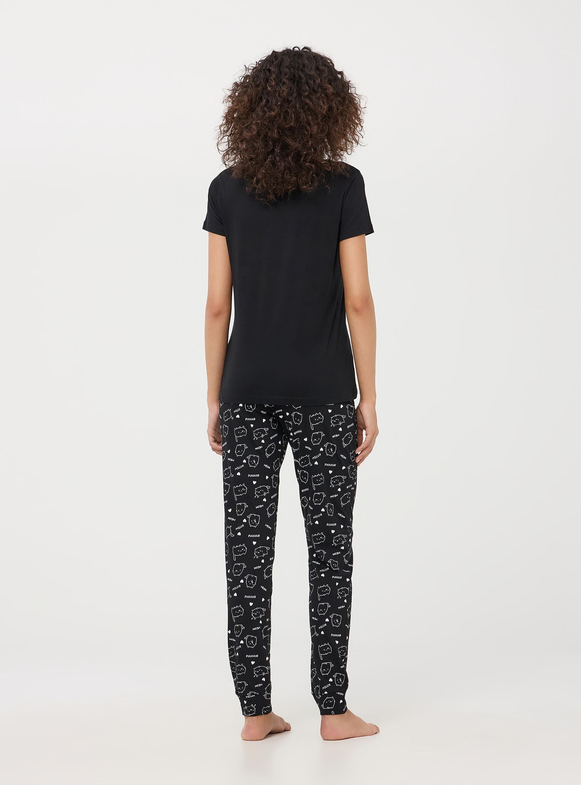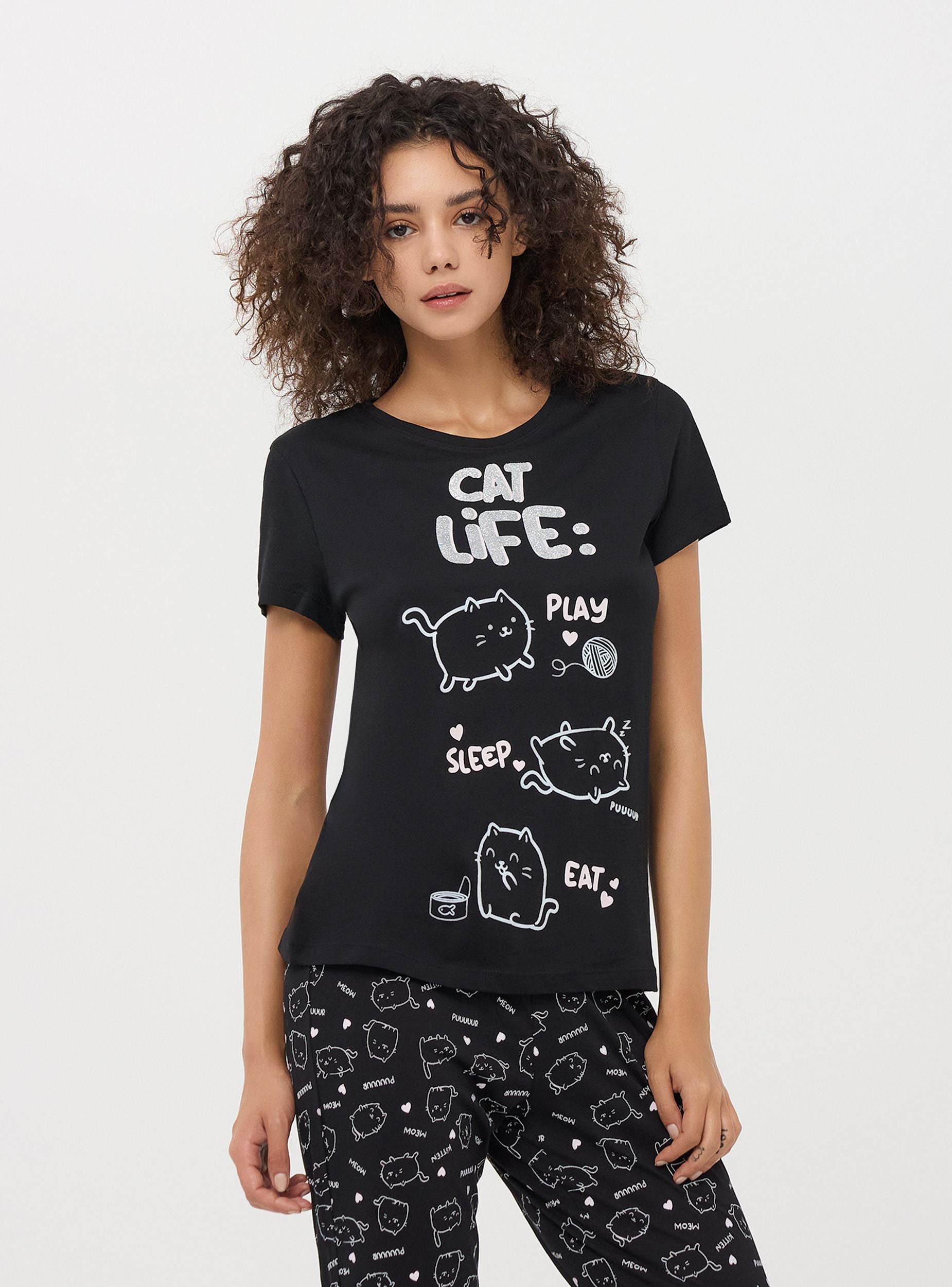 Morbido e confortevole pigiama da donna nero in cotone, composto da maglia a maniche corte e pantaloni lunghi. La maglia presenta una simpatica grafica con gattini e la scritta "Cat Life: Play, Sleep, Eat", mentre i pantaloni sono decorati con un pattern di gattini e scritte. La vestibilità è comoda e rilassata, ideale per notti serene o momenti di relax a casa. Pigiama perfetto per le cat lovers.