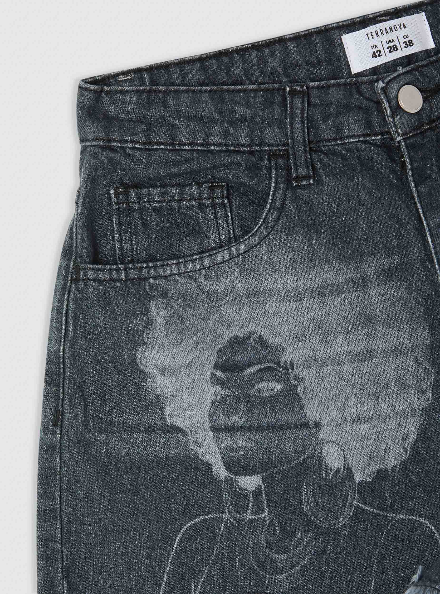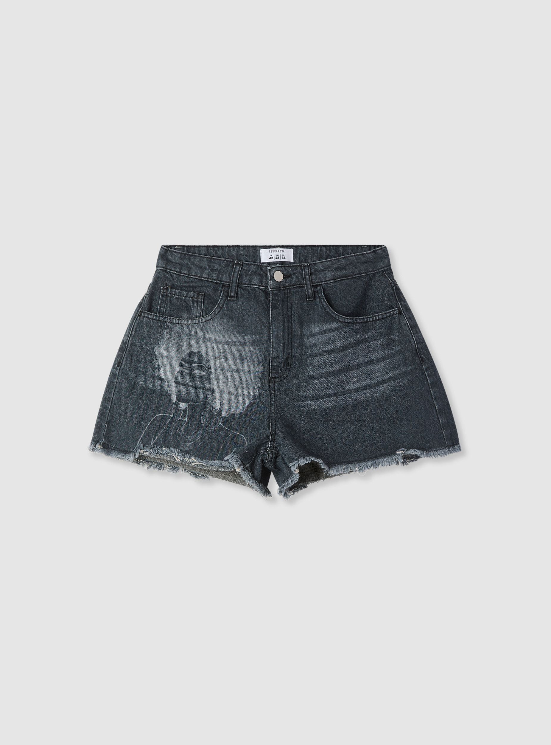 Shorts da donna in denim con stampa grafica. Questi pantaloncini presentano una vestibilità comoda e un design a cinque tasche, con chiusura con cerniera e bottone. L'orlo sfrangiato aggiunge un tocco casual e alla moda, mentre la stampa grafica dona originalità e carattere. Perfetti per un look estivo, si abbinano facilmente a magliette o top per un outfit fresco e moderno.