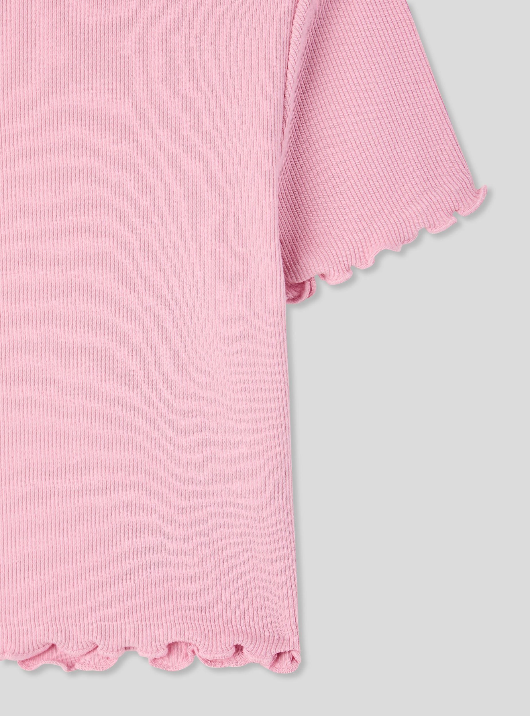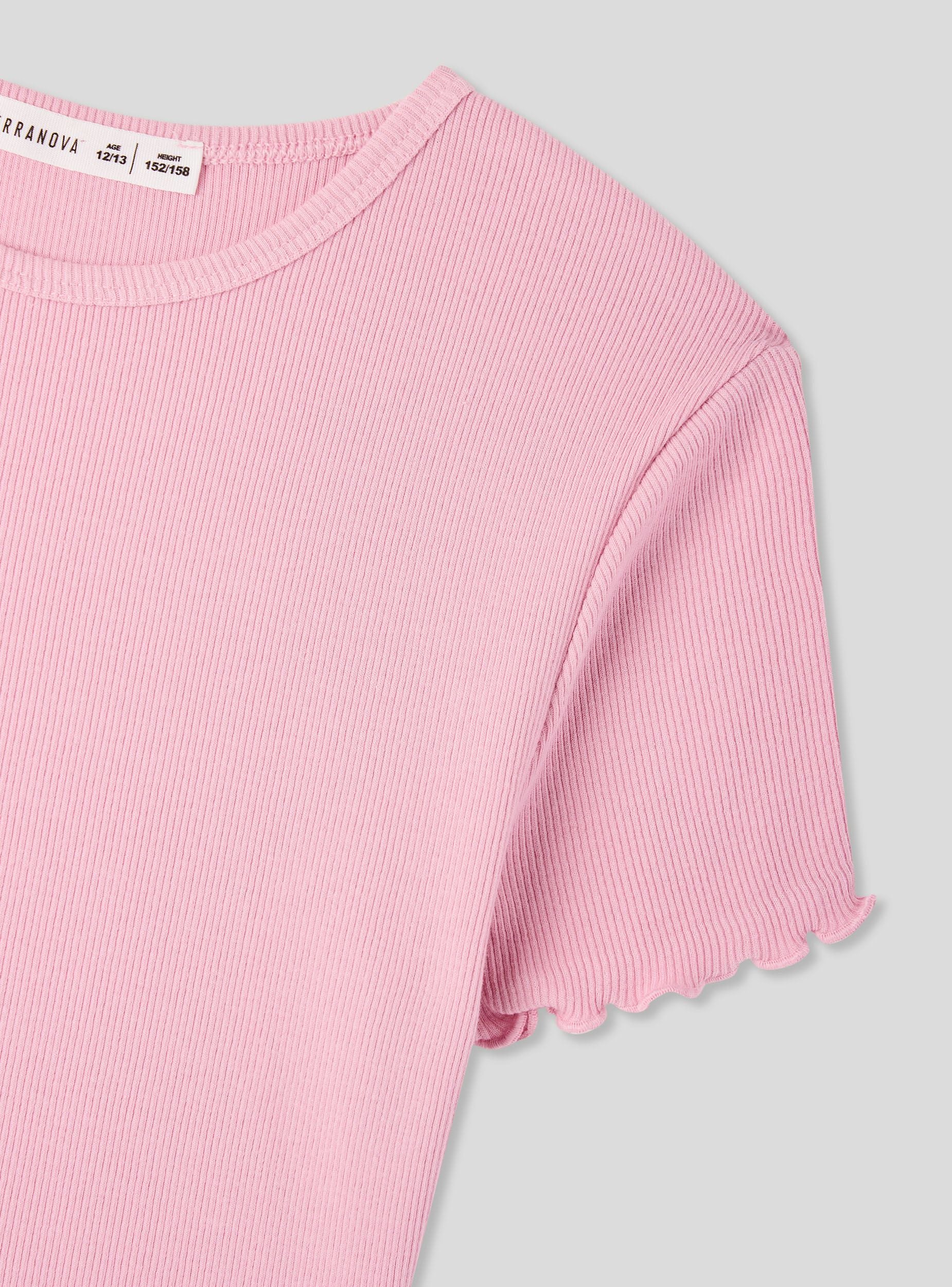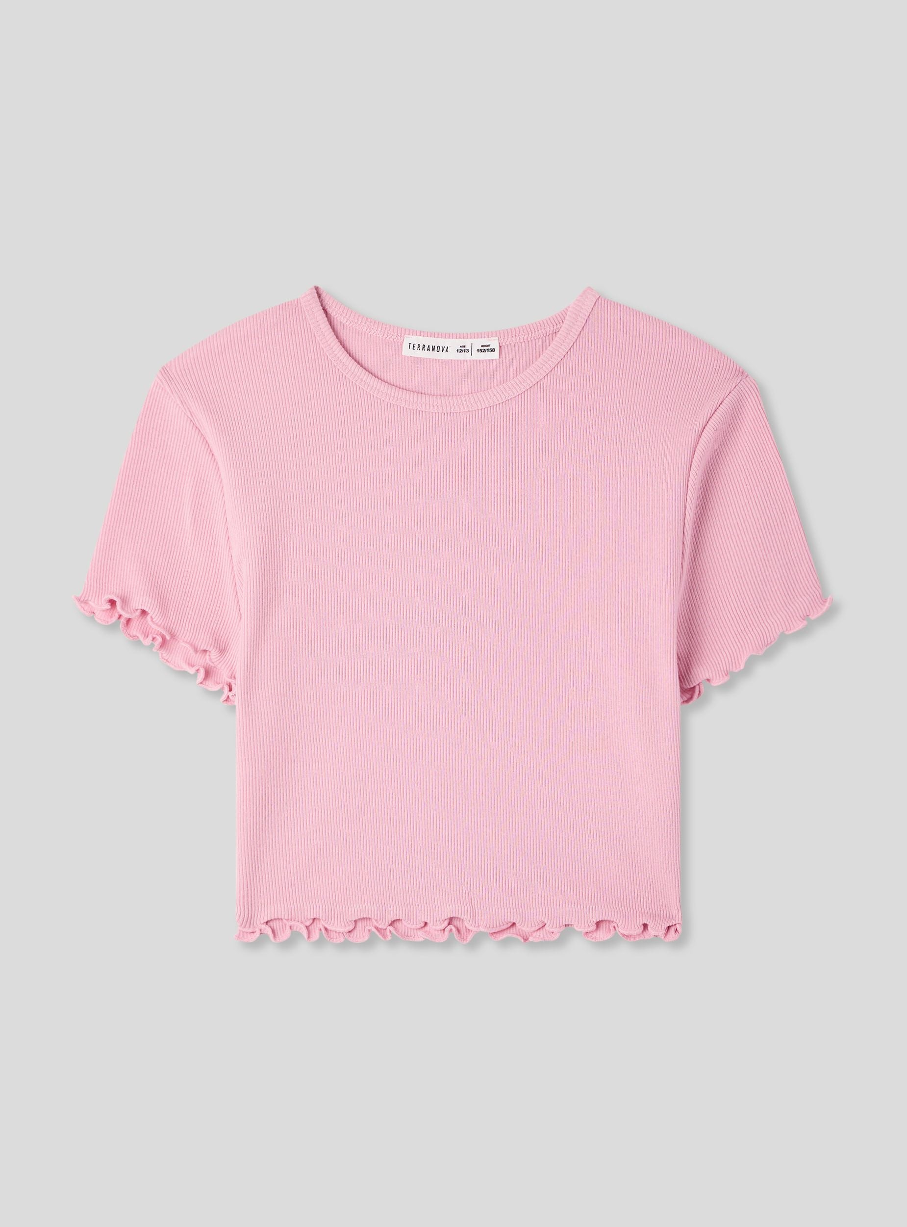 Maglietta da bambina con vestibilità crop, ideale per un look casual e moderno. Perfetta per essere abbinata a jeans o pantaloncini per un outfit fresco e giovanile. La maglietta presenta un design a costine tinta unita semplice e versatile, adatto a diverse occasioni informali. Grazie alla sua linea essenziale, si presta a essere indossata sia da sola che sotto una giacca leggera.
