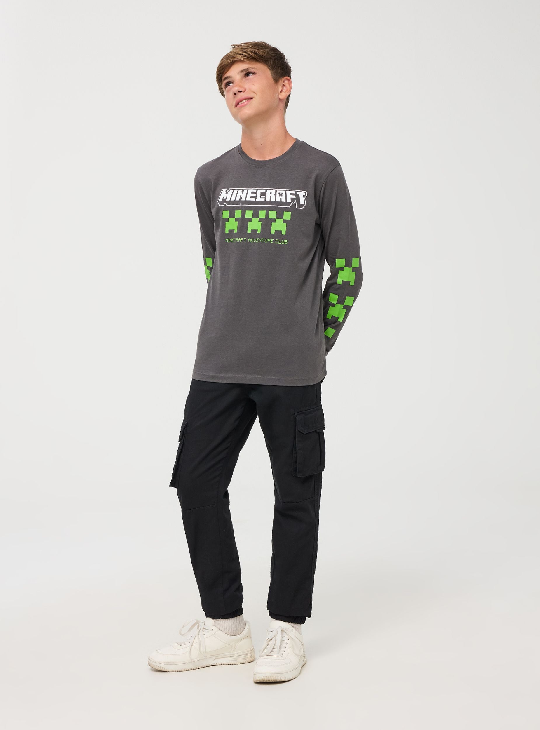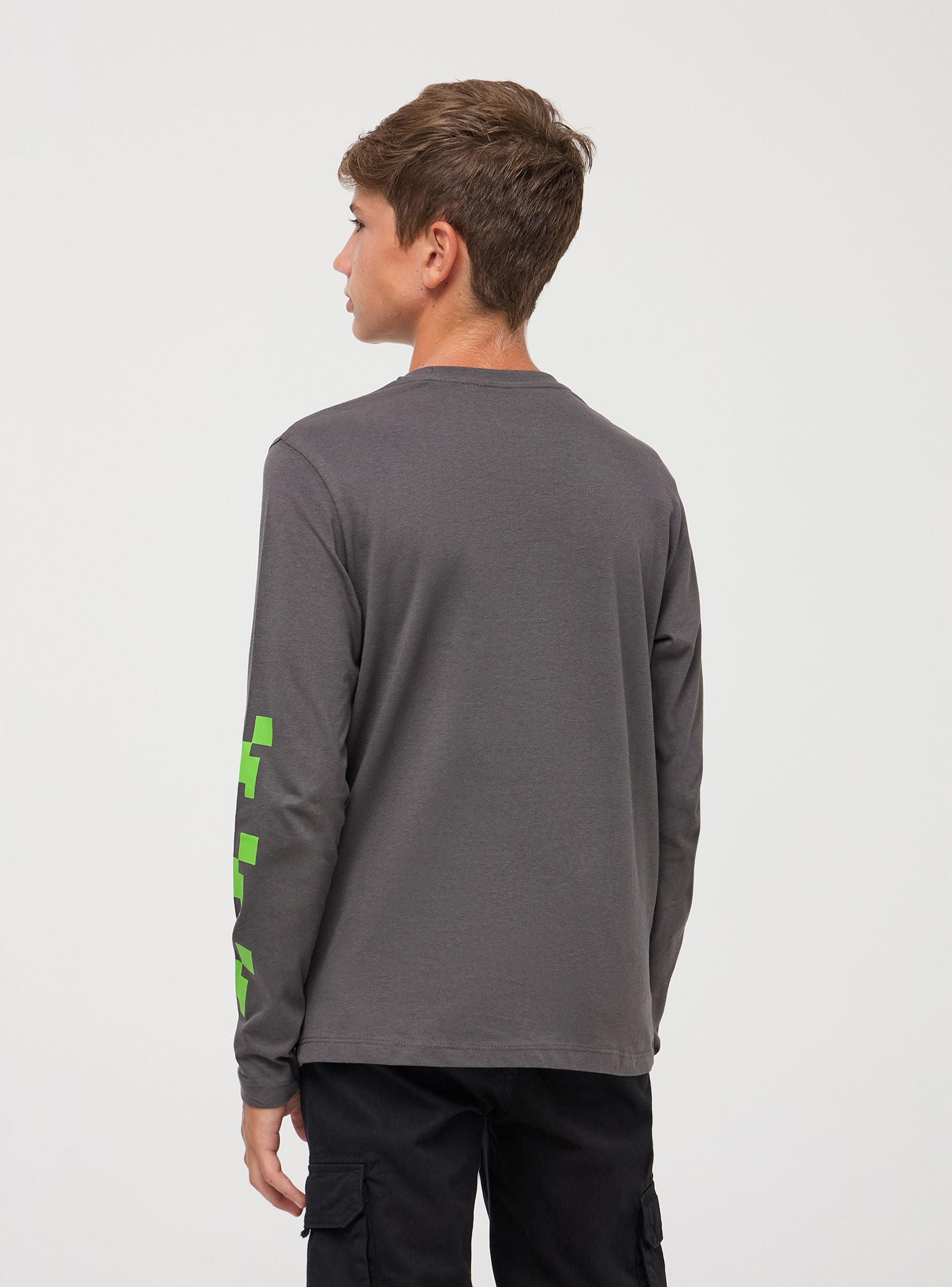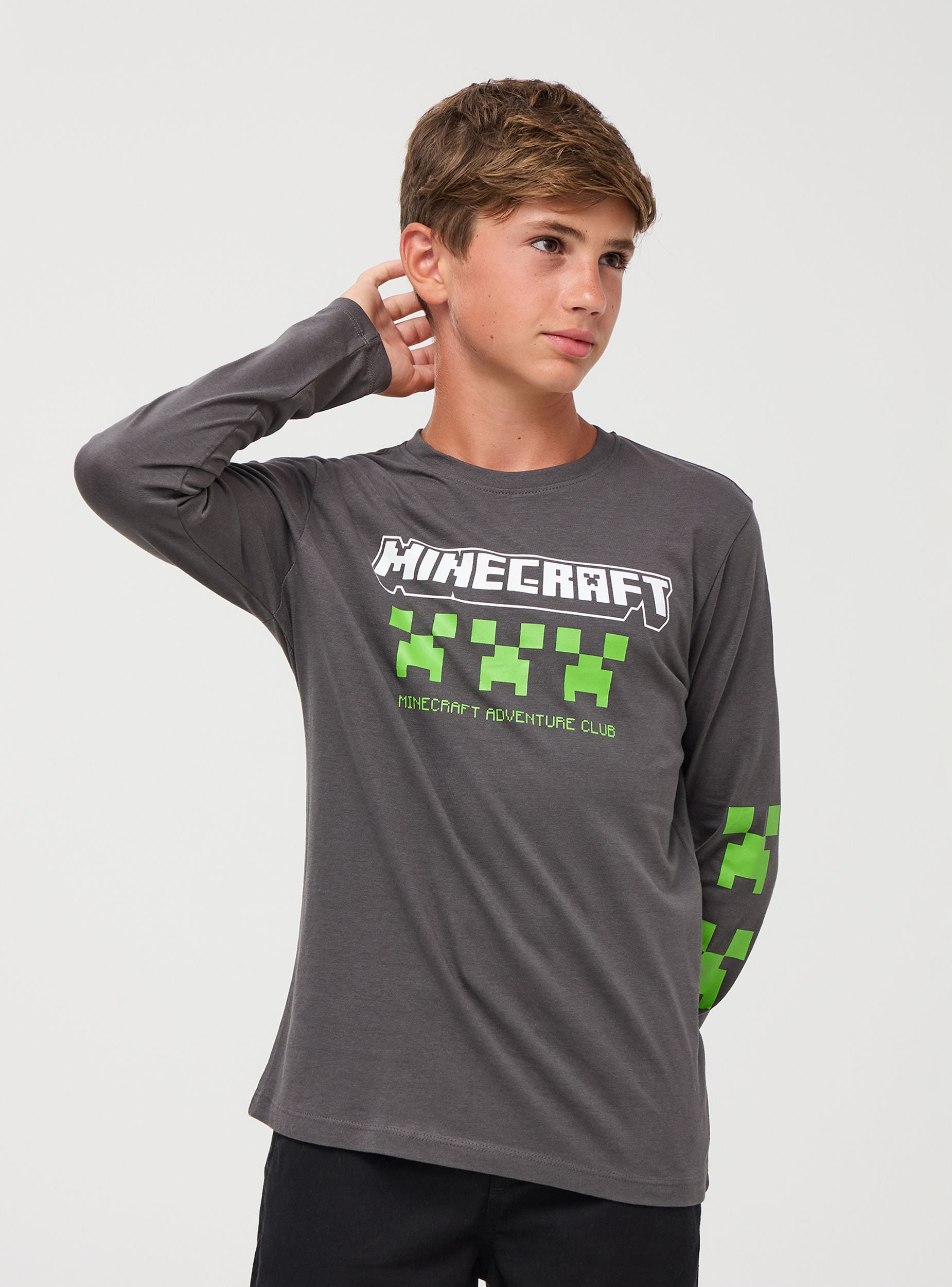 Maglia a maniche lunghe da bambino. Ideale per gli appassionati di Minecraft®. Perfetta per l'uso quotidiano. Presenta una stampa con il logo di Minecraft e disegni pixelati, che si ripetono sulle maniche per un tocco distintivo. La vestibilità è regolare, adatta a un look casual.