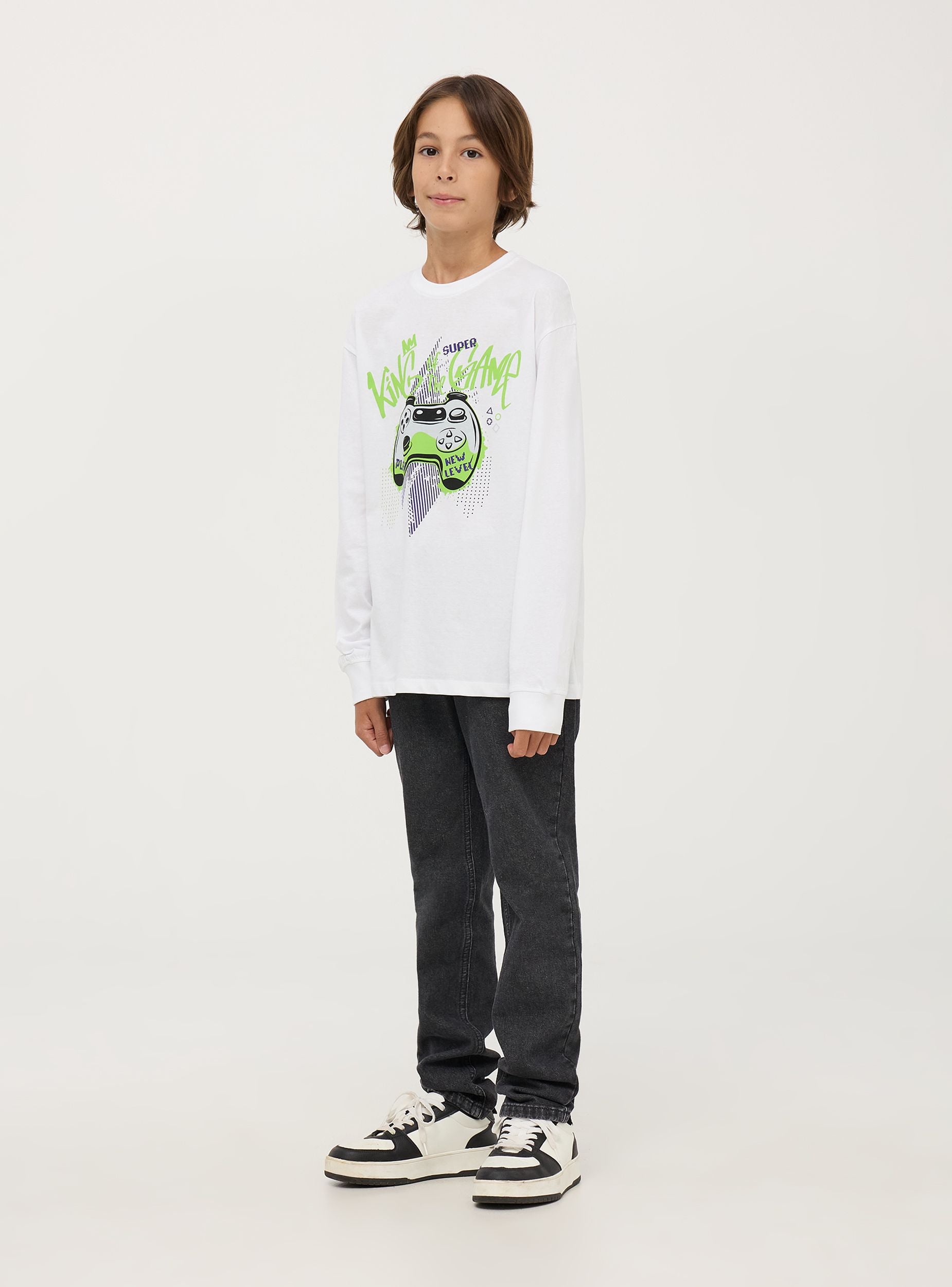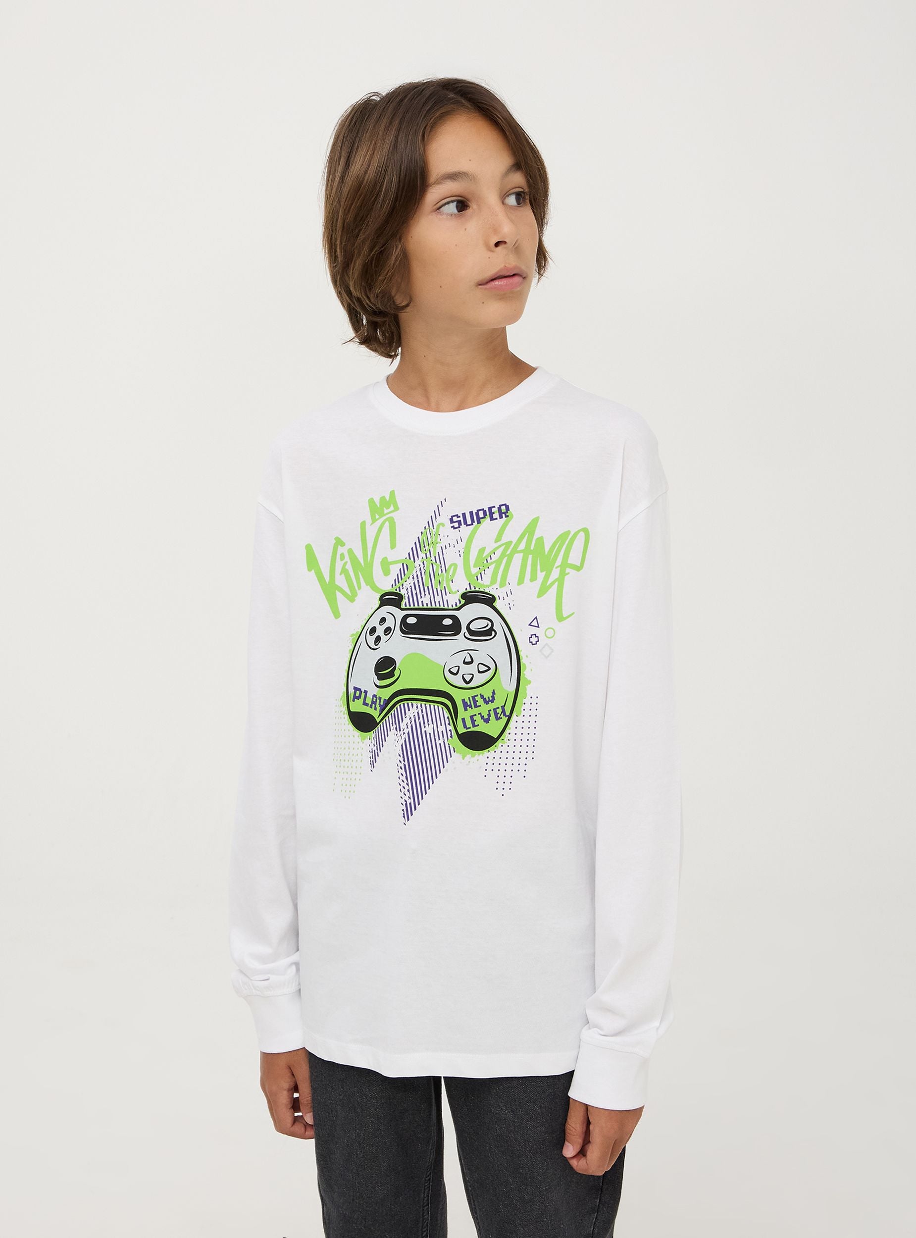 Maglia a maniche lunghe per bambino con stampa centrale vivace "King of the Game". La grafica presenta un controller di gioco. Il capo offre una vestibilità comoda e casual, perfetta per il tempo libero e le giornate a scuola.
