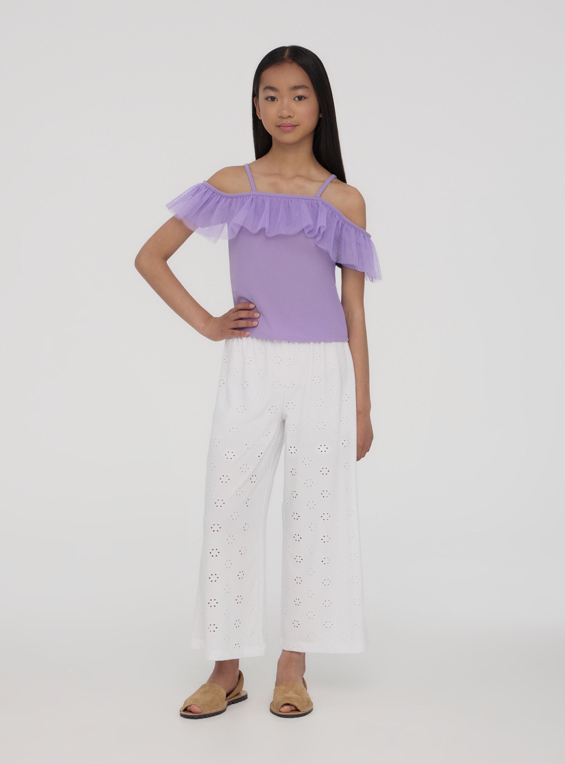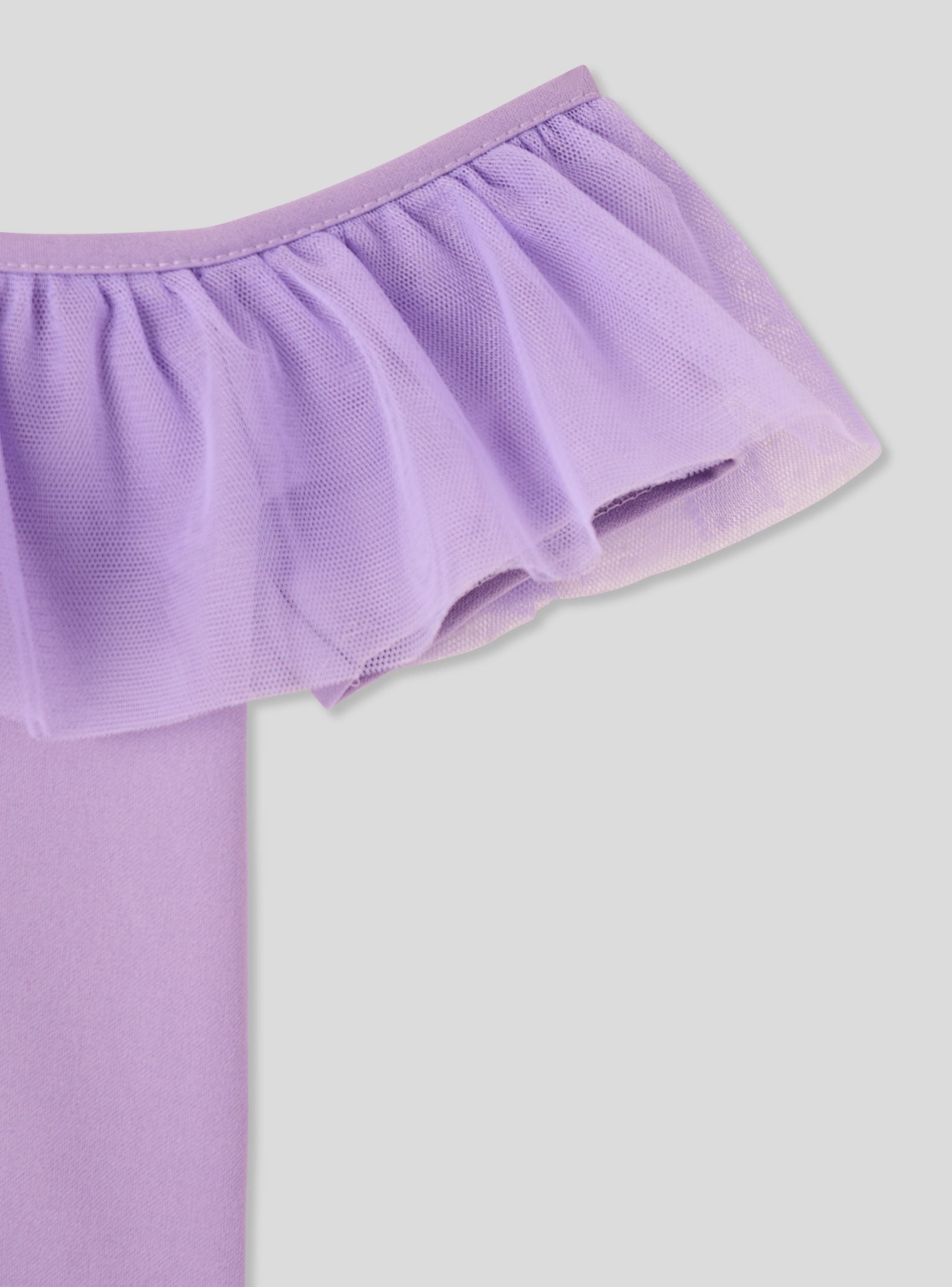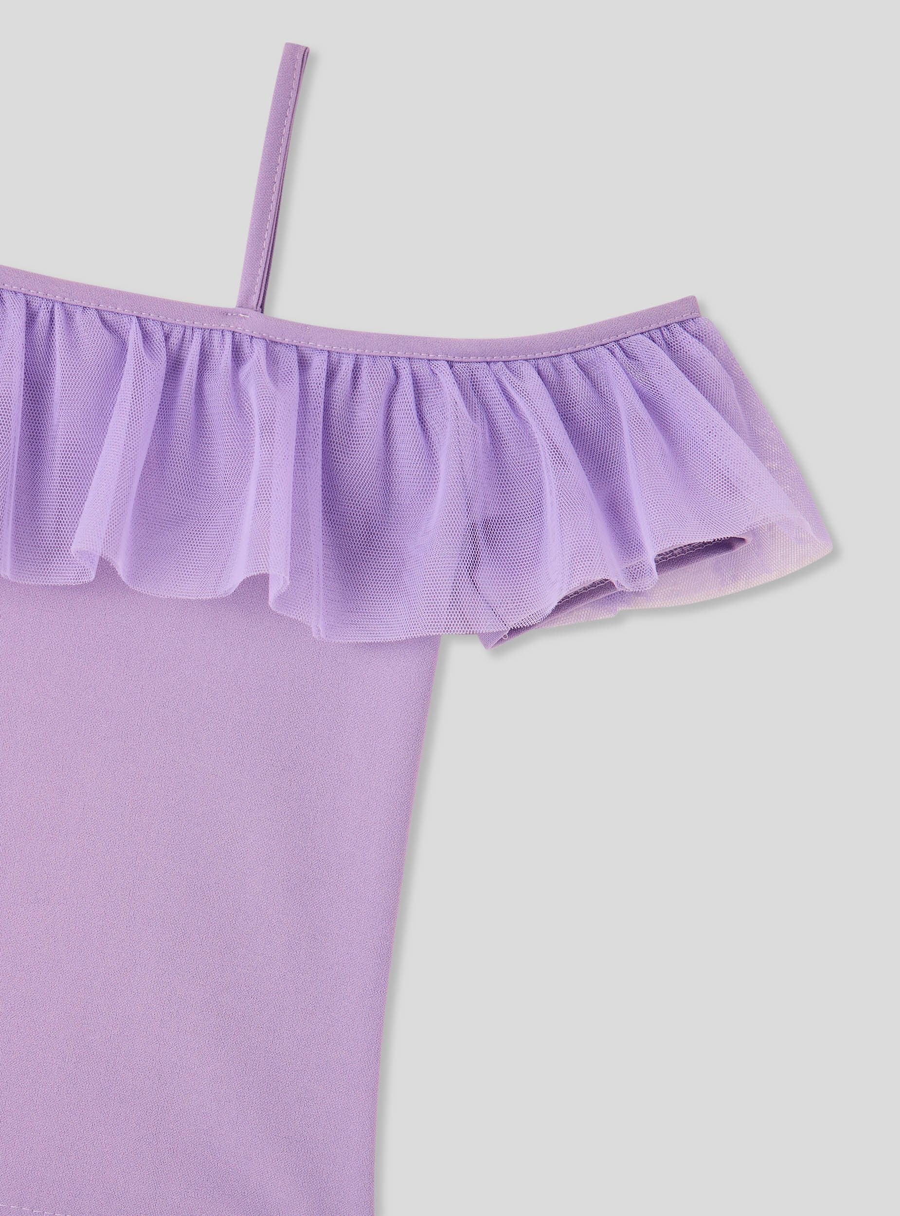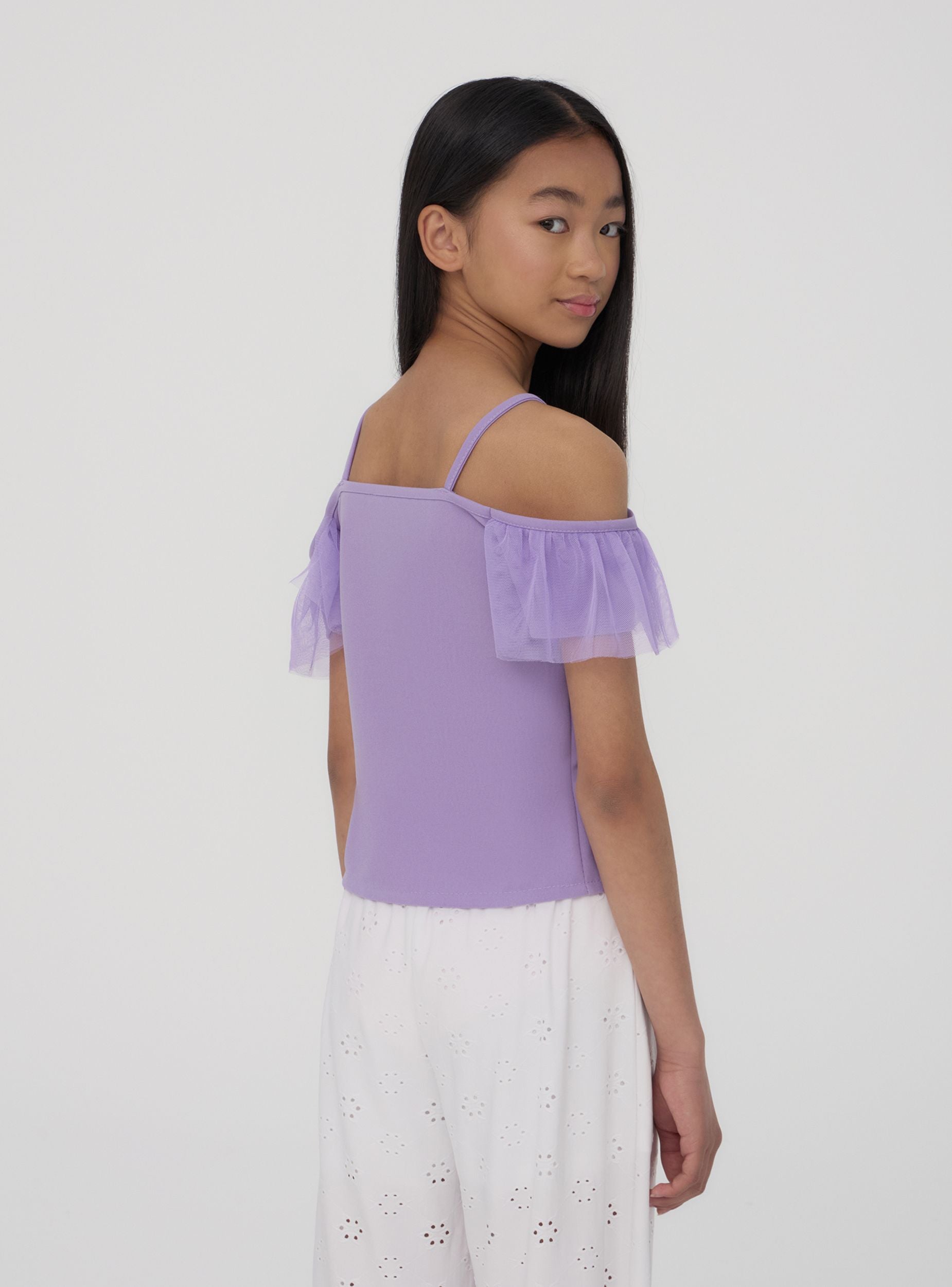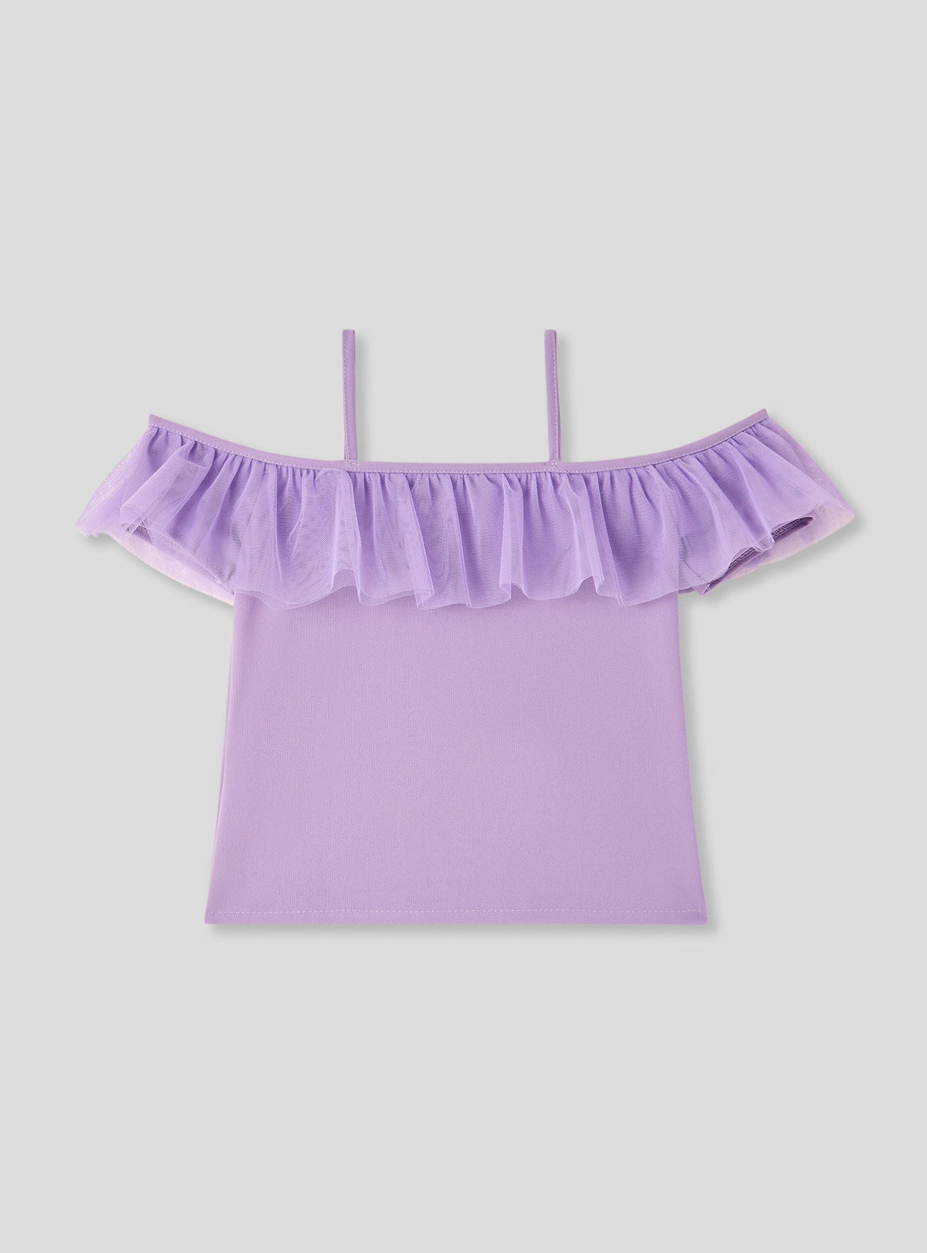 Top da bambina a tinta unita con spalle scoperte, caratterizzato da sottili spalline e ampia balza in tulle che dona un tocco romantico e moderno. Ideale per look estivi, si abbina facilmente a gonne o pantaloncini per outfit freschi e versatili. Vestibilità regolare, design leggero e raffinato, perfetto per aggiungere un dettaglio speciale ai look quotidiani.