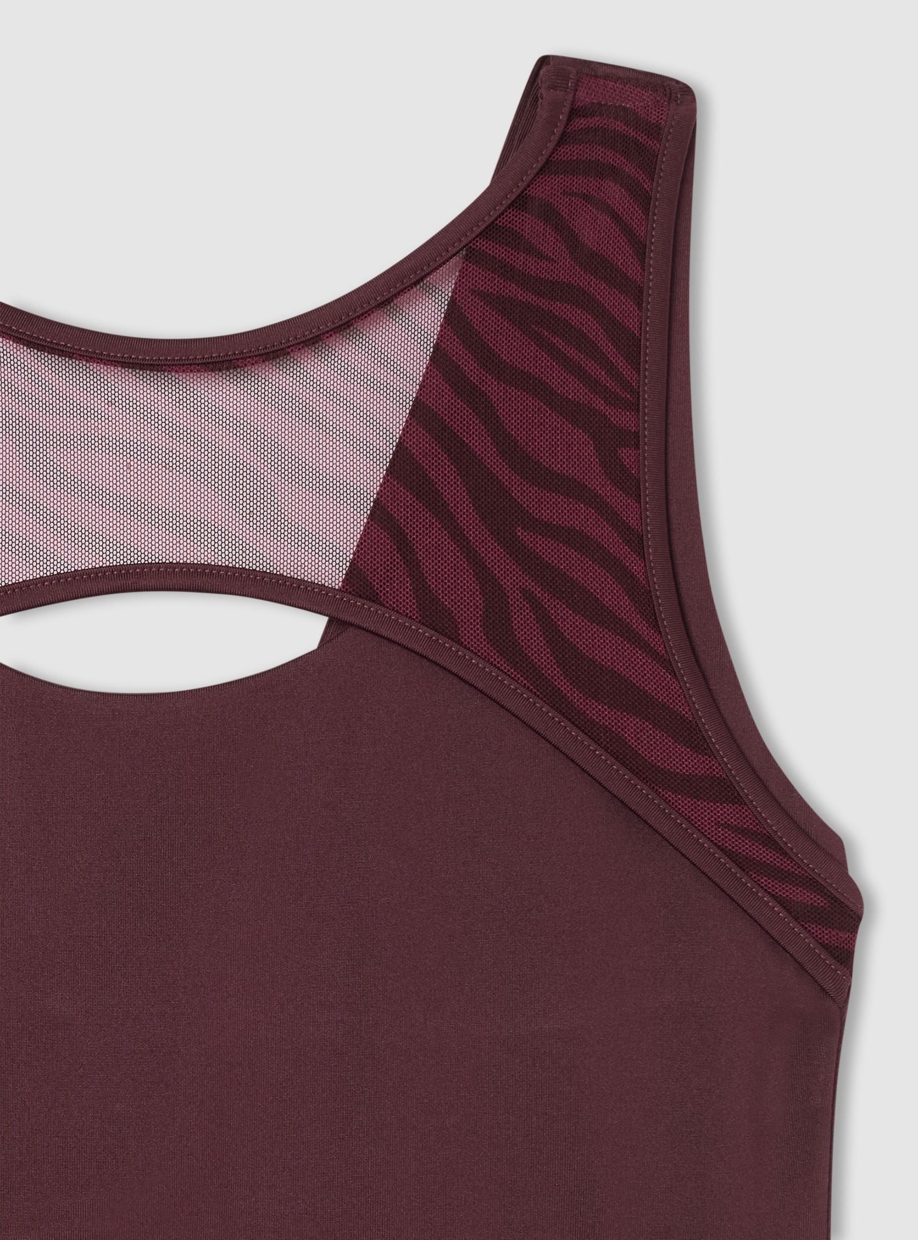 Top da donna ideale per attività sportive. Design con trasparenze e fantasia animalier, offre un look moderno e dinamico. Perfetto per abbinamenti con leggings o pantaloni sportivi. Vestibilità aderente per un comfort ottimale durante l'uso. Linea Active.