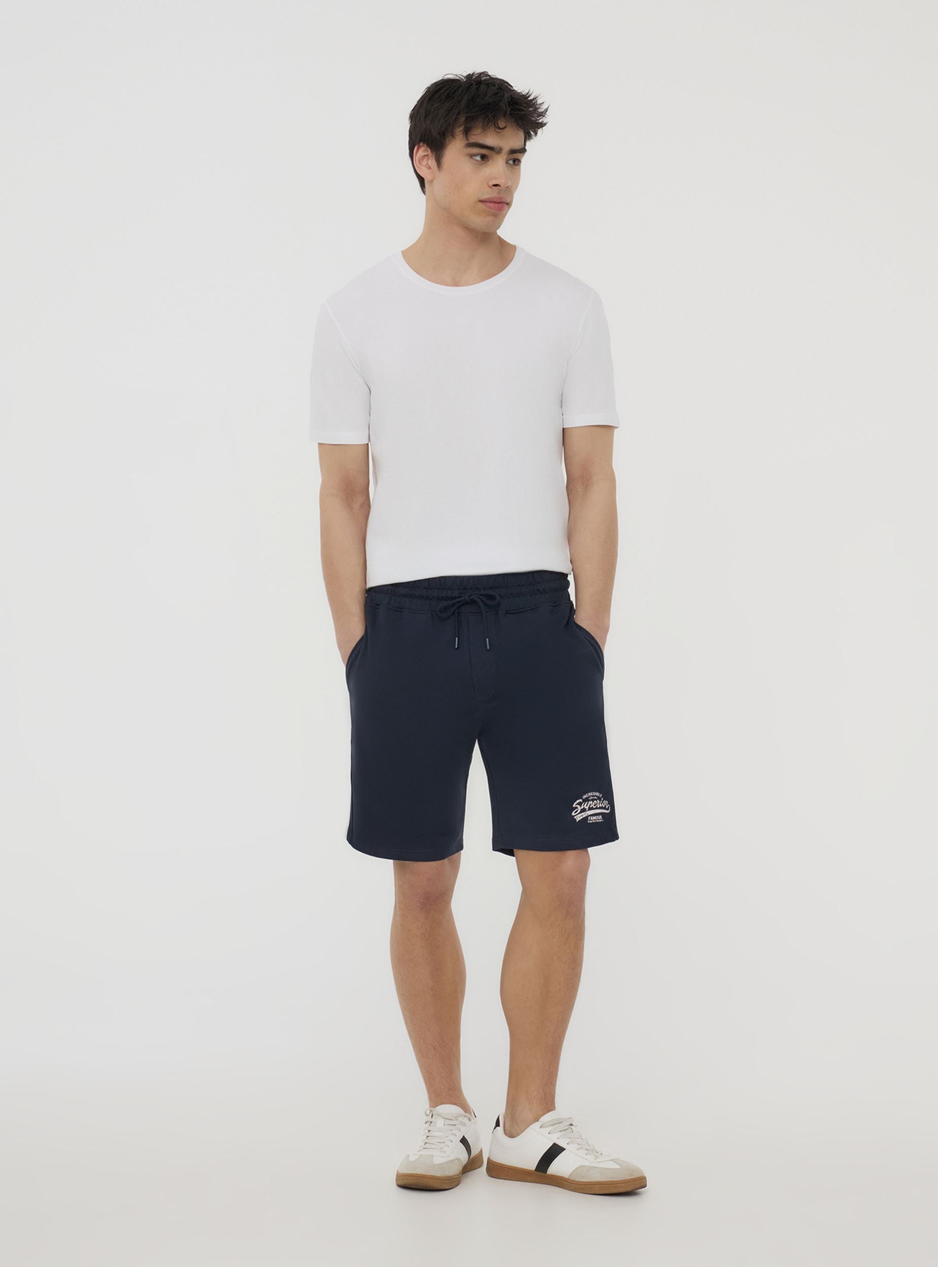Bermuda da uomo realizzati in tessuto leggero ideali per un look sportivo e dinamico, perfetti per il tempo libero o per l'attivitá fisica. Caratterizzati da una vestibilità regolare, presentano una stampa e bande laterali che aggiungono un tocco di stile. Dotati di tasche laterali e una tasca posteriore, e chiusura con coulisse, sono una scelta versatile per chi cerca comfort e praticità.