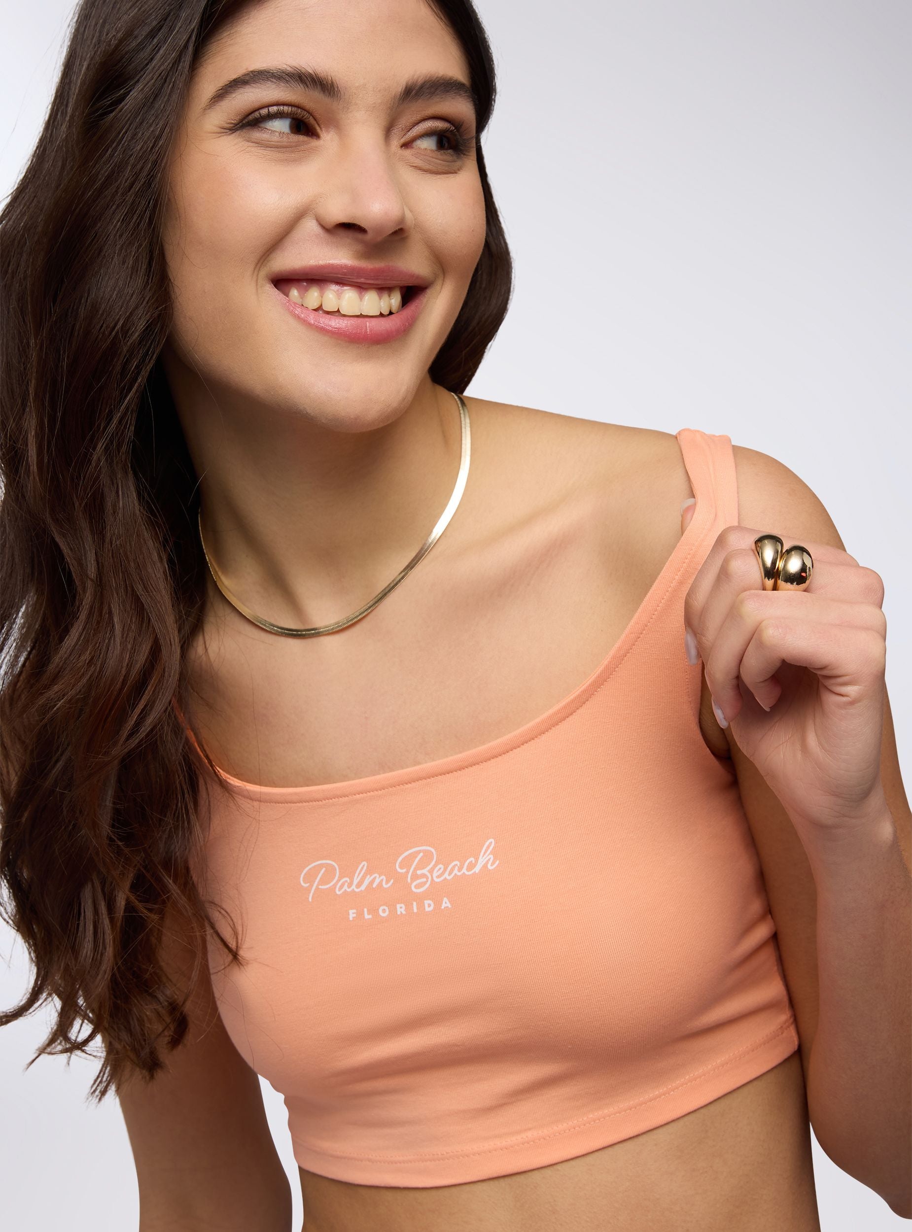 Bra da donna con un design essenziale. Caratterizzato da un comodo scollo ampio e spalline medie, garantisce un buon supporto senza costrizioni. Il dettaglio distintivo è la scritta decorativa posizionata sul davanti, che aggiunge un tocco di stile casual.Dettagli