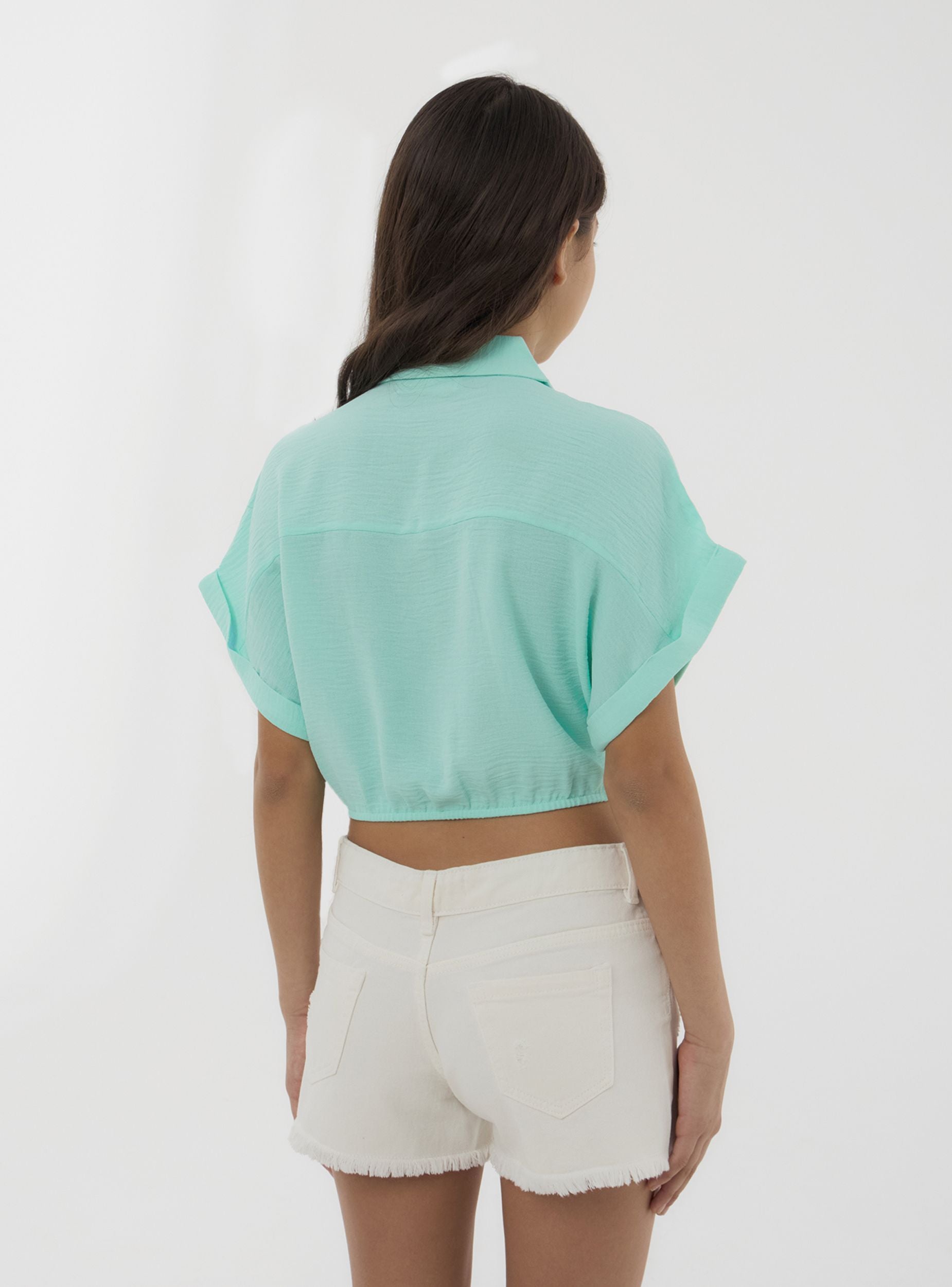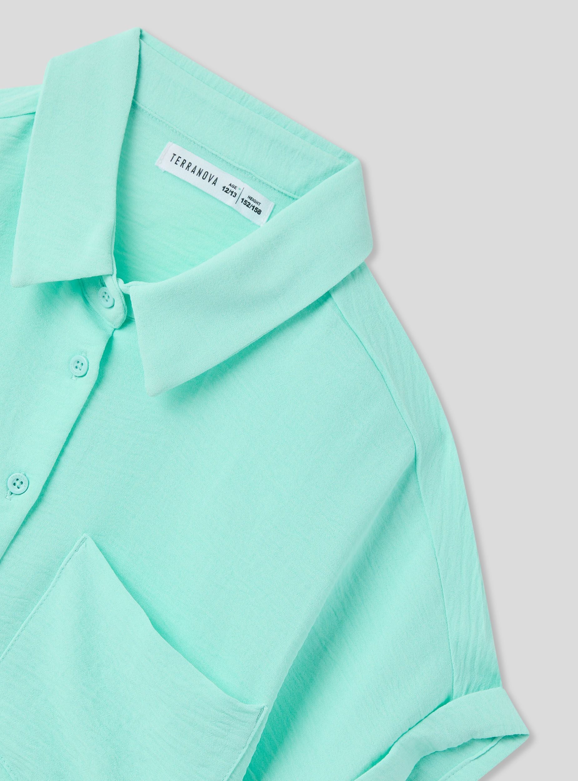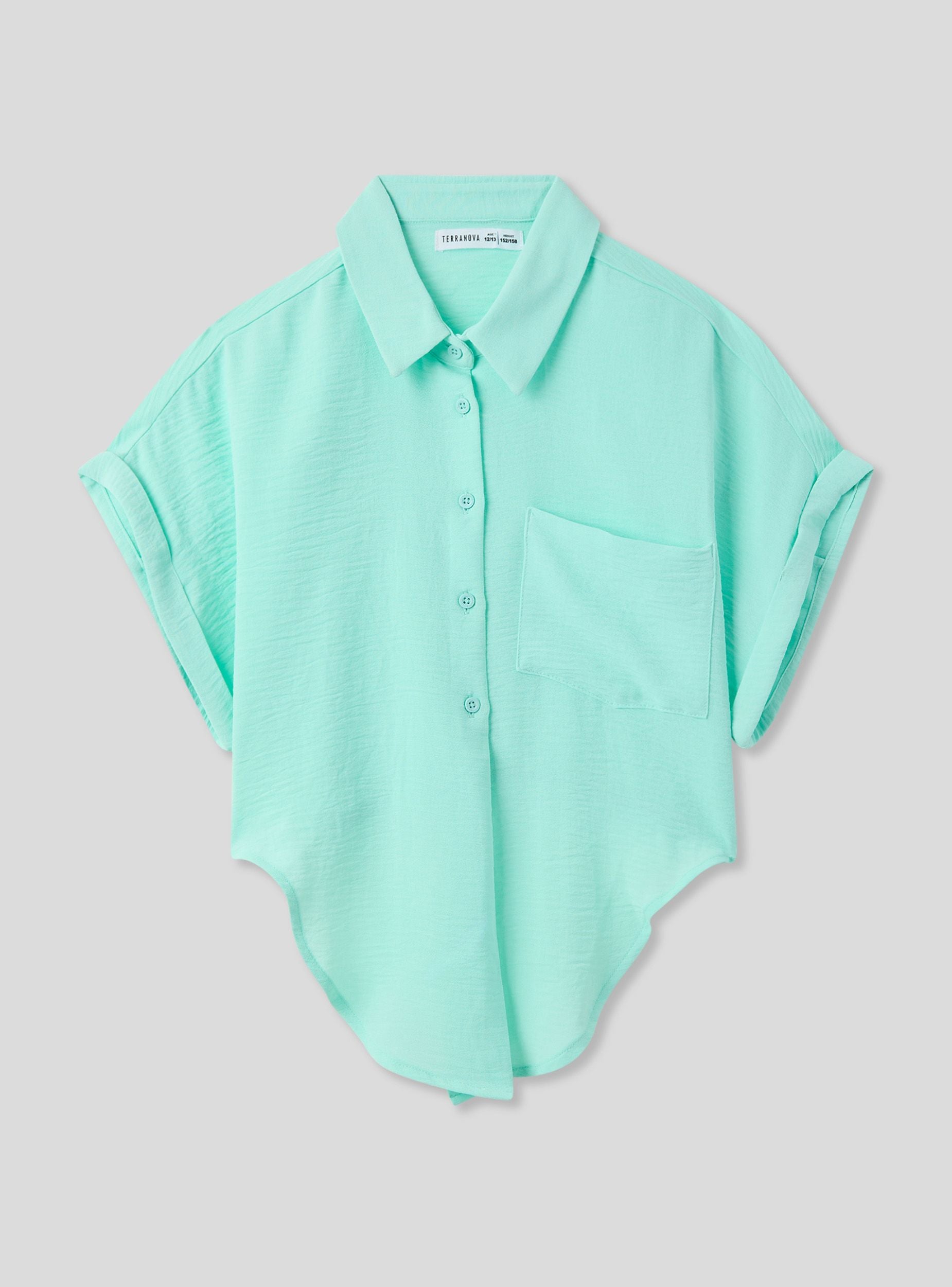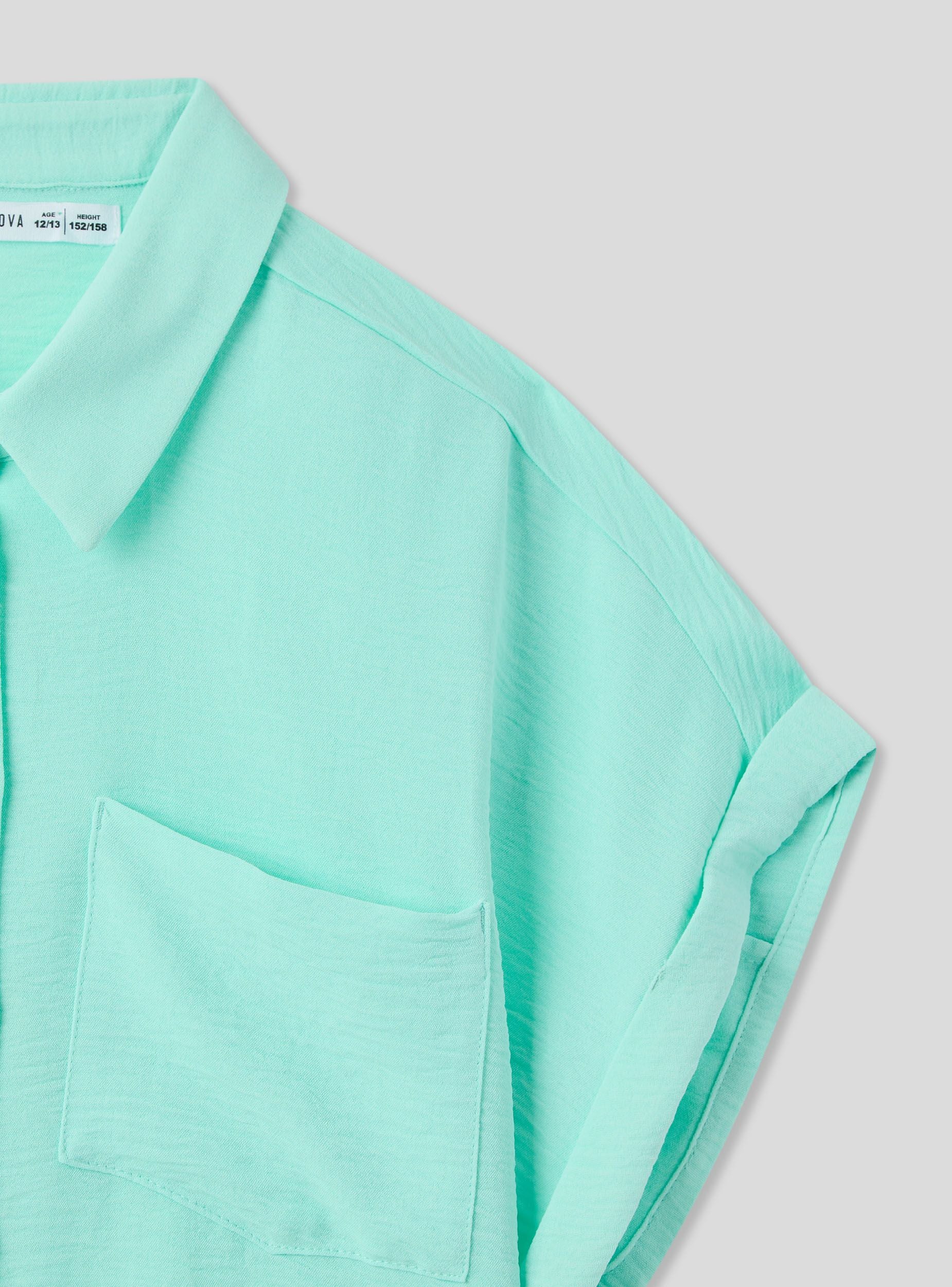 Camicia da bambina dalla linea fresca e divertente, caratterizzata da una tinta unita vivace che si adatta a ogni occasione. Il design include un nodo frontale che aggiunge un tocco giocoso, bottoni centrali per una facile vestibilità e una tasca sul petto che dona praticità. Le maniche corte morbide e il colletto completano il look, rendendola perfetta per giornate piene di allegria e stile.