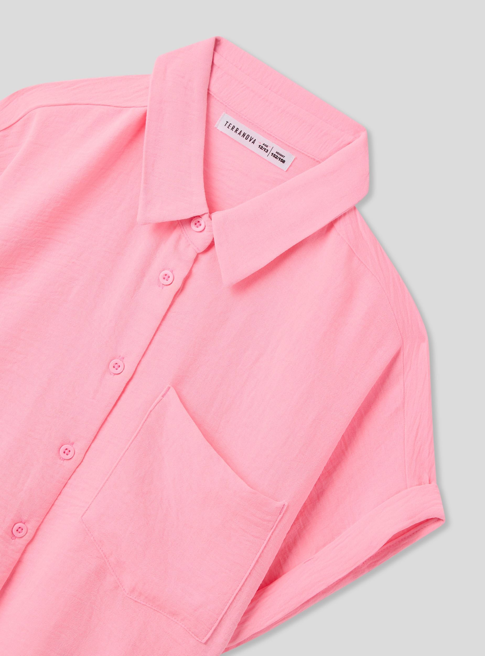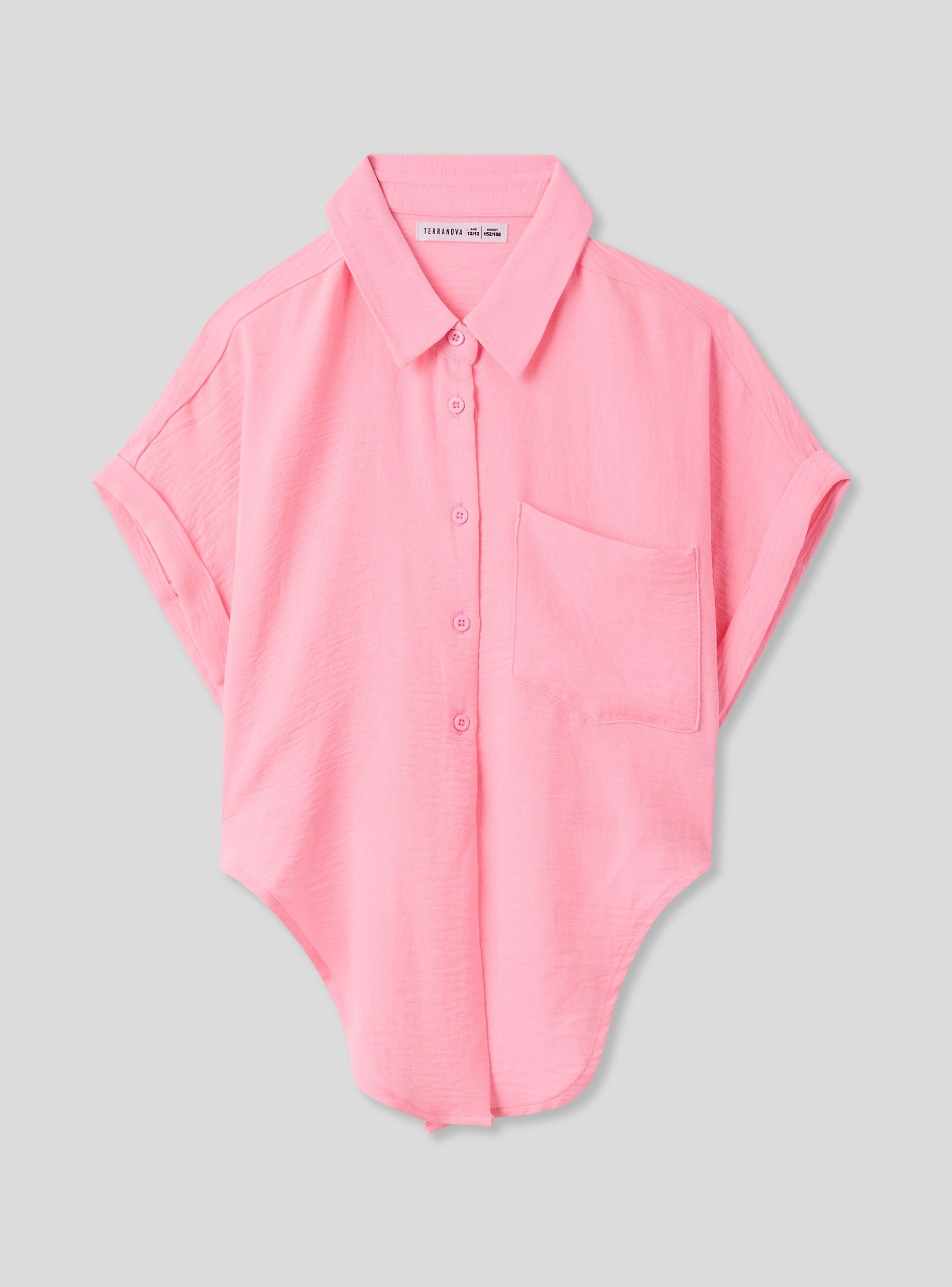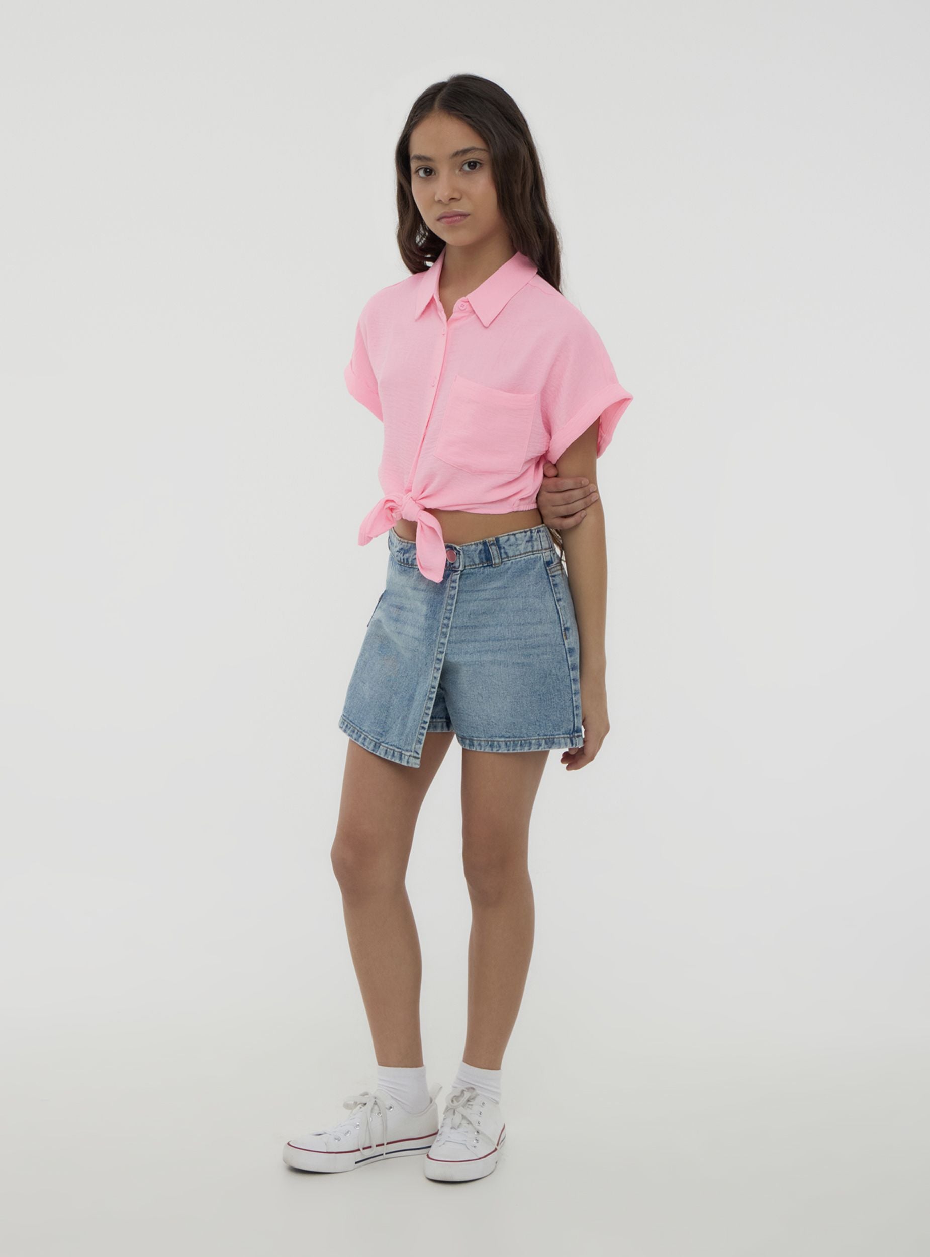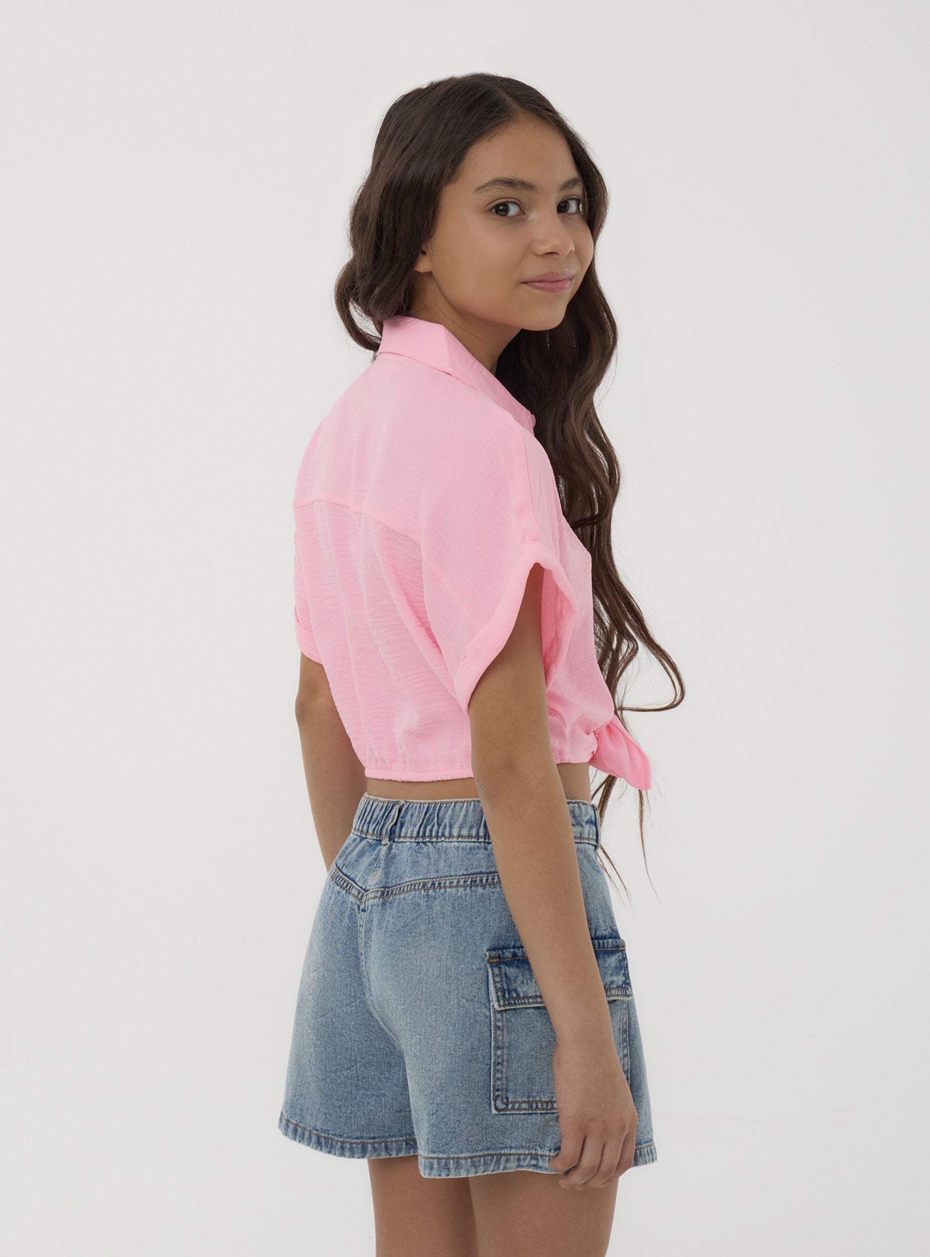Camicia da bambina dalla linea fresca e divertente, caratterizzata da una tinta unita vivace che si adatta a ogni occasione. Il design include un nodo frontale che aggiunge un tocco giocoso, bottoni centrali per una facile vestibilità e una tasca sul petto che dona praticità. Le maniche corte morbide e il colletto completano il look, rendendola perfetta per giornate piene di allegria e stile.