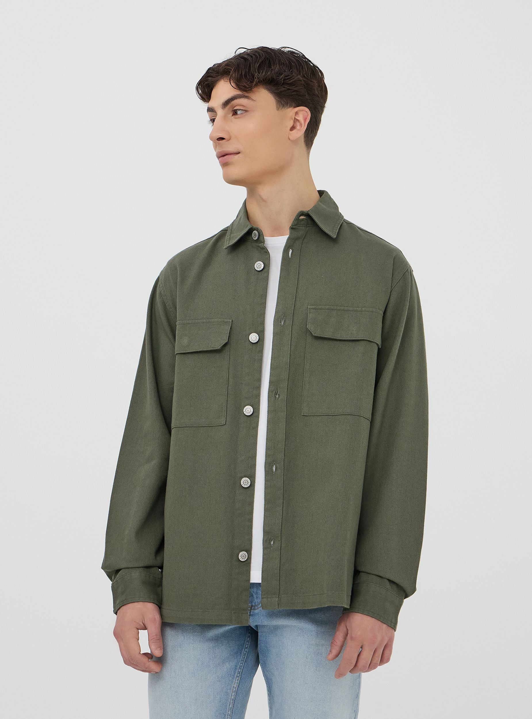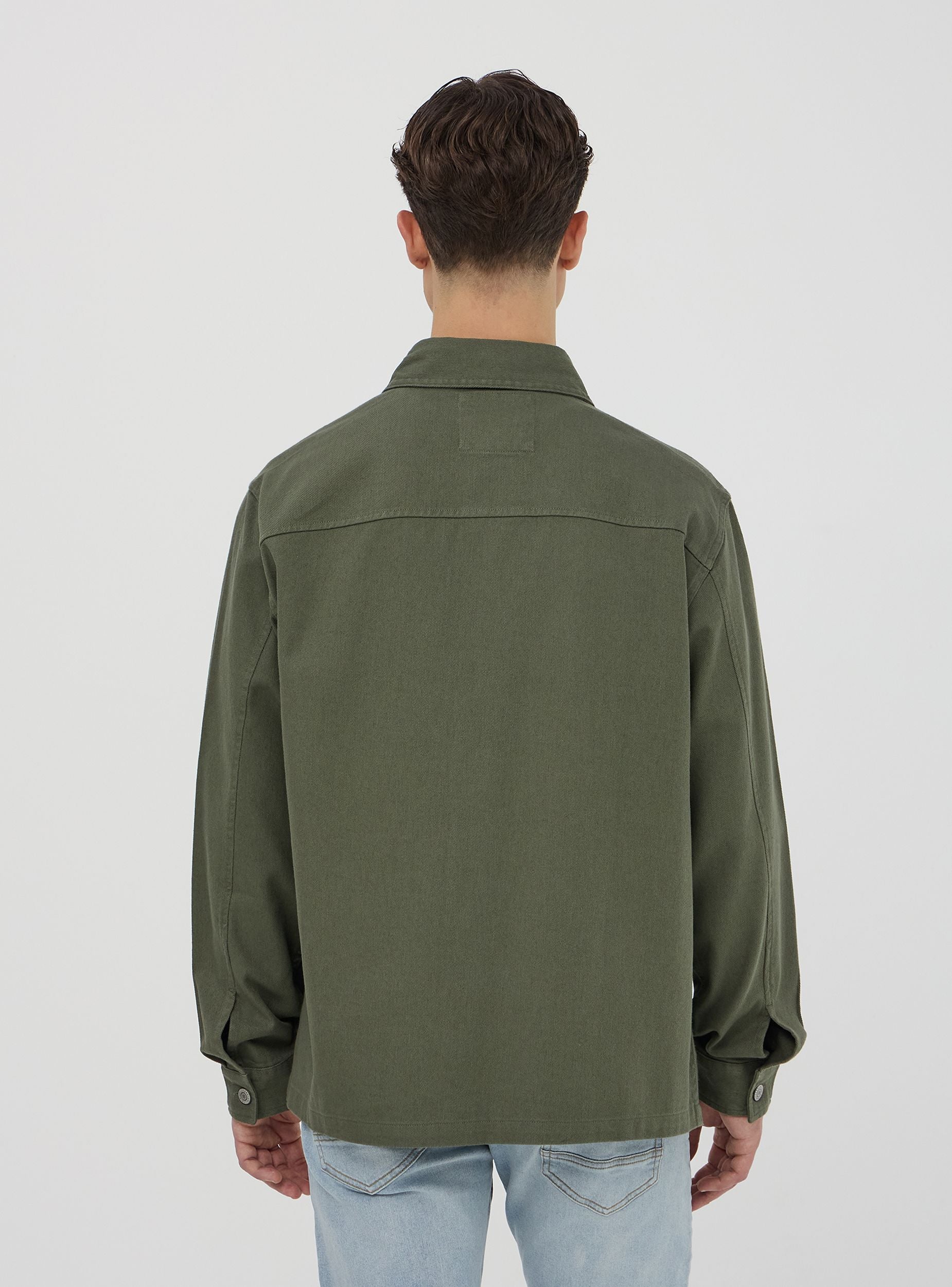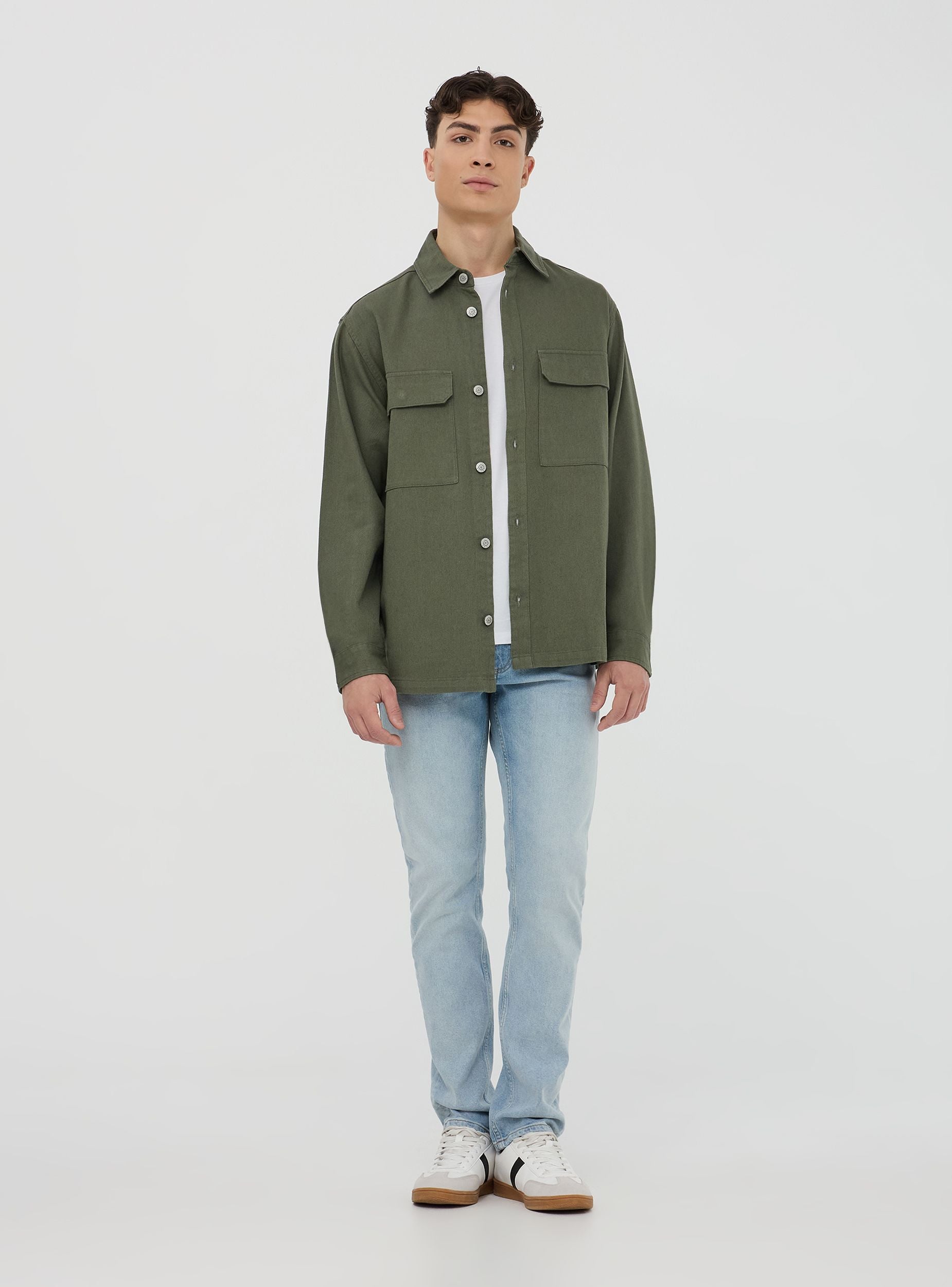 Camicia da uomo in stile shacket, ideale per un look moderno e pratico. Questo capo presenta un colletto strutturato e una chiusura con bottoni sul davanti, che garantisce versatilità e comodità. Le maniche lunghe sono completate da polsini con bottoni, mentre due ampie tasche sul petto, dotate di bottoni a pressione, aggiungono funzionalità e carattere al design. Modello in twill di cotone a tinta unita. Perfetta per un outfit casual ma curato nei dettagli.