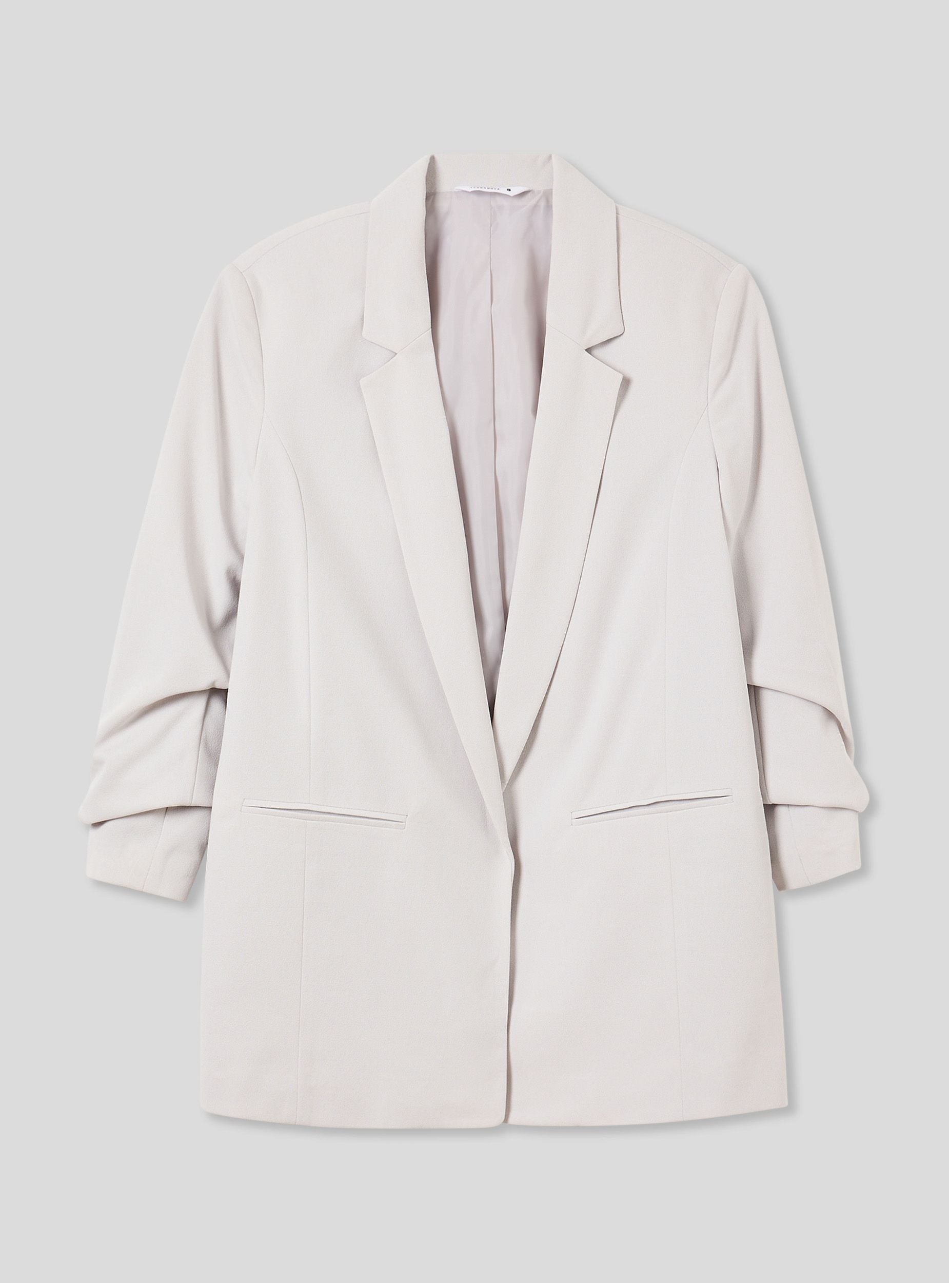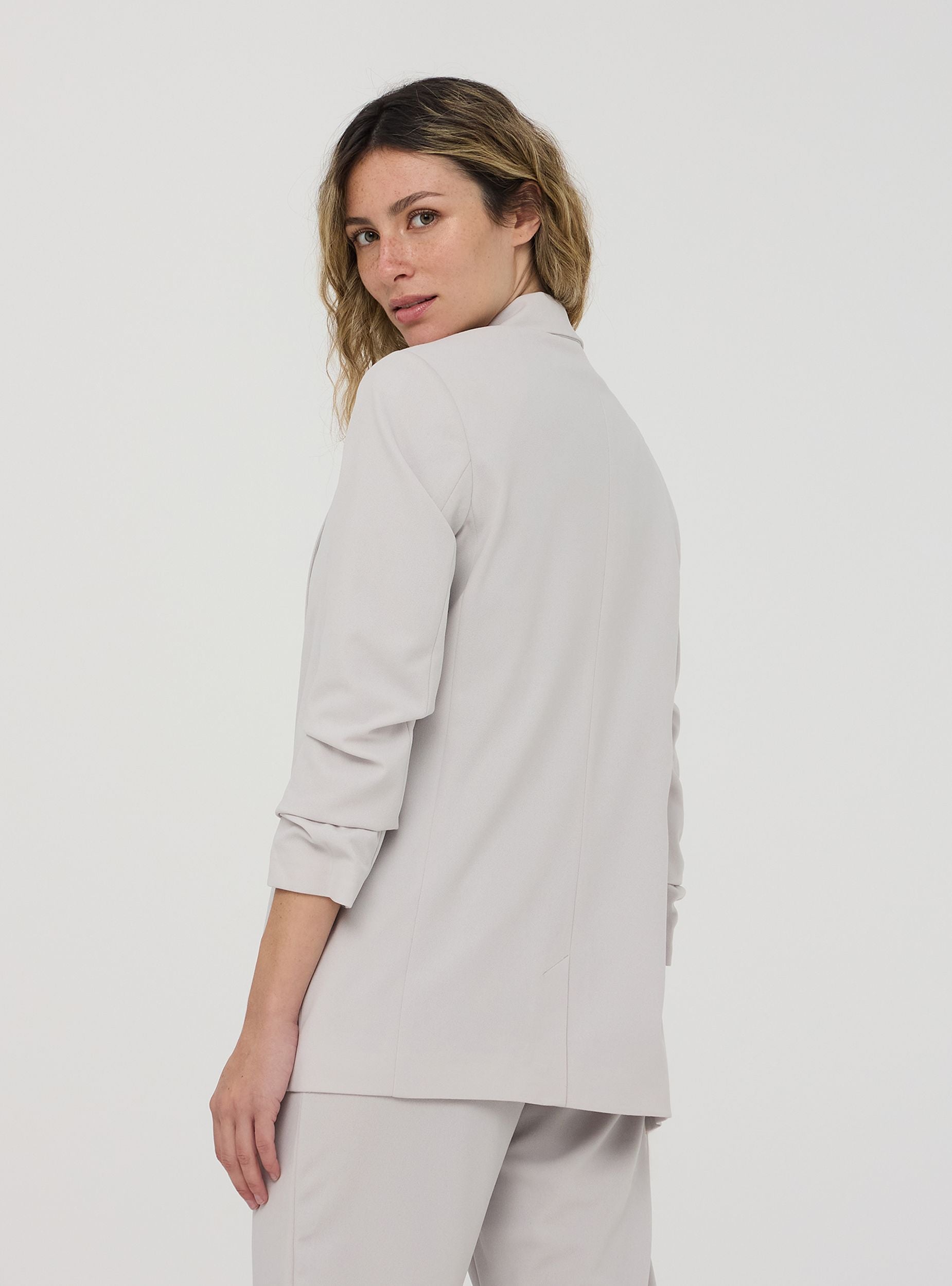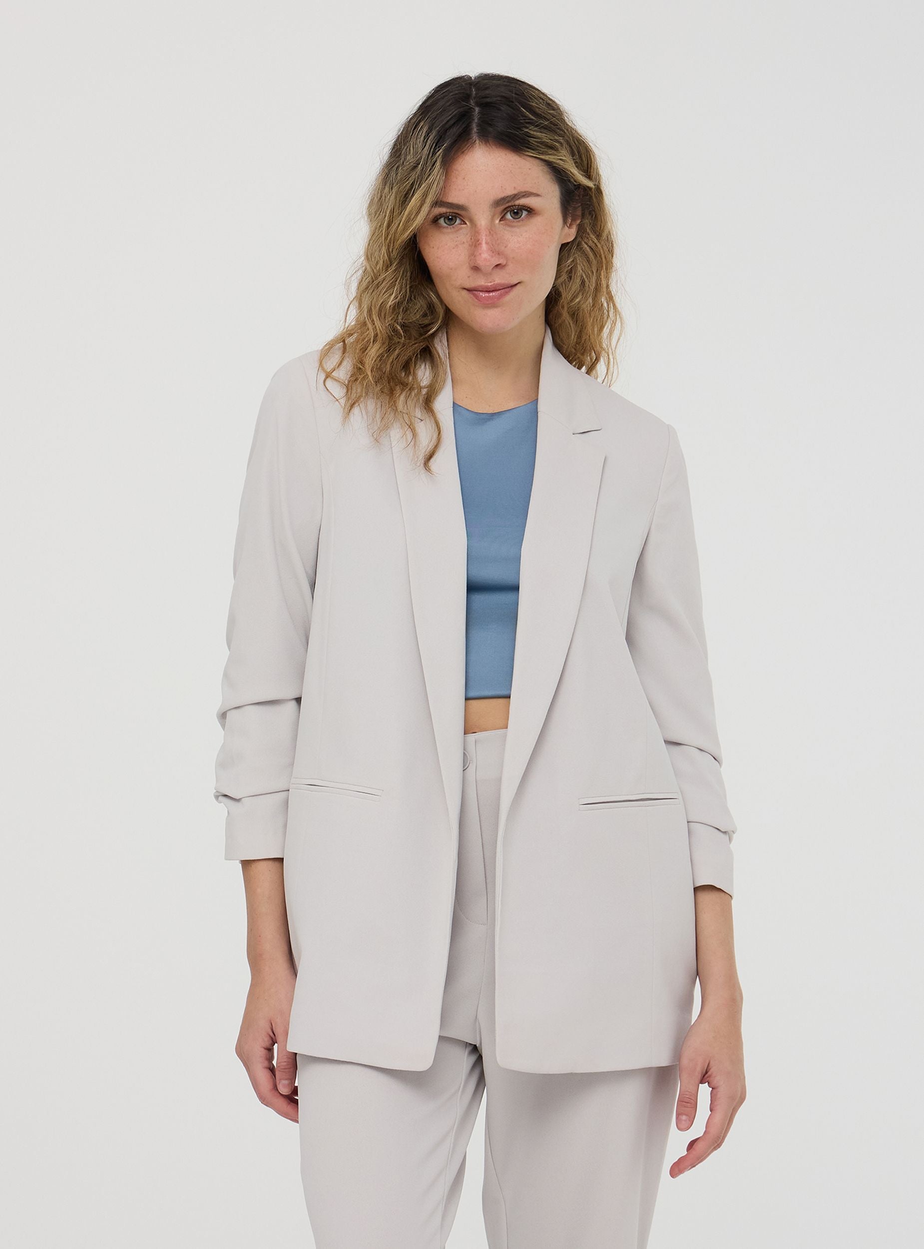 Giacca da donna elegante e versatile, caratterizzata da una linea minimal a tinta unita e un design aperto senza chiusure. Le maniche arricciate aggiungono un tocco moderno e dinamico, mentre i revers definiscono uno stile sofisticato. Ideale per occasioni formali o casual chic, si abbina perfettamente a pantaloni a sigaretta, gonne midi o jeans per un look rilassato ma curato.