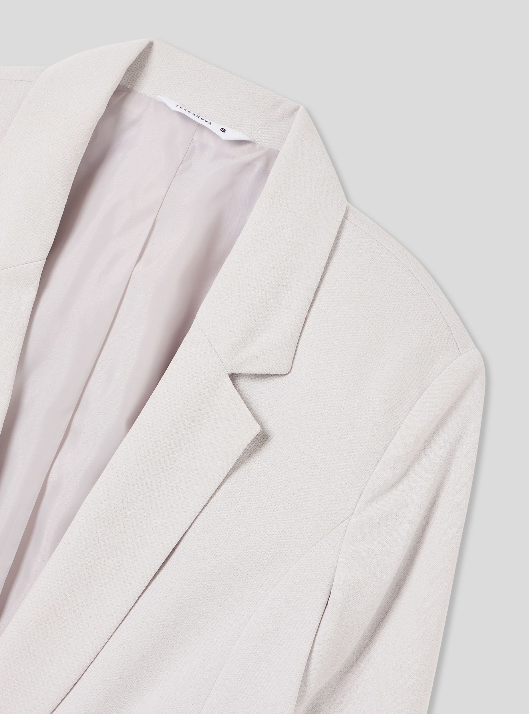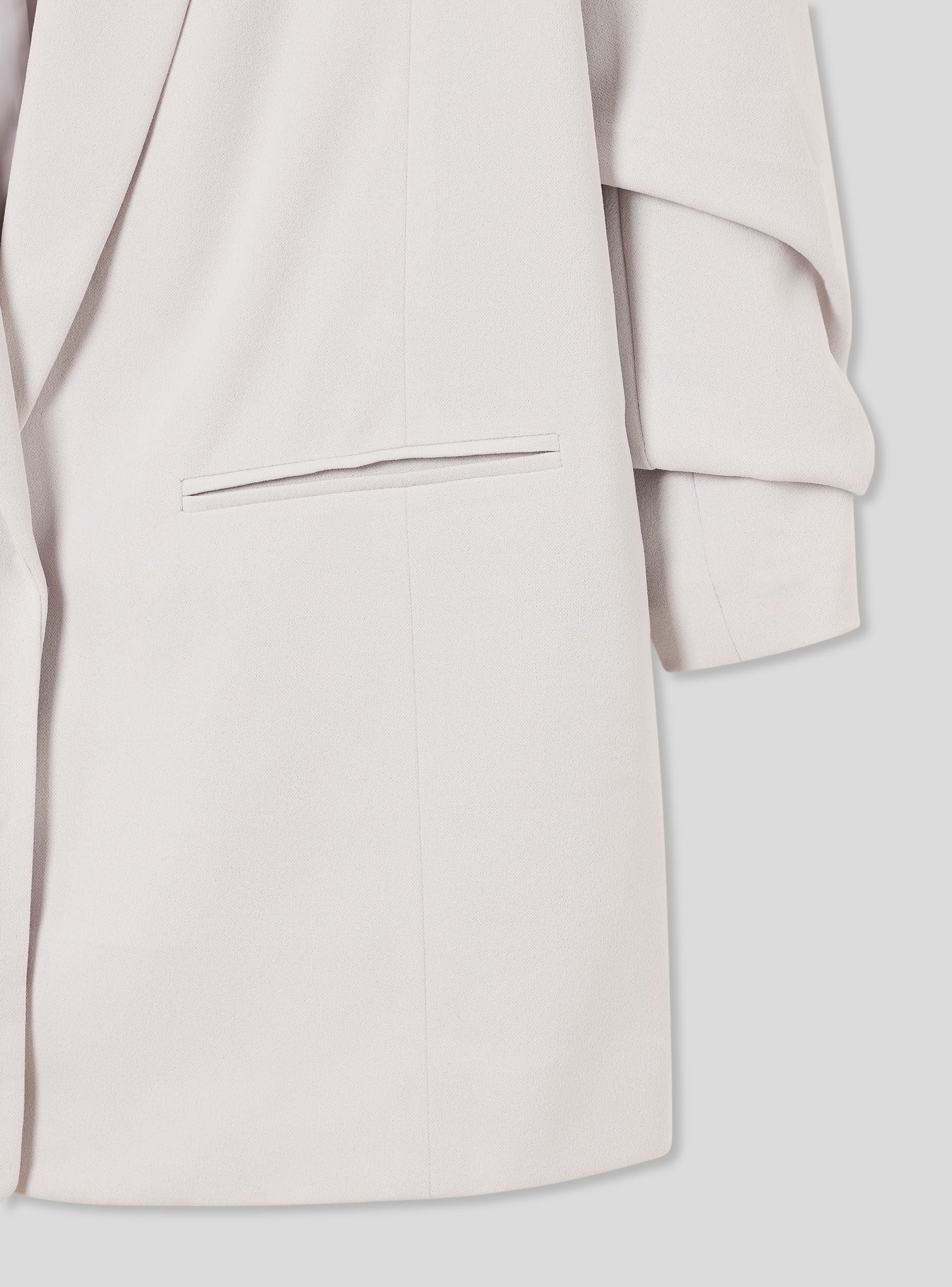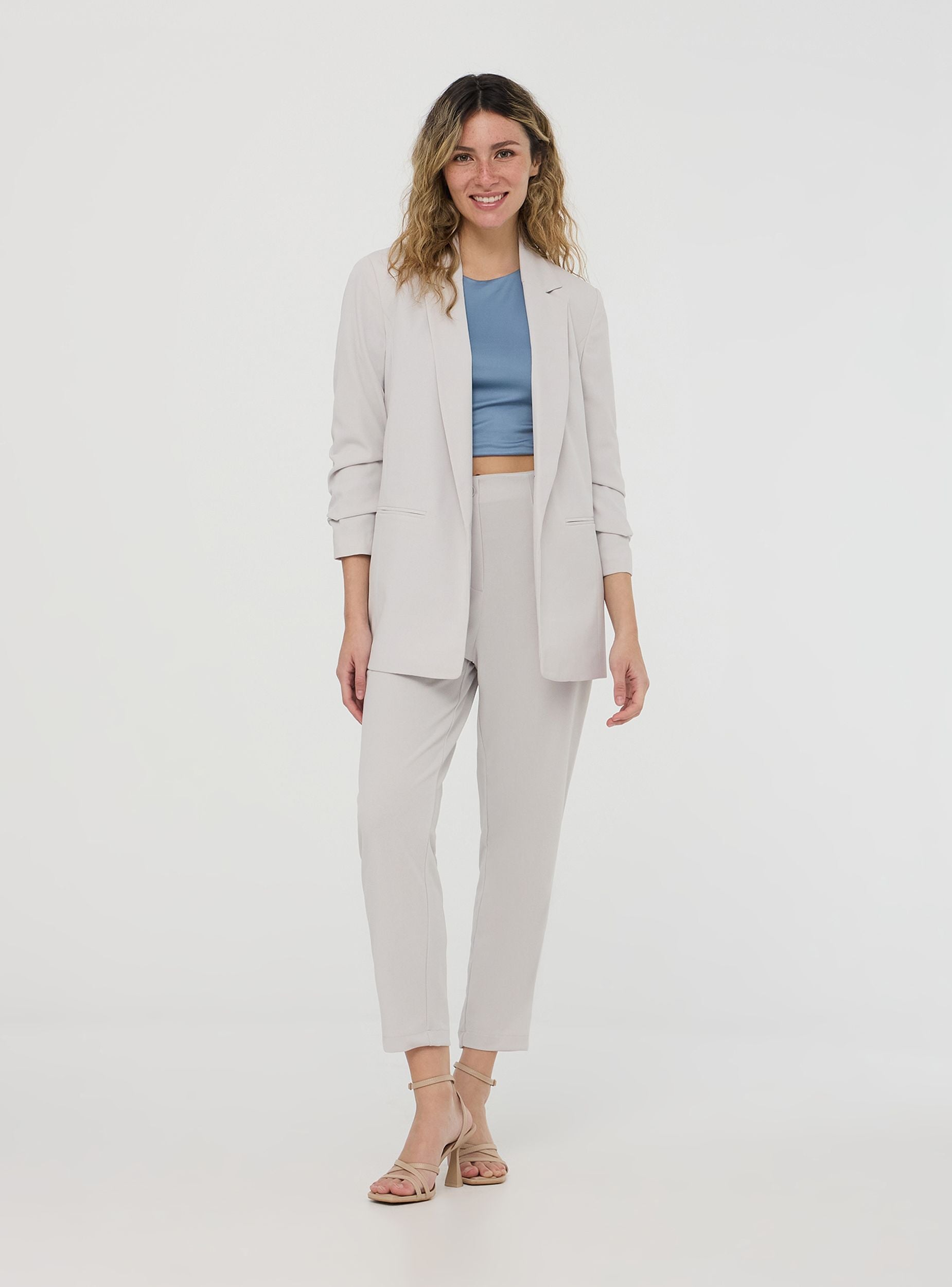 Giacca da donna elegante e versatile, caratterizzata da una linea minimal a tinta unita e un design aperto senza chiusure. Le maniche arricciate aggiungono un tocco moderno e dinamico, mentre i revers definiscono uno stile sofisticato. Ideale per occasioni formali o casual chic, si abbina perfettamente a pantaloni a sigaretta, gonne midi o jeans per un look rilassato ma curato.