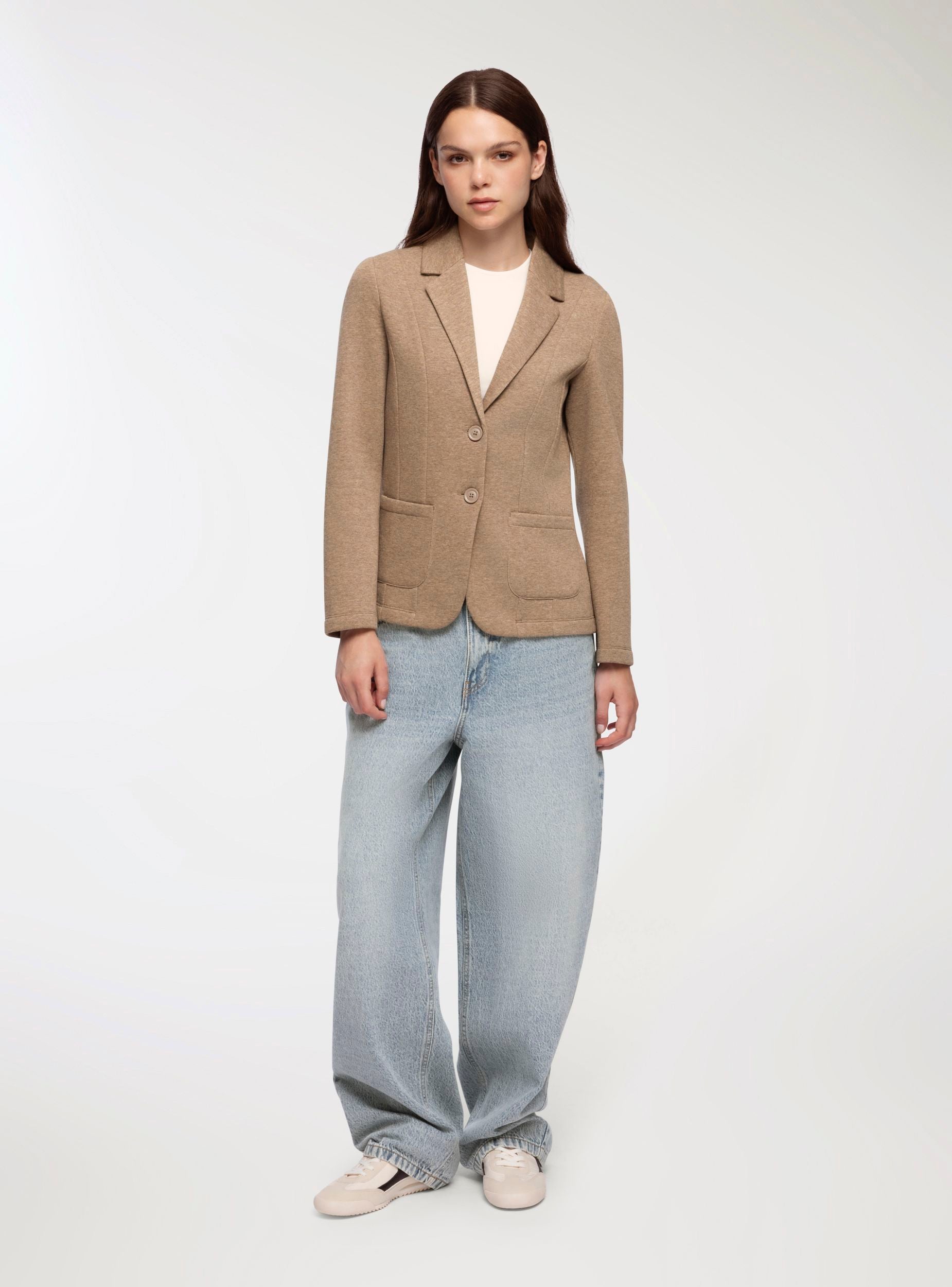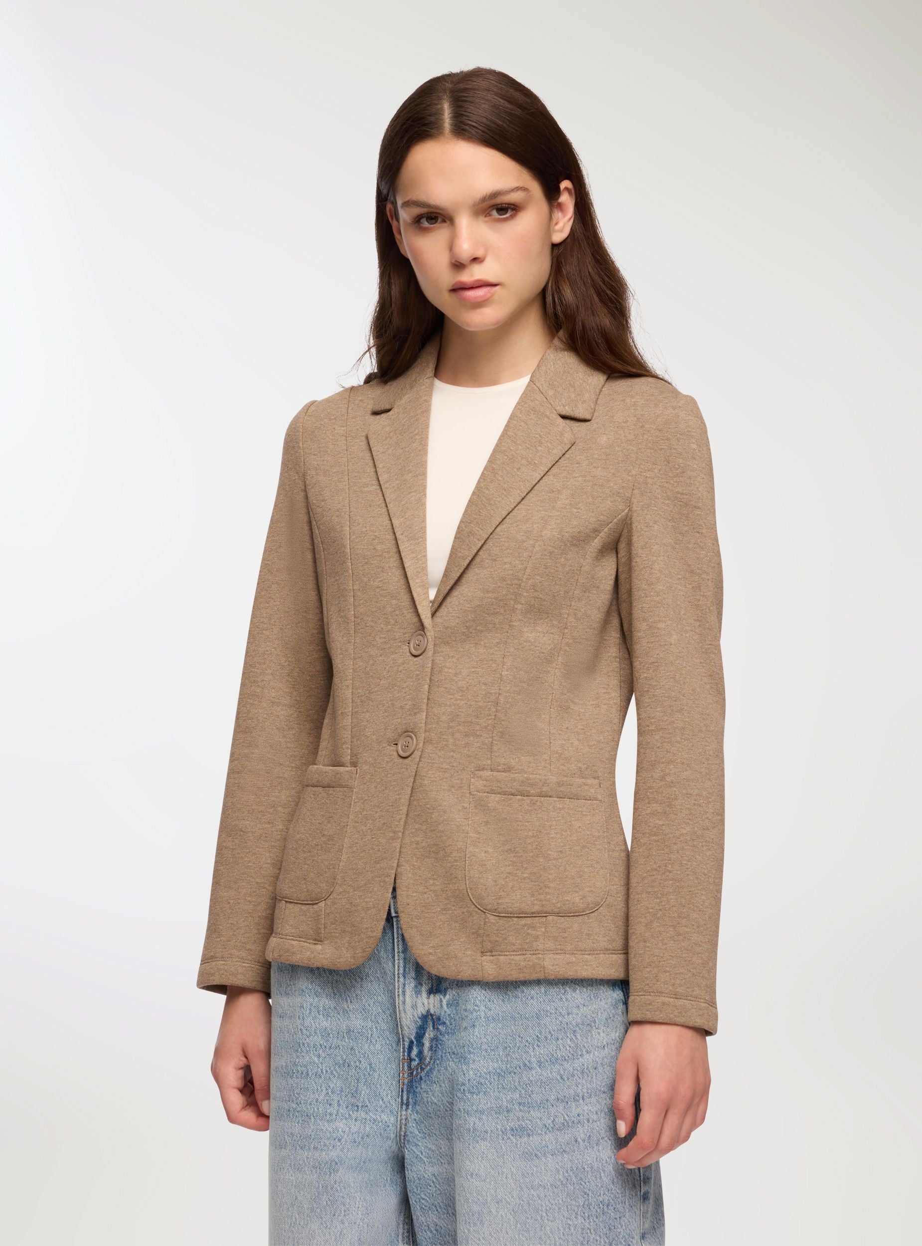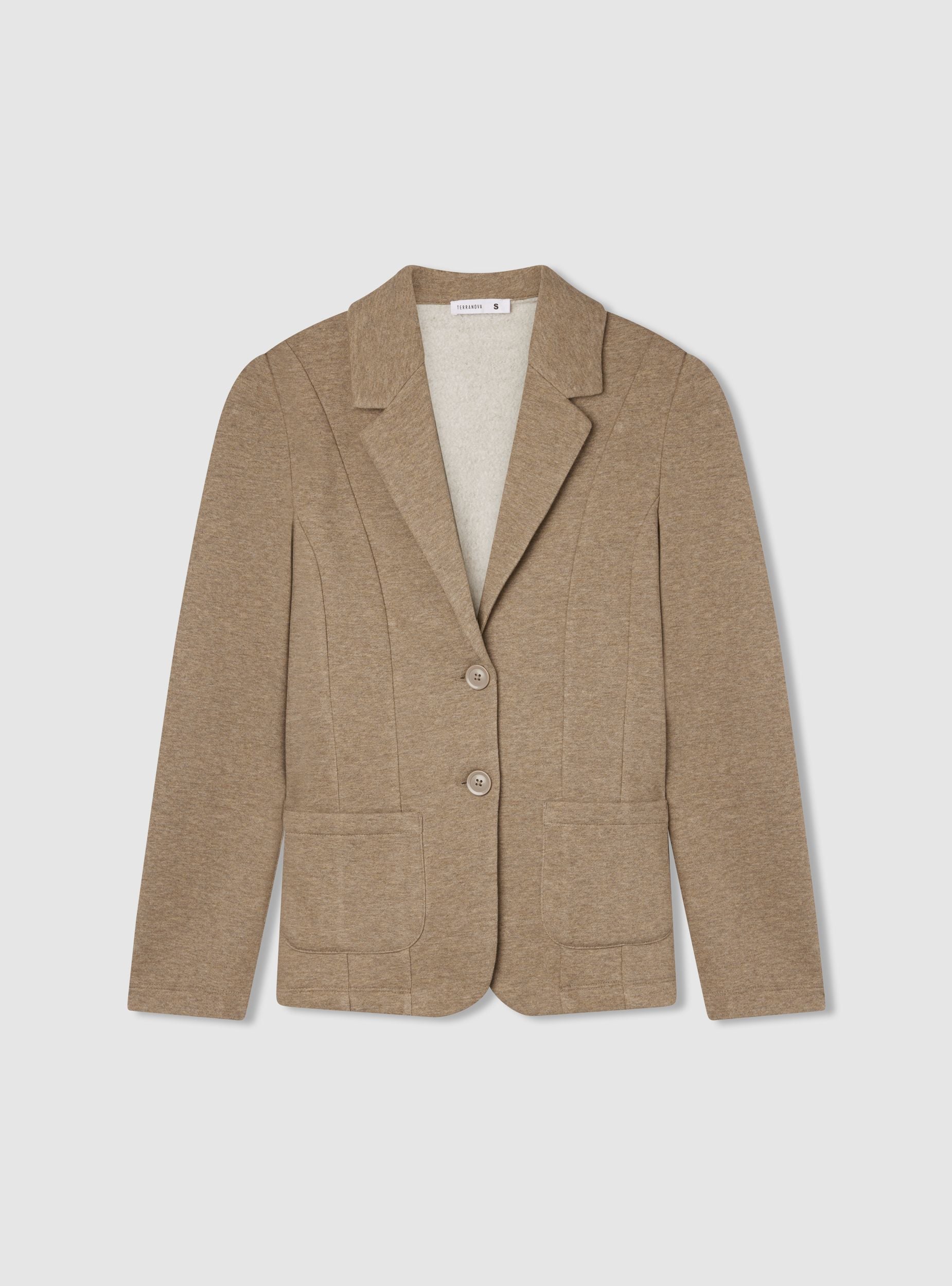 Giacca in felpa da donna con chiusura a bottoni. Presenta un design elegante con collo a revers e maniche lunghe, perfetta per completare un outfit casual chic. Dotata di tasche frontali applicate per praticità e stile, questa giacca si distingue per la sua vestibilità regolare e il suo look raffinato.Dettagli