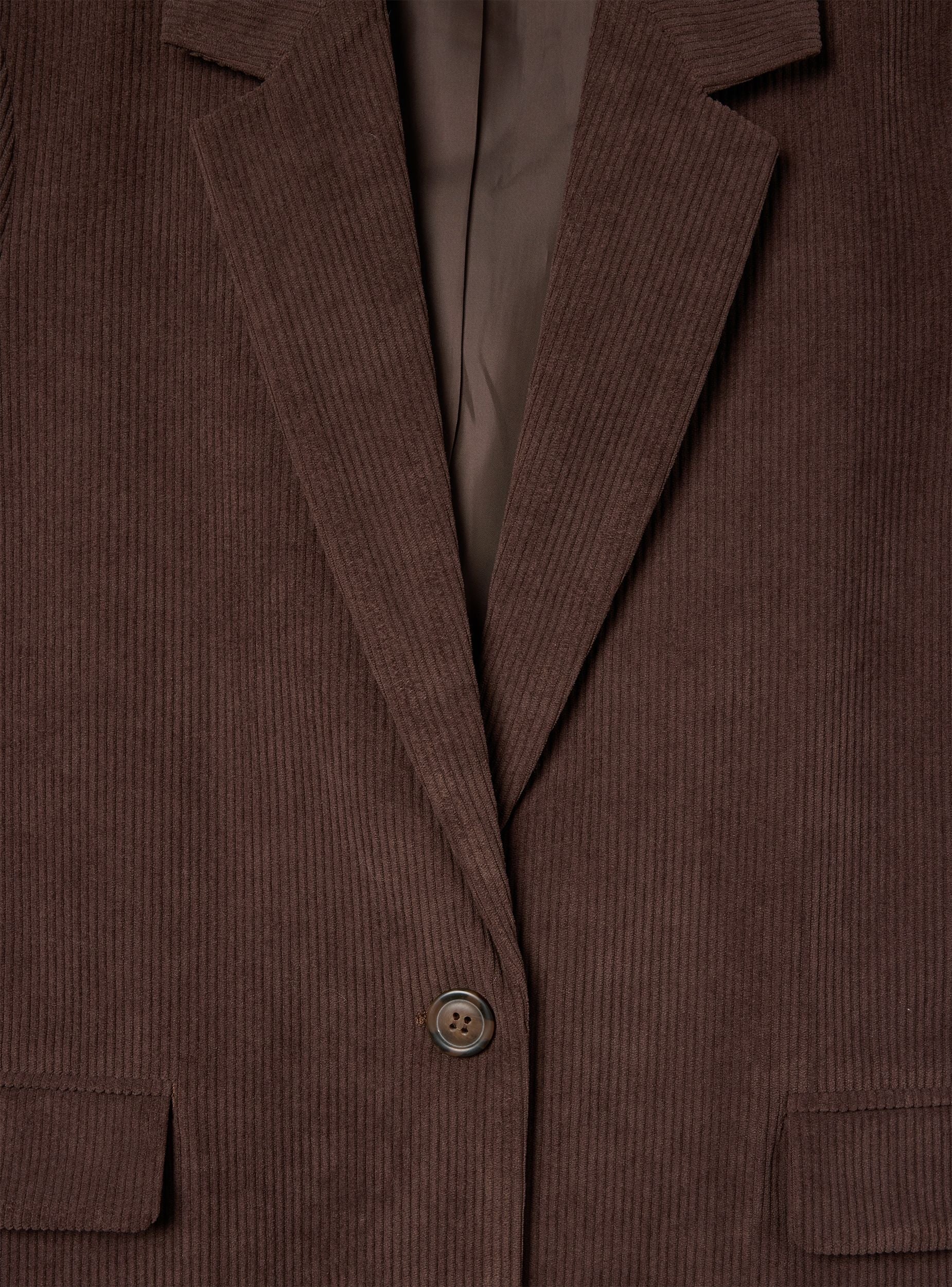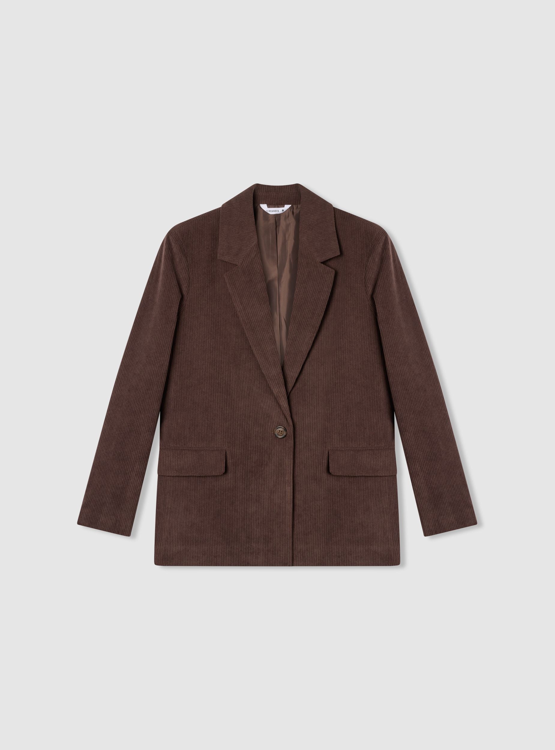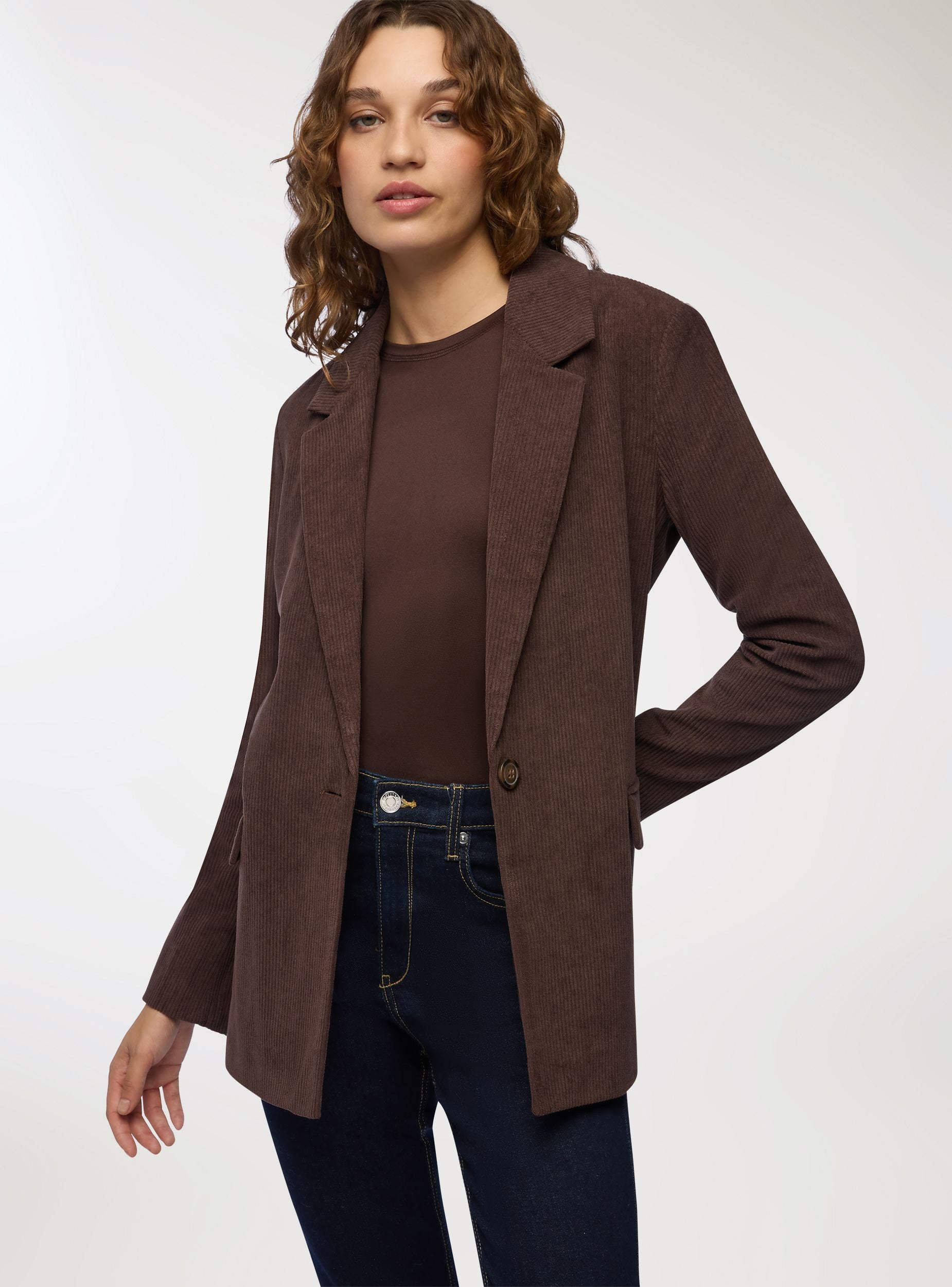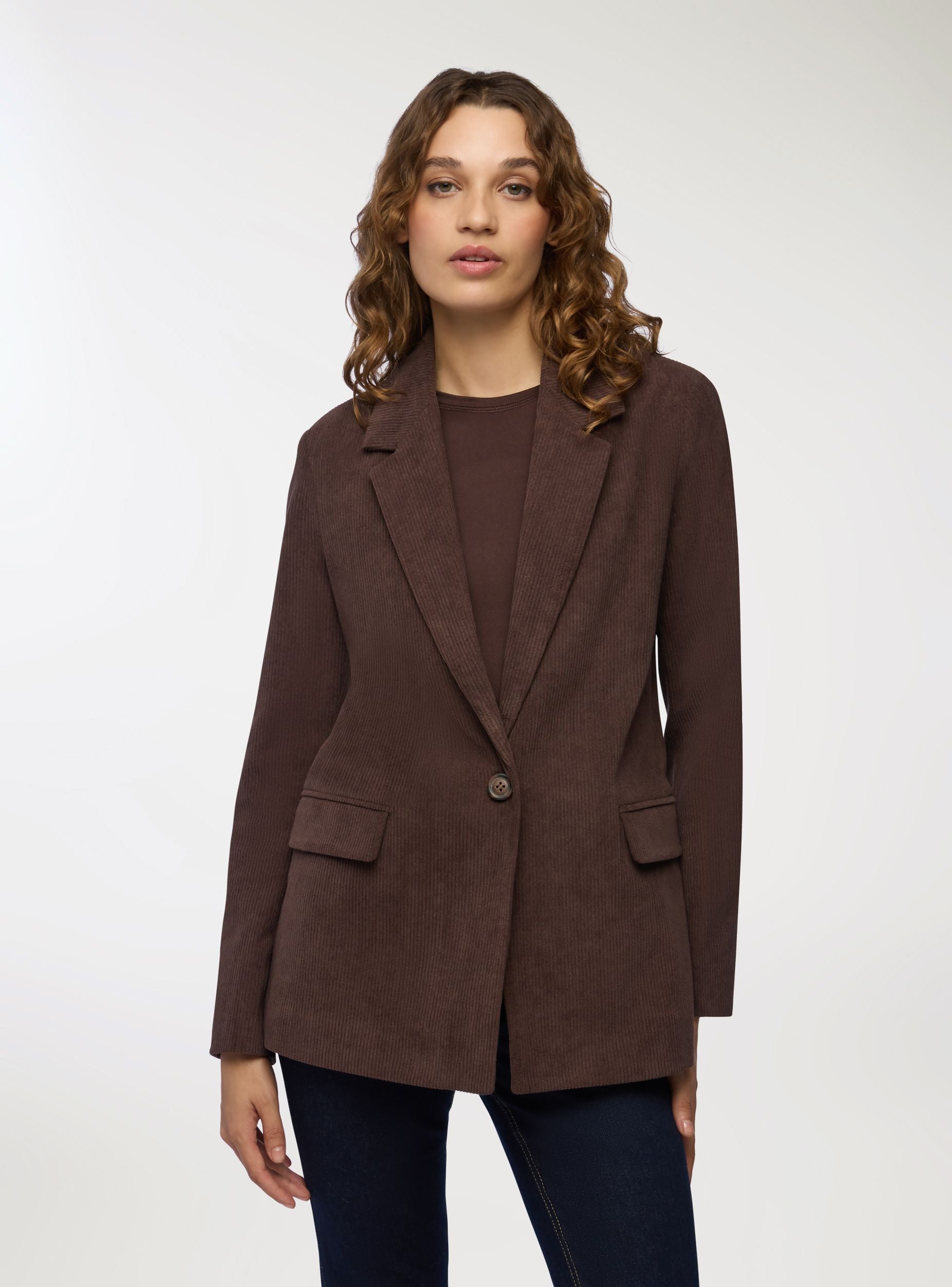 Giacca da donna con design monopetto e chiusura a bottone. Presenta un taglio elegante e moderno, ideale per occasioni formali o per un look professionale. Dotata di tasche frontali con patta, offre praticità e stile. Tessuto rigato a tinta unita effetto velluto. La vestibilità regolare garantisce comfort e versatilità, perfetta da abbinare a pantaloni o gonne per un outfit sofisticato.