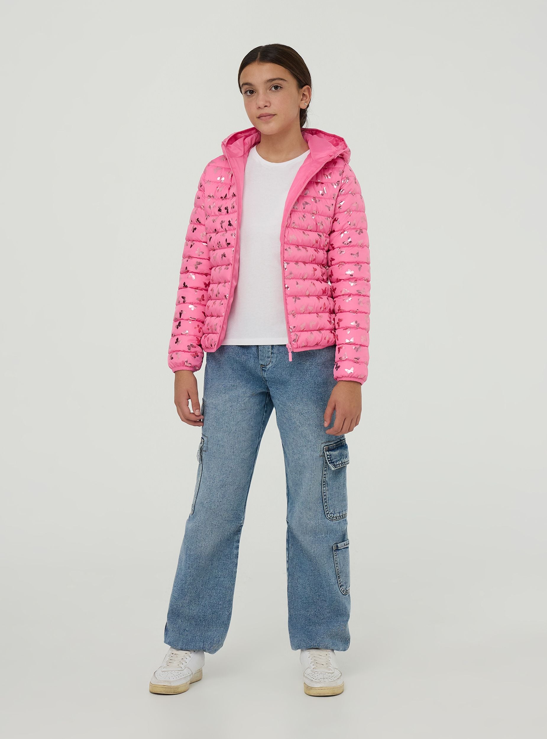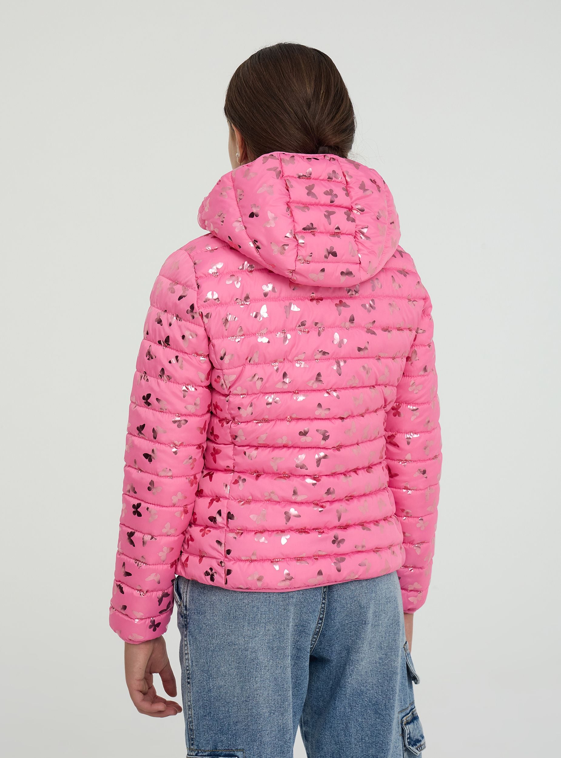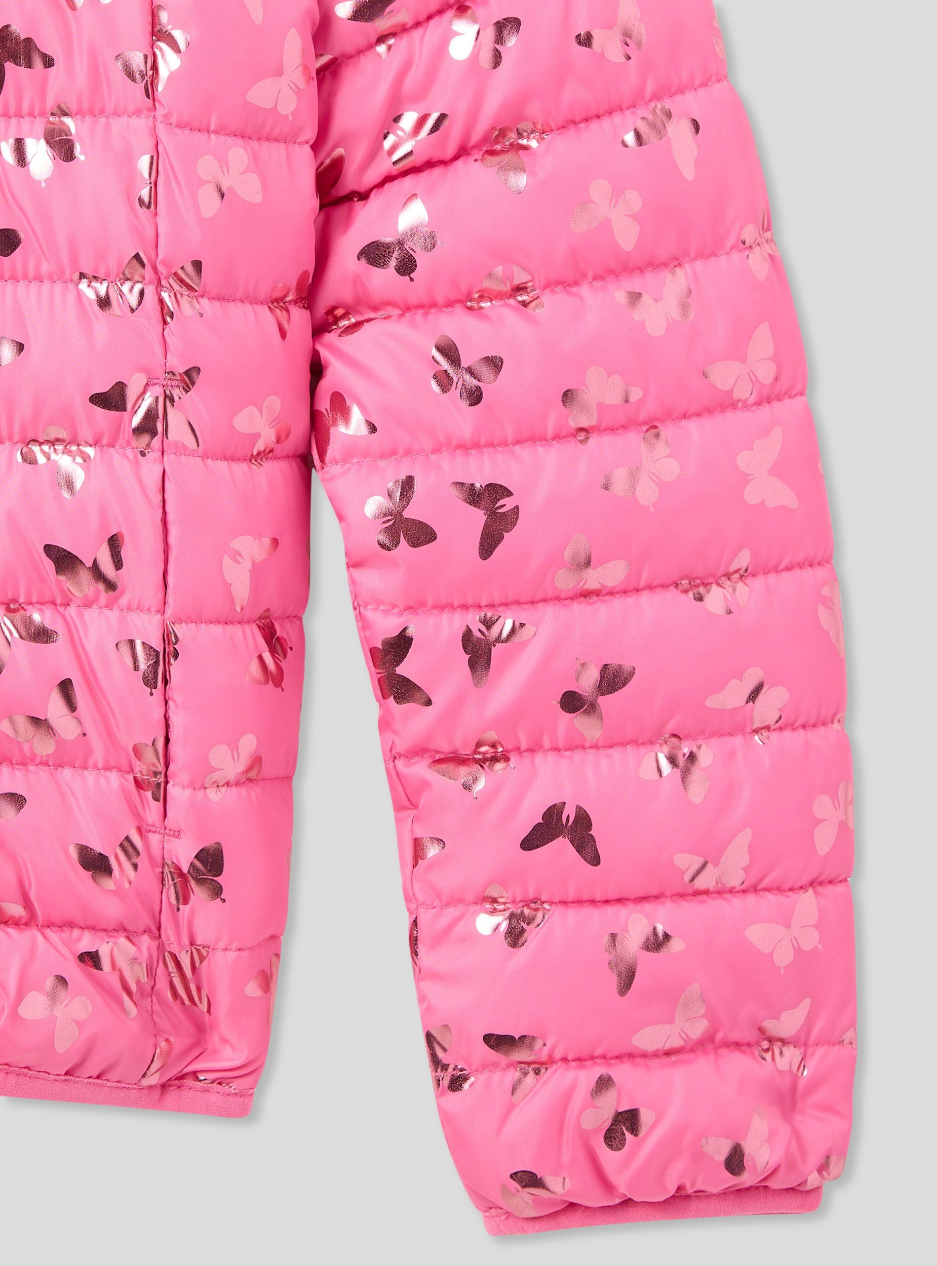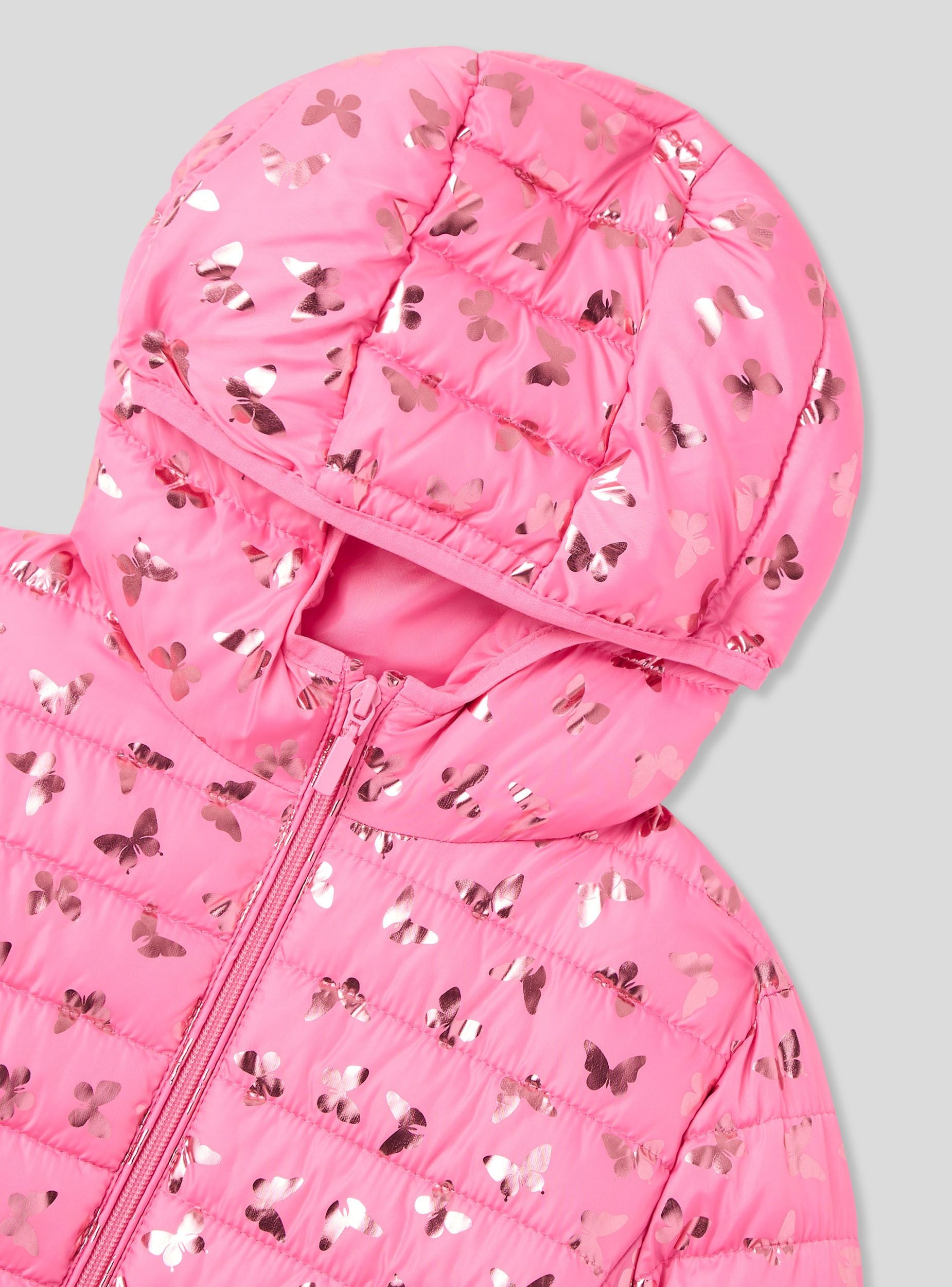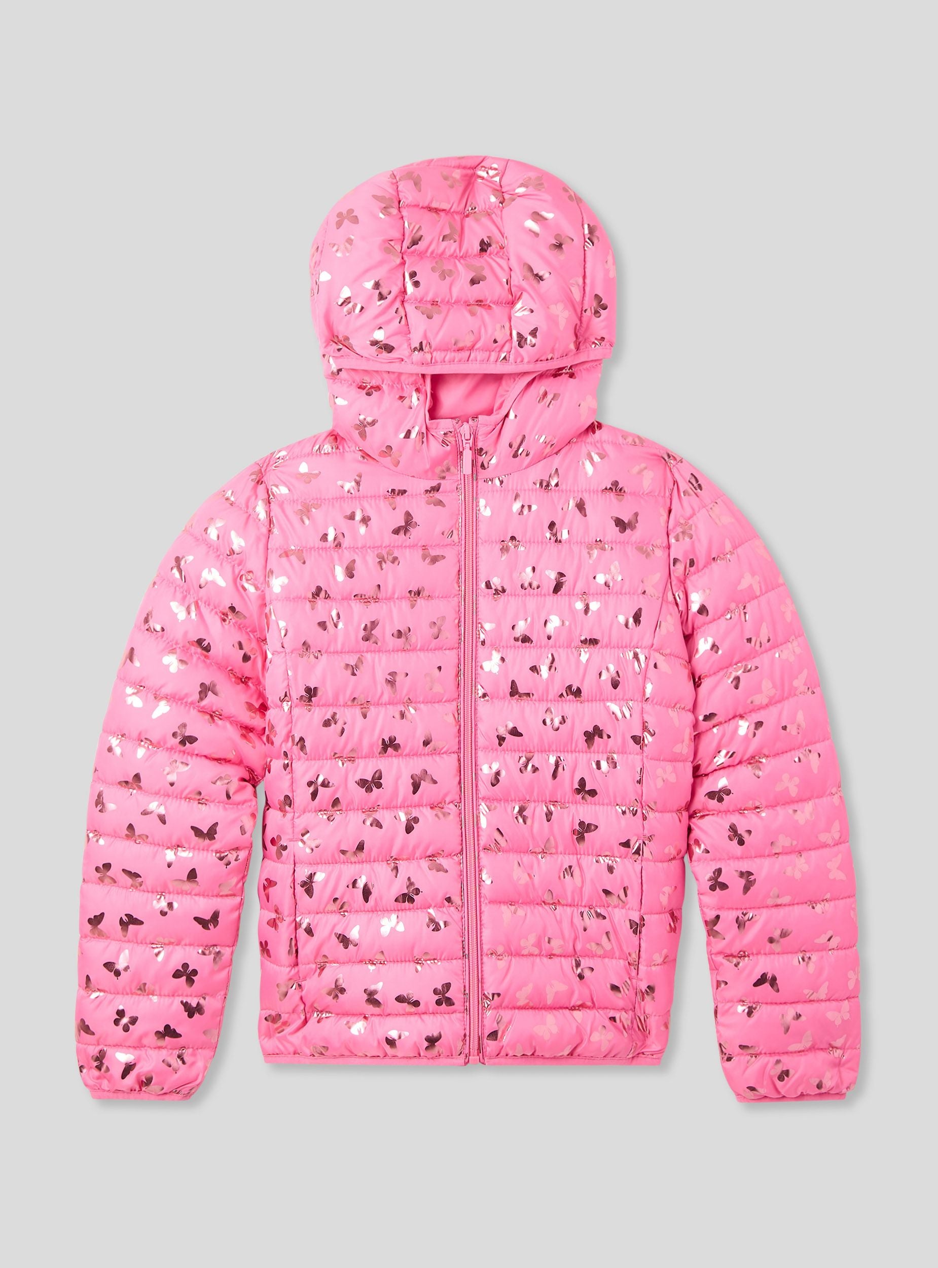 Giubbino da bambina ideale per le mezze stagioni, con maniche lunghe e cappuccio per garantire comfort e protezione. Caratterizzato da una chiusura frontale con zip e pratiche tasche laterali. L’imbottitura leggera da 100 grammi lo rende perfetto per un utilizzo quotidiano. La tinta unita si arricchisce con una fantasia di farfalle per uno stile vivace e trendy.