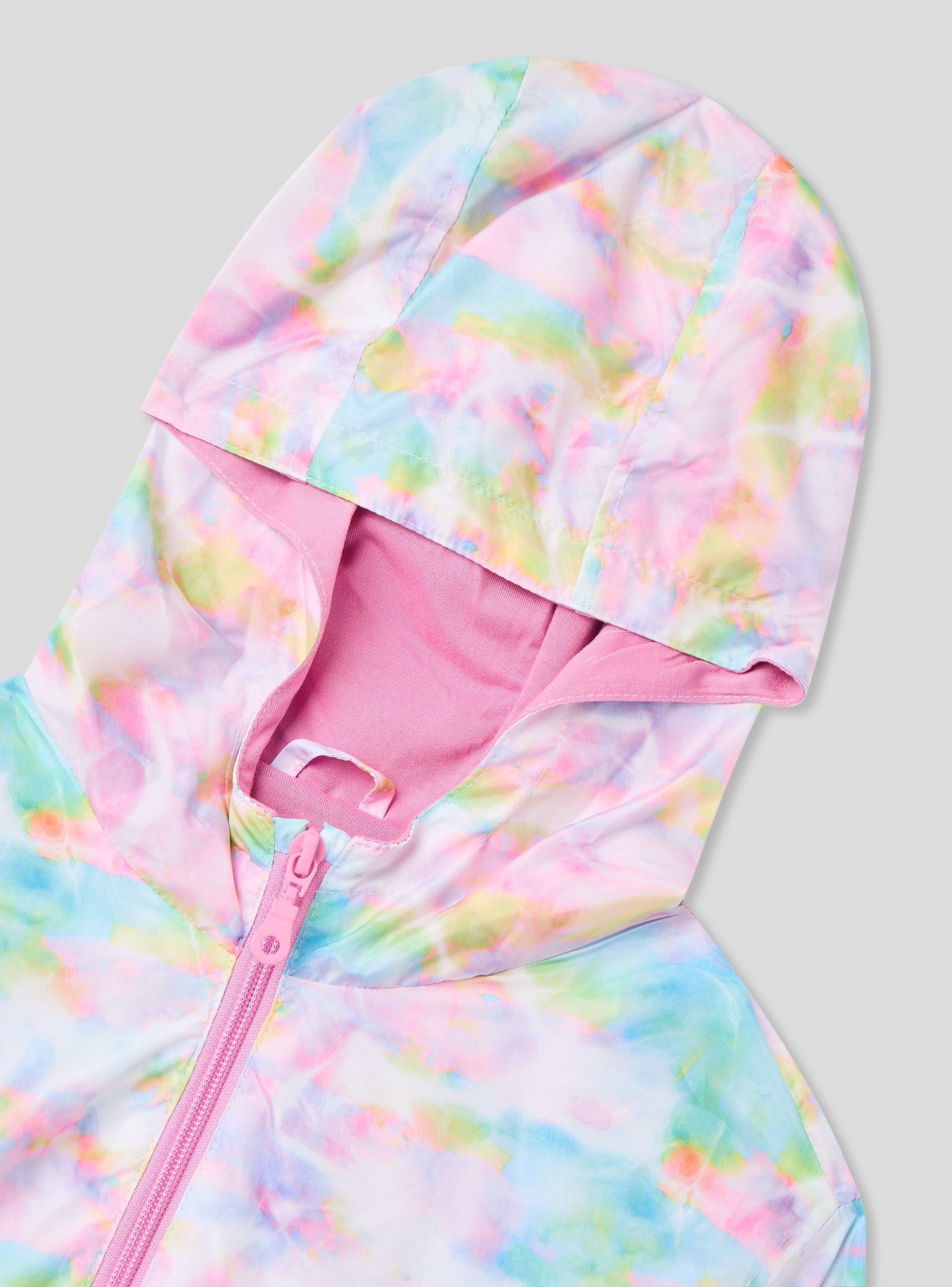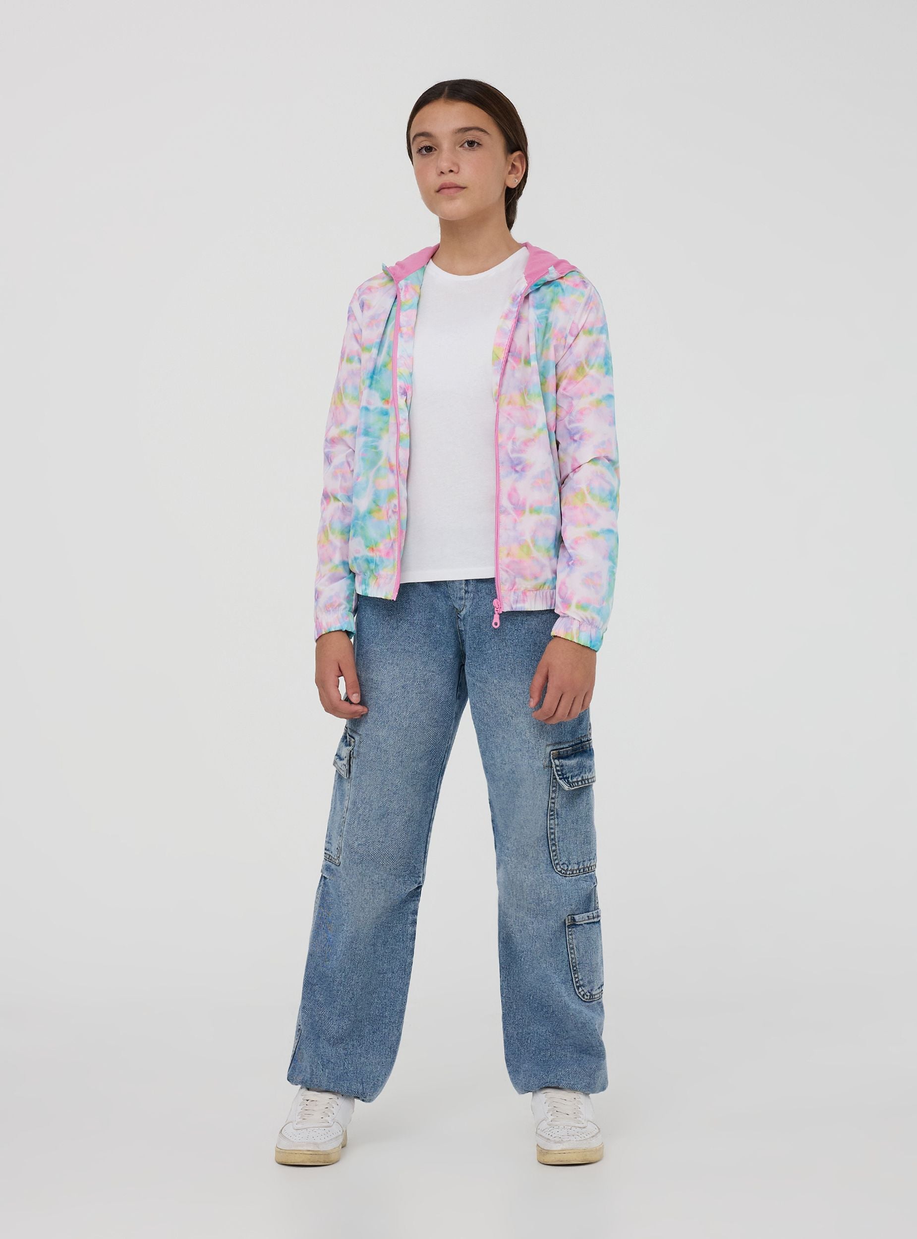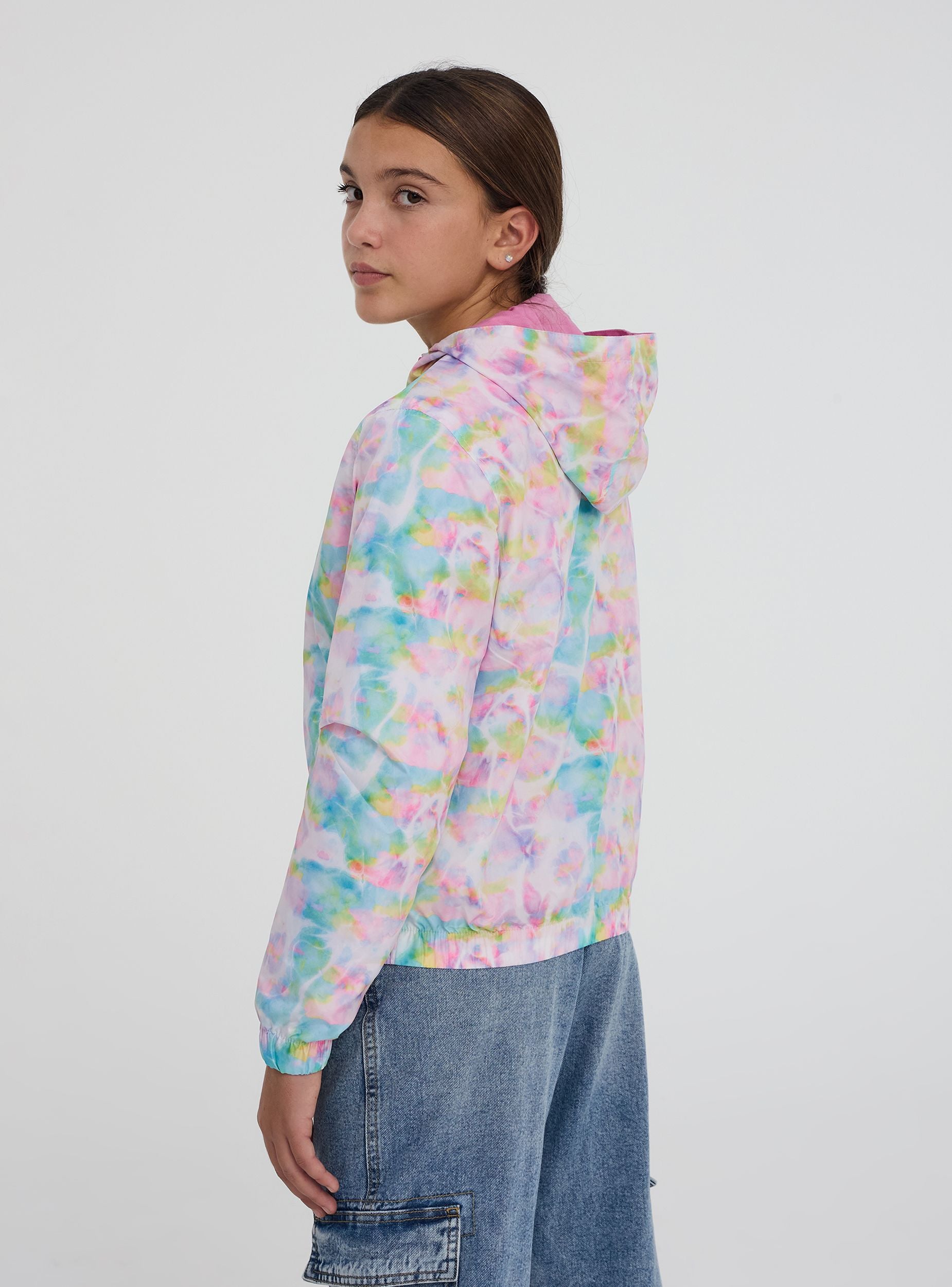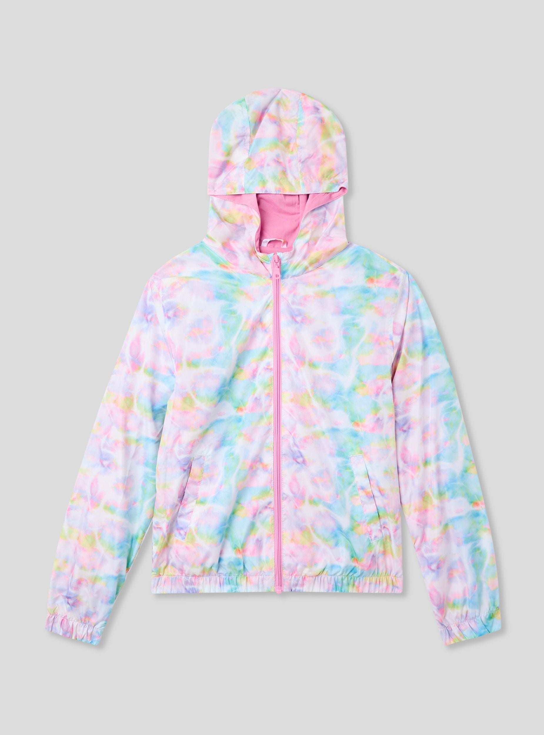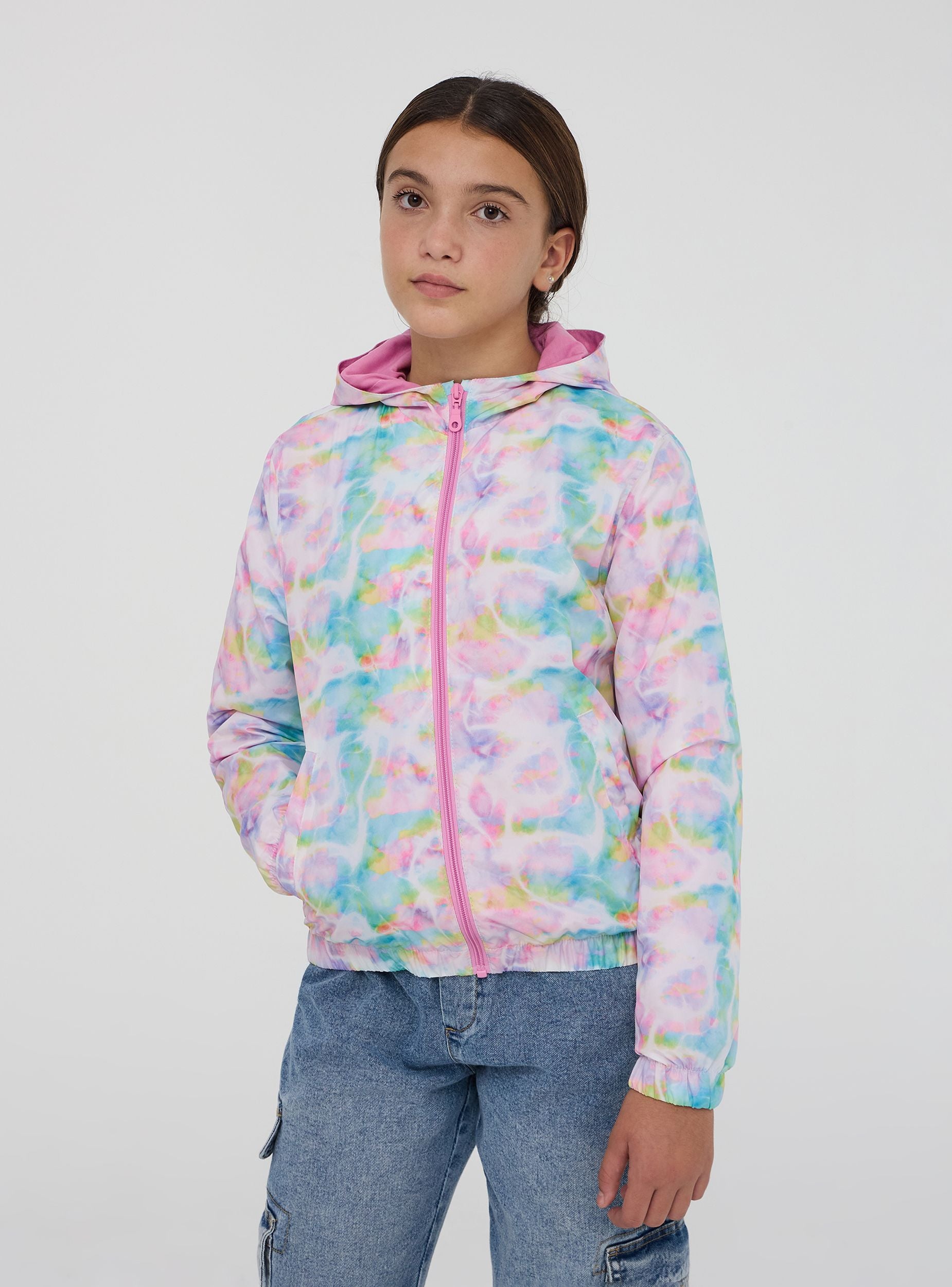 Giubbino antivento da bambina con fantasia vivace, dotato di cappuccio per una protezione extra contro vento e pioggia. Il modello presenta una pratica chiusura con zip frontale e tasche laterali con bottoni a pressione per tenere al sicuro piccoli oggetti. I polsini elasticizzati garantiscono una vestibilità aderente e confortevole, perfetta per le giornate più fresche e le attività all'aperto.Dettagli