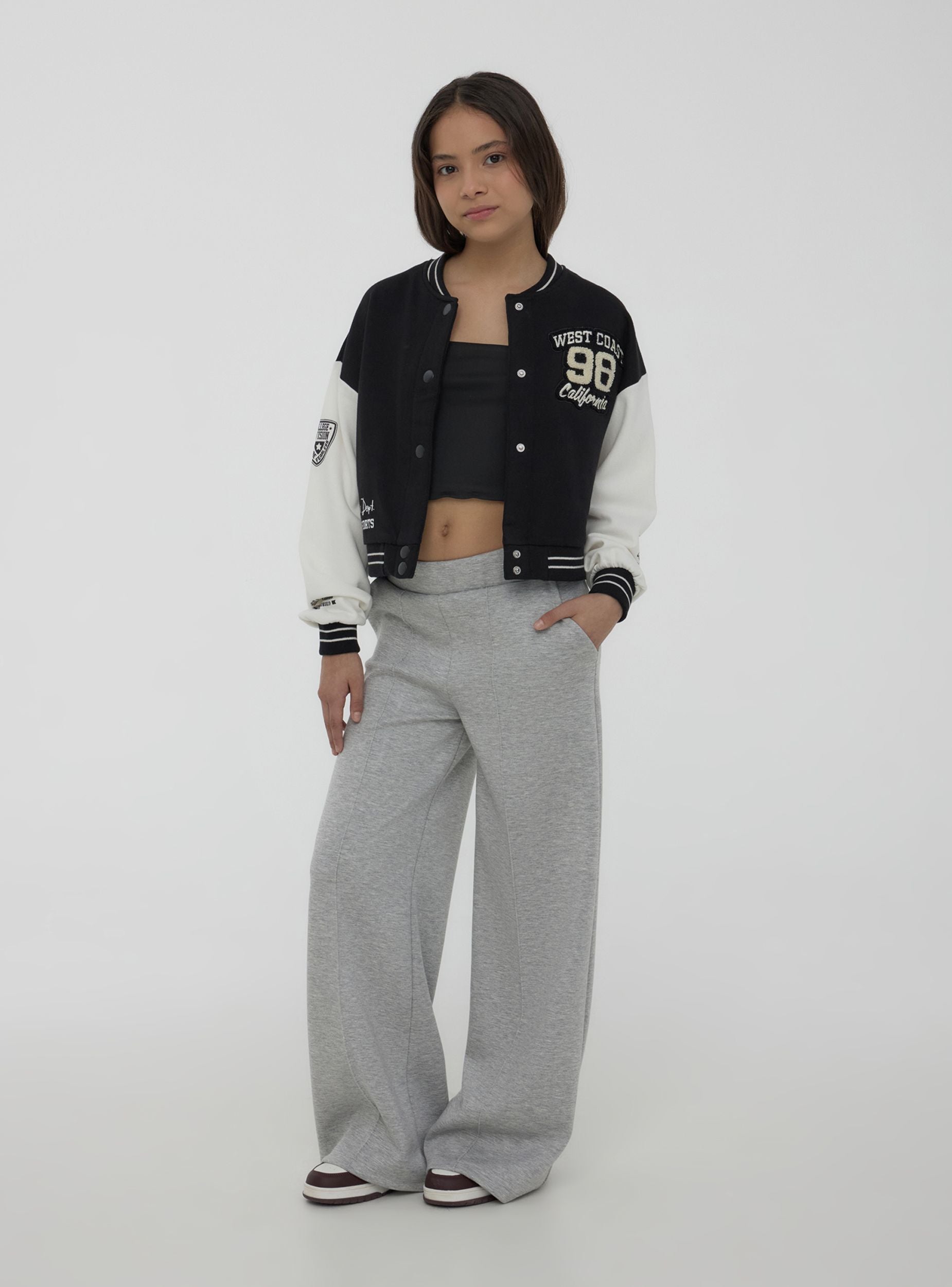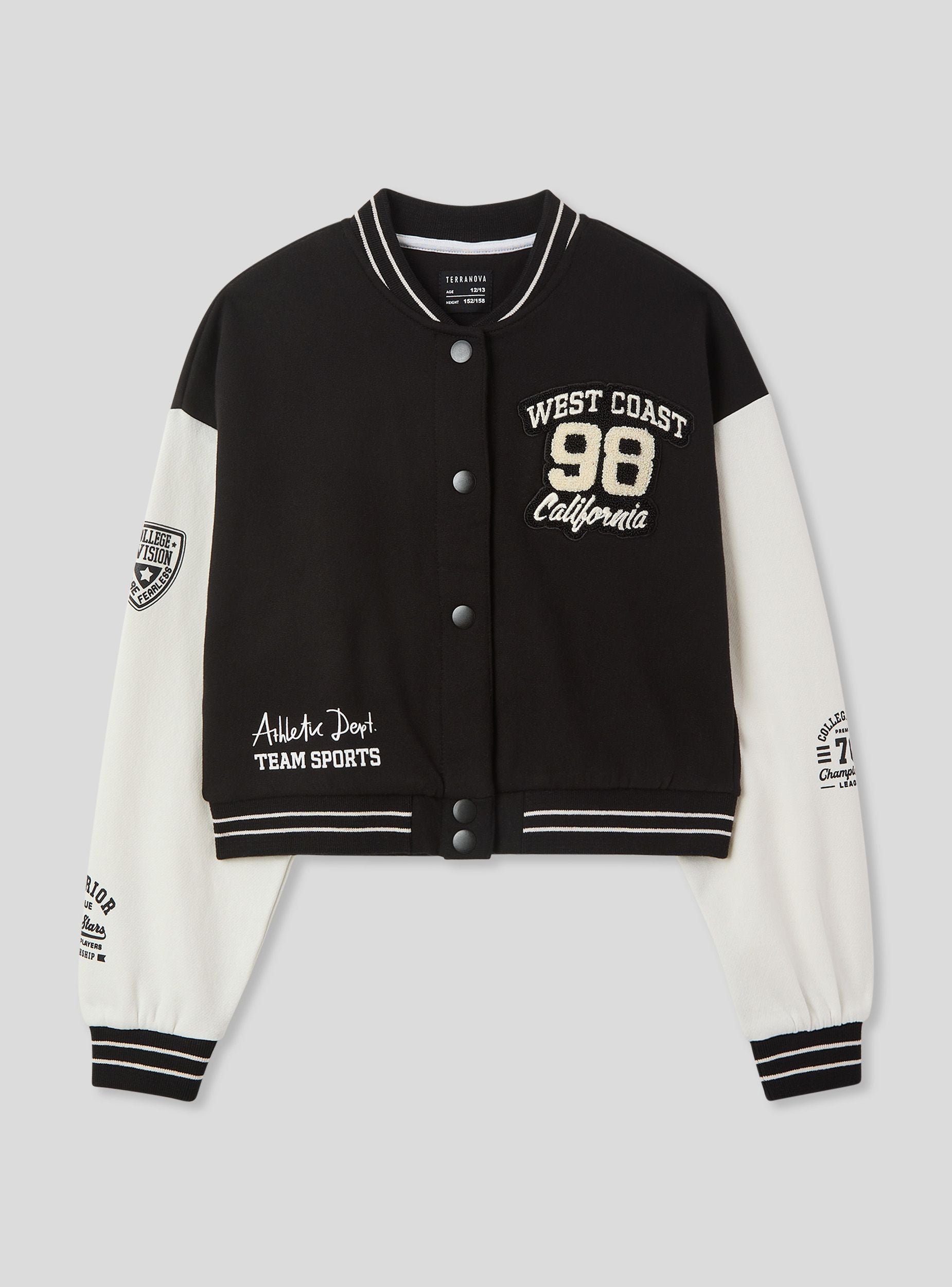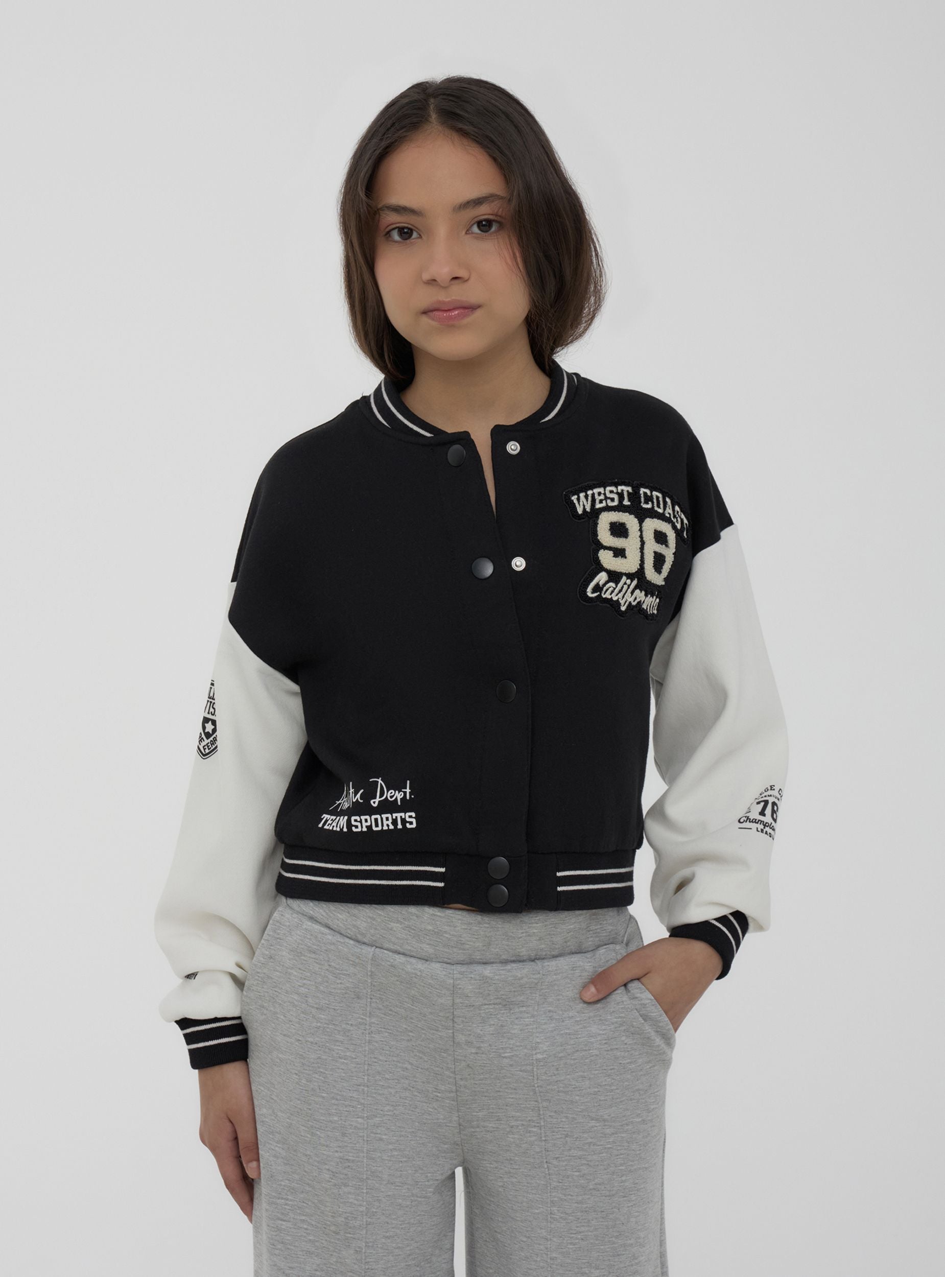 Giubbino da bambino dallo stile bomber, ideale per un look sportivo e dinamico. Realizzato in felpa pesante, offre comfort e protezione nelle mezze stagioni. La chiusura con bottoni a pressione aggiunge praticità, mentre le patch decorative sul petto e sulle maniche donano un tocco accattivante e ispirato al mondo college. Perfetto per il tempo libero, si abbina facilmente a jeans e sneakers per un outfit casual e contemporaneo.
