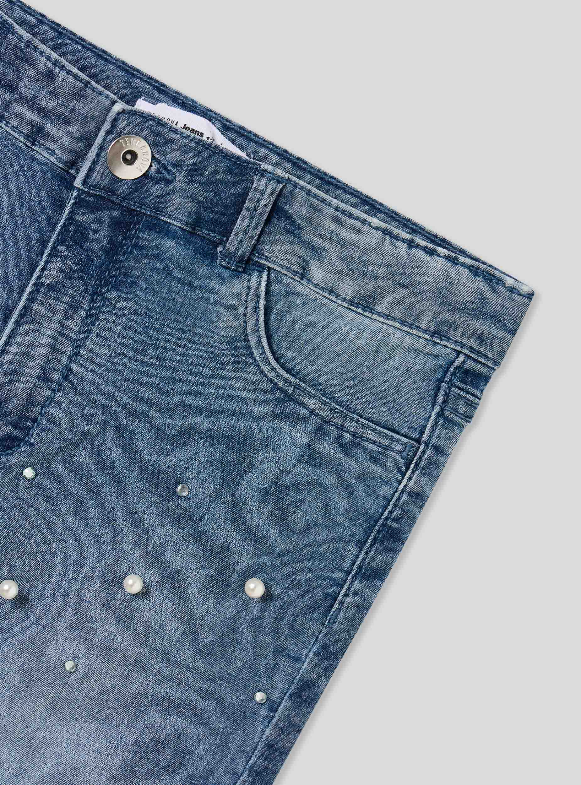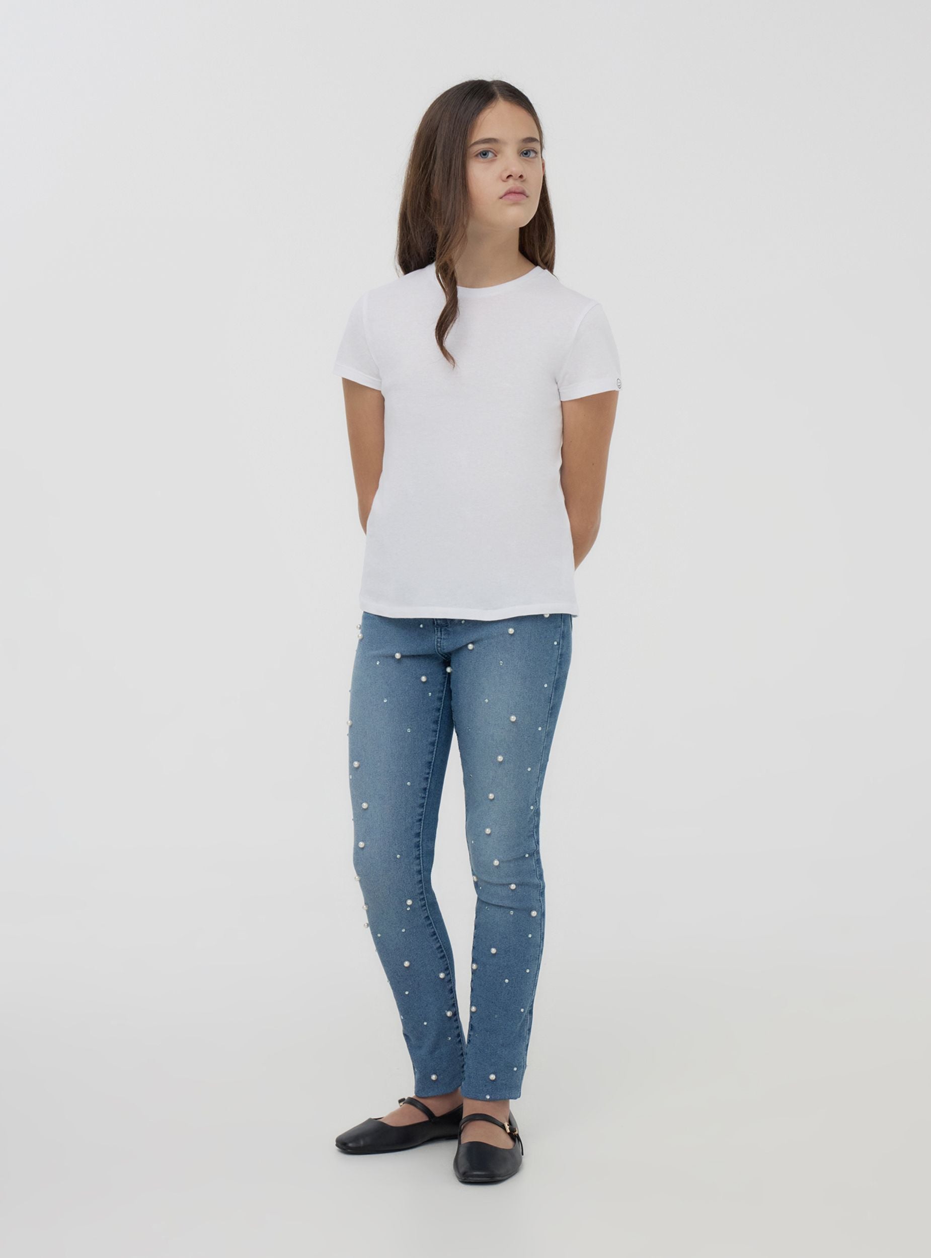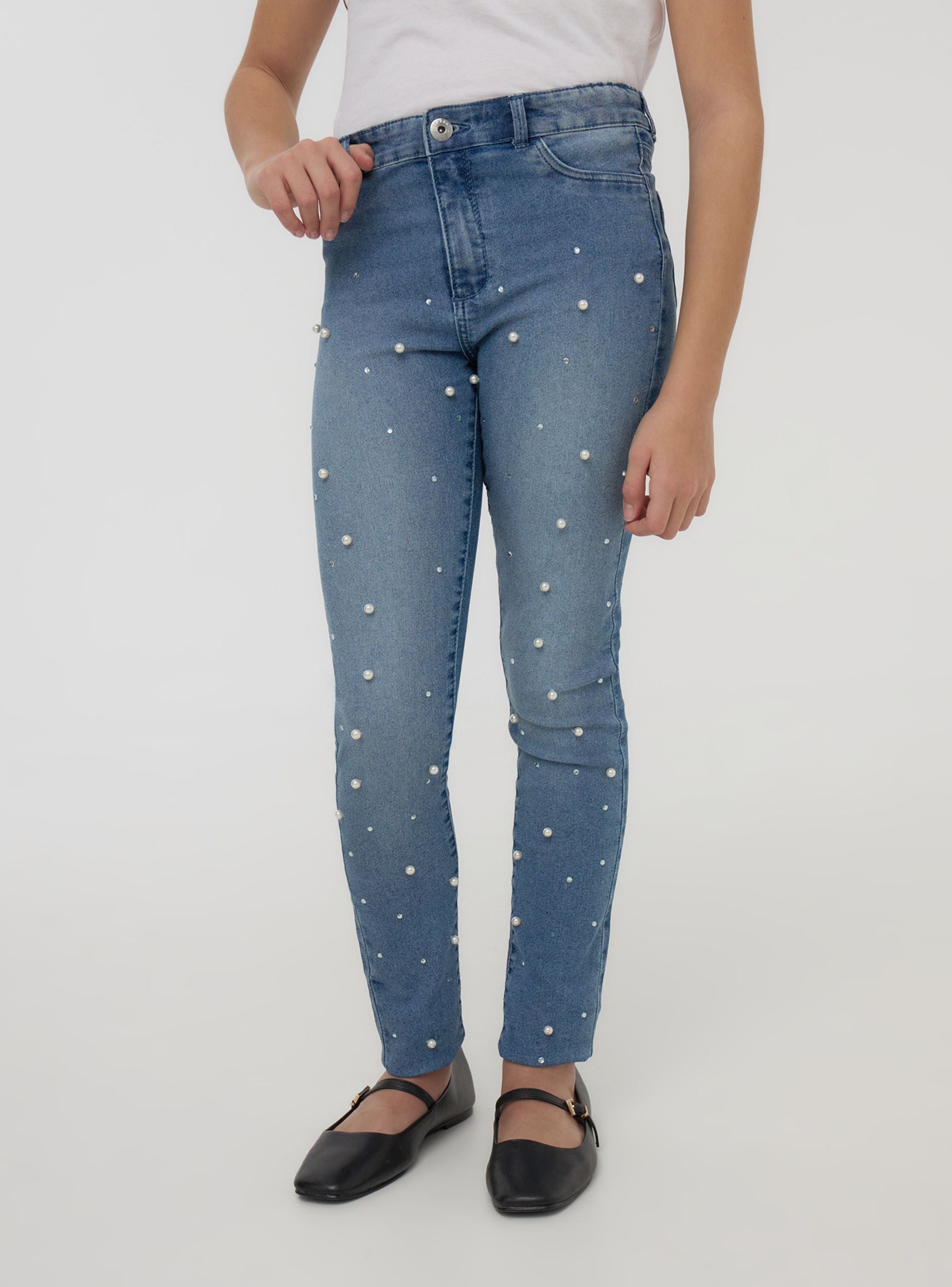 Jeans da bambina dal fit skinny, impreziositi da applicazioni di perle per un tocco raffinato e originale. Dotati di cinque tasche, passanti in vita e chiusura con bottone e zip, sono ideali per creare look versatili e alla moda. Perfetti da abbinare a maglioncini e ballerine per un outfit elegante o a t-shirt e sneakers per un look casual-chic adatto a ogni occasione.