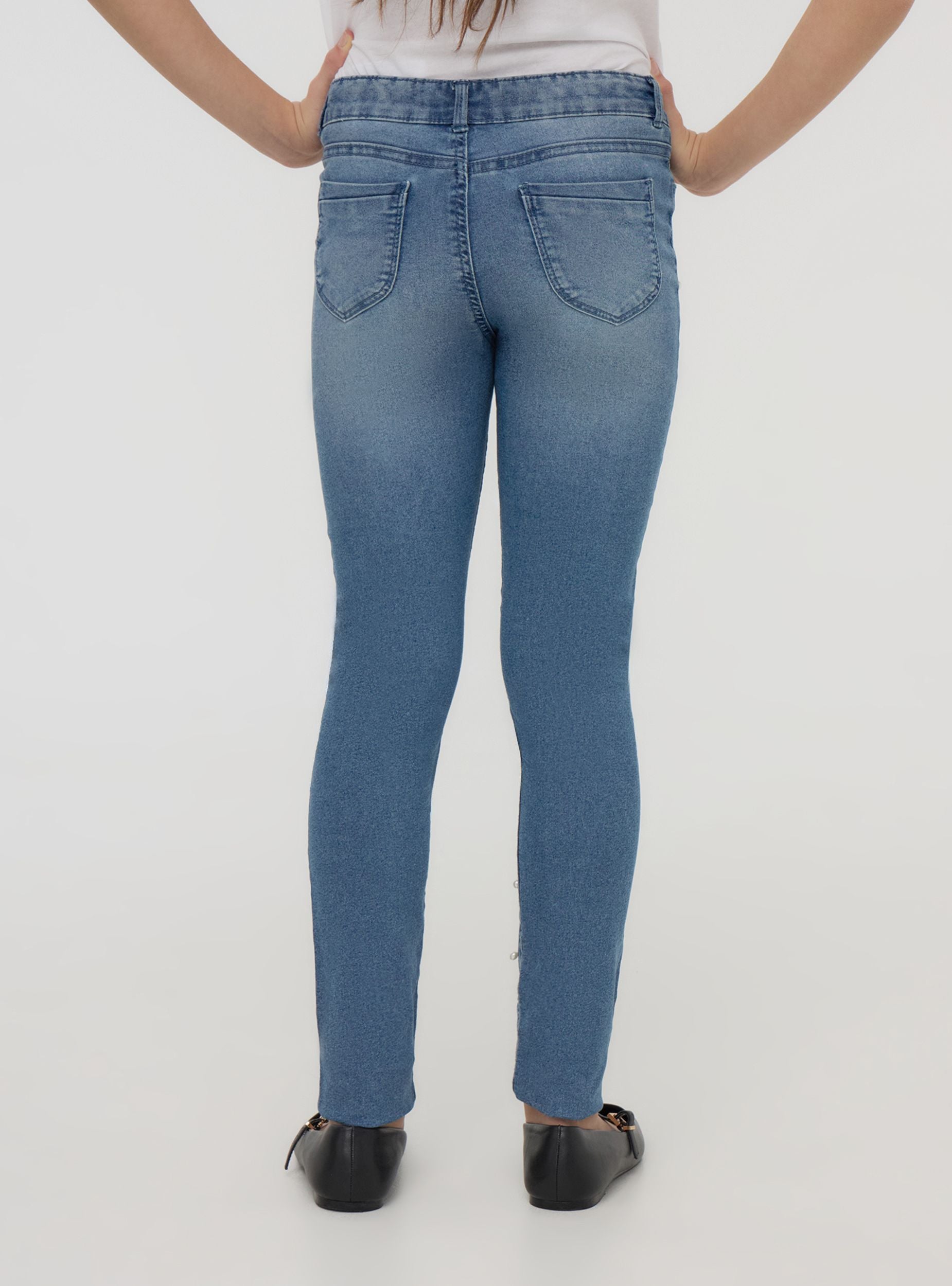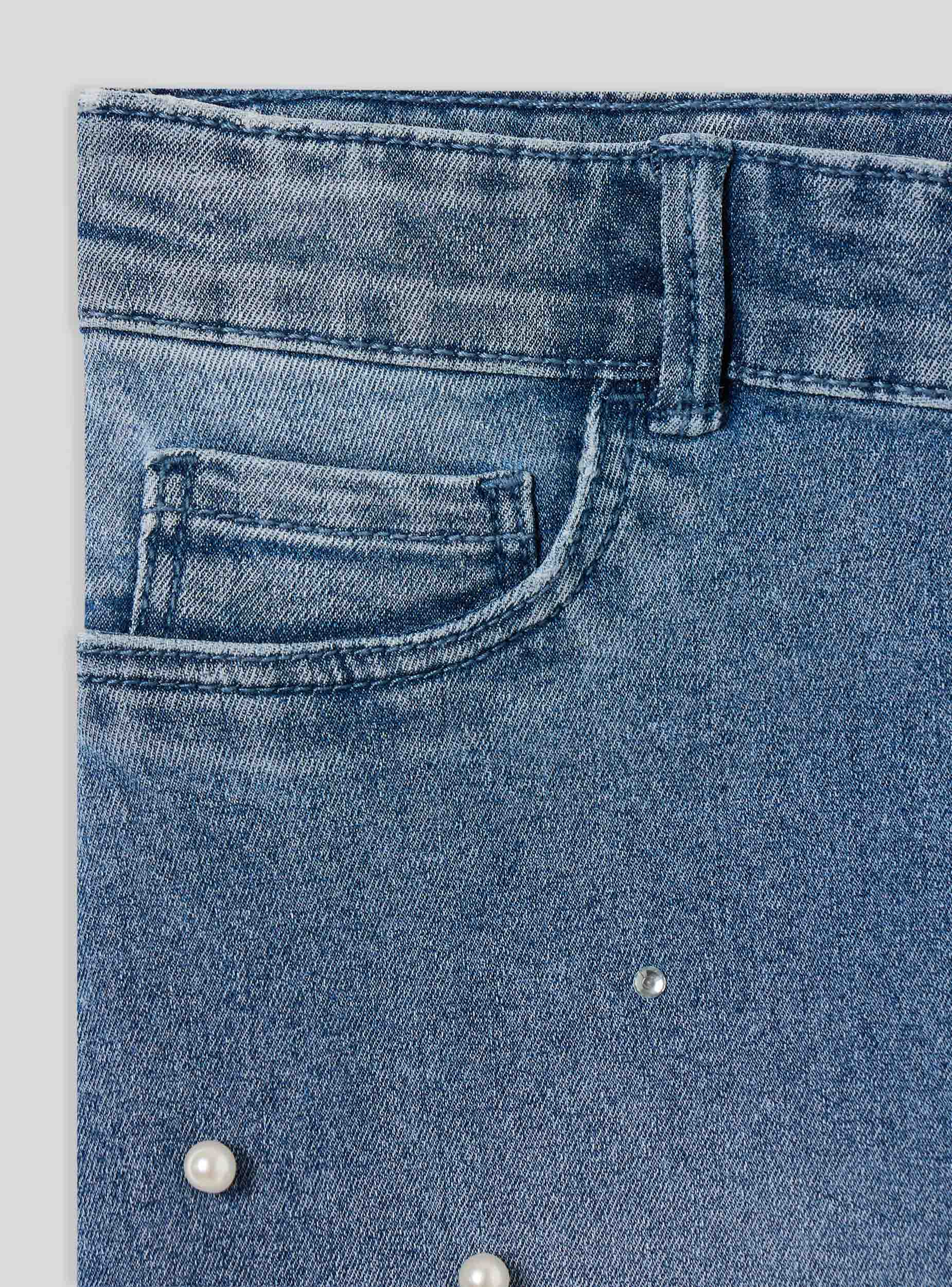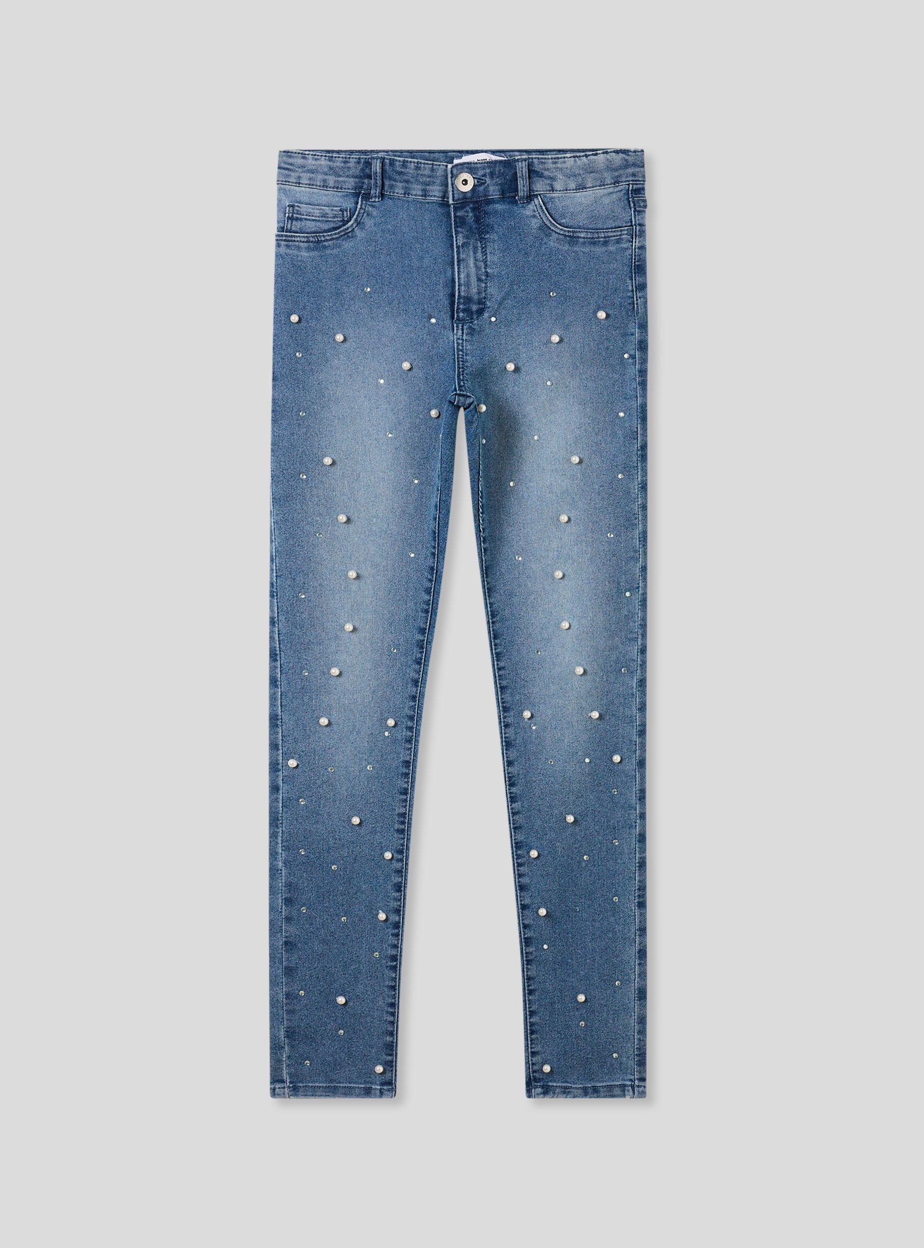 Jeans da bambina dal fit skinny, impreziositi da applicazioni di perle per un tocco raffinato e originale. Dotati di cinque tasche, passanti in vita e chiusura con bottone e zip, sono ideali per creare look versatili e alla moda. Perfetti da abbinare a maglioncini e ballerine per un outfit elegante o a t-shirt e sneakers per un look casual-chic adatto a ogni occasione.