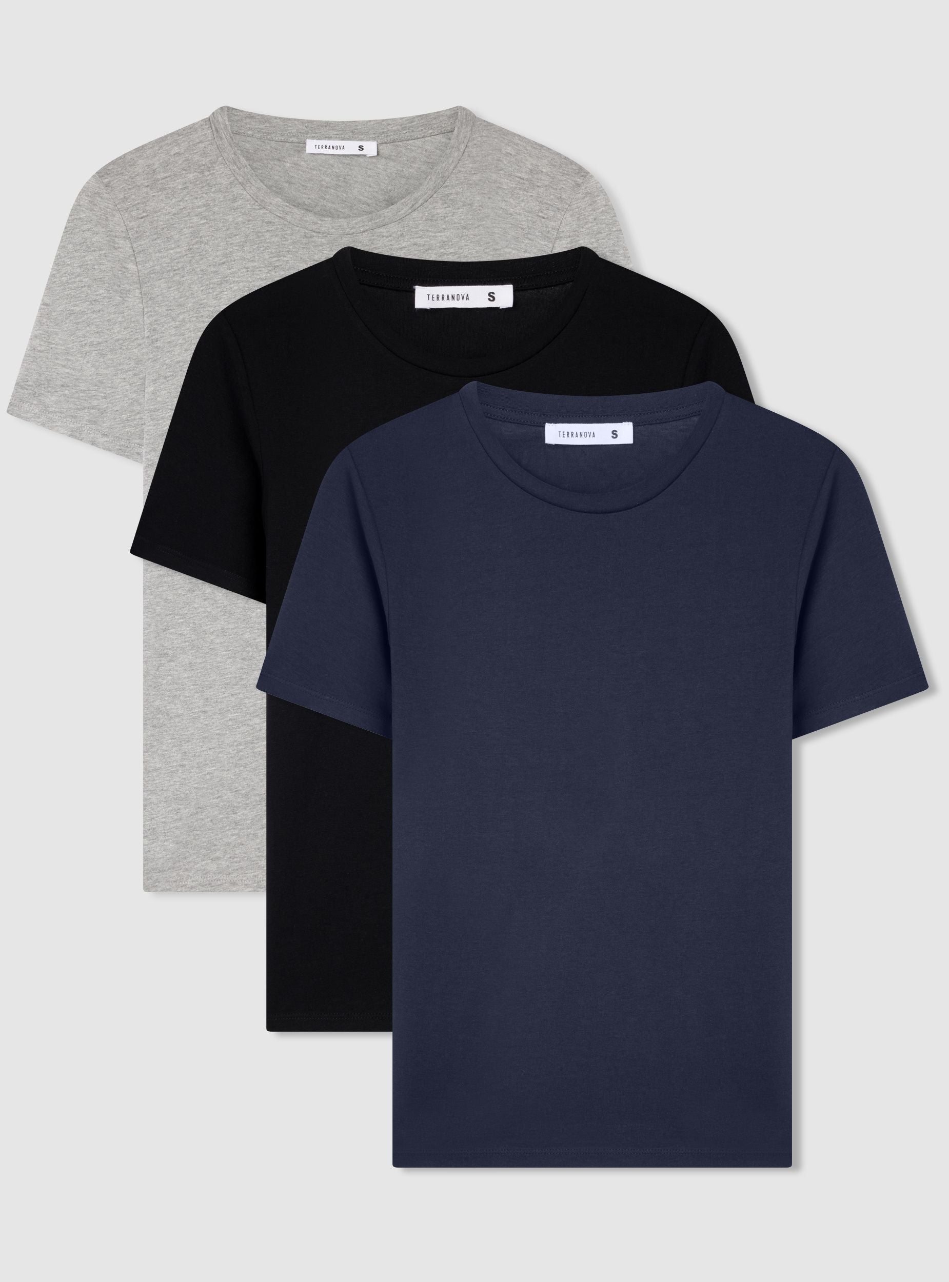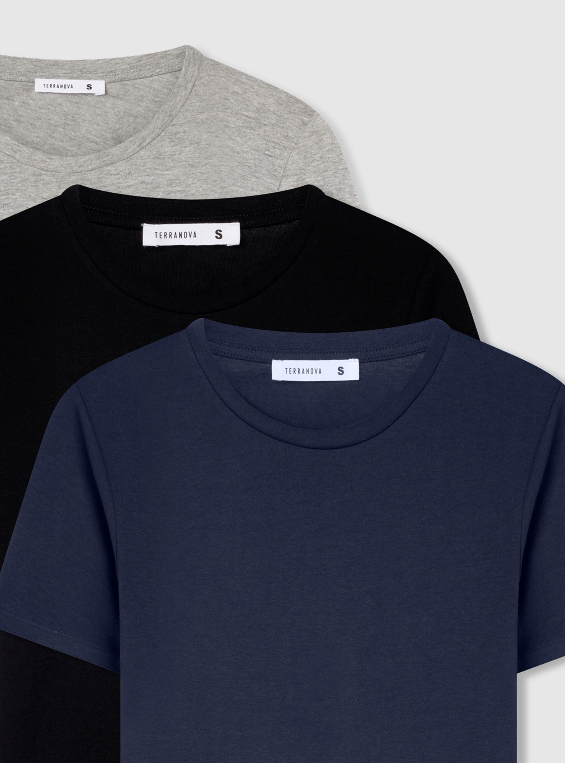 Confezione composta da 3 magliette da donna, tutte con un taglio regolare e il girocollo. Ogni maglietta ha maniche corte e un design essenziale a tinta unita. Ideali per un look casual e versatile, perfette per essere abbinate a diversi stili, offrendo comfort e praticità per l'uso quotidiano.Dettagli