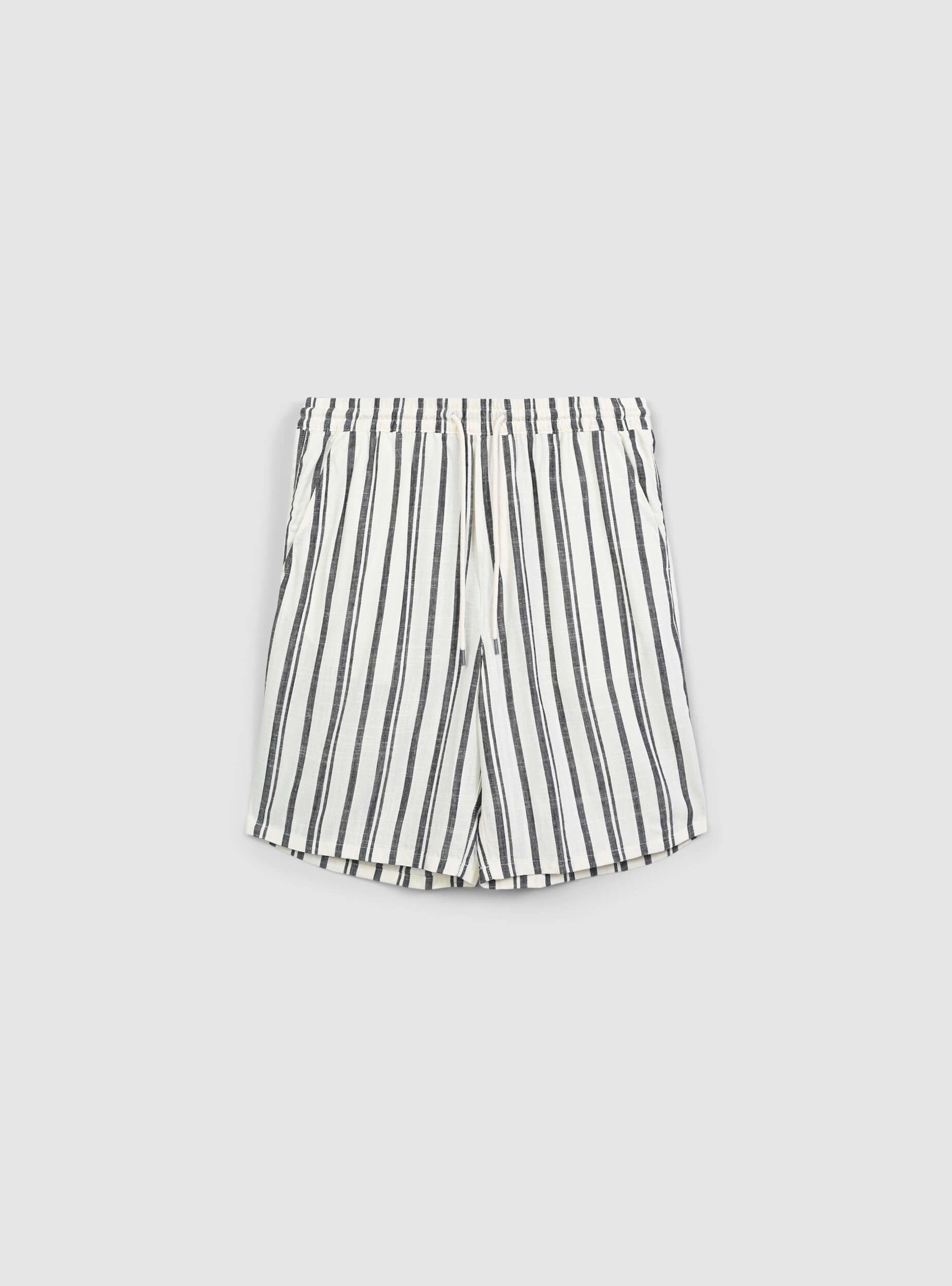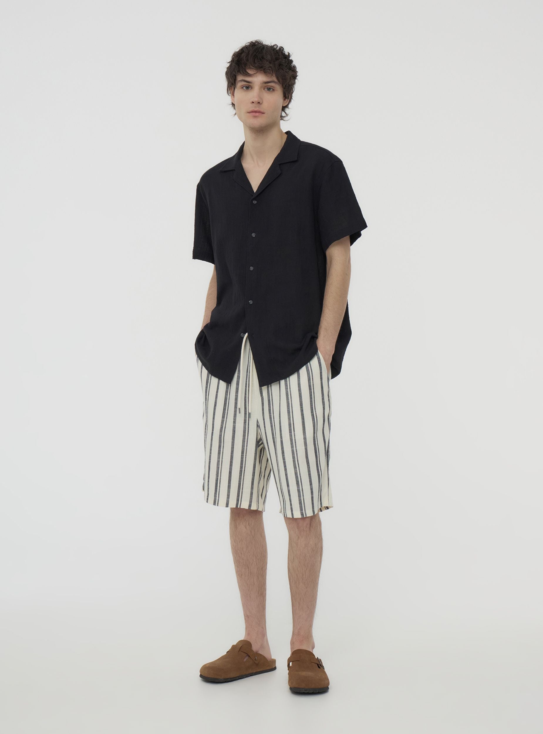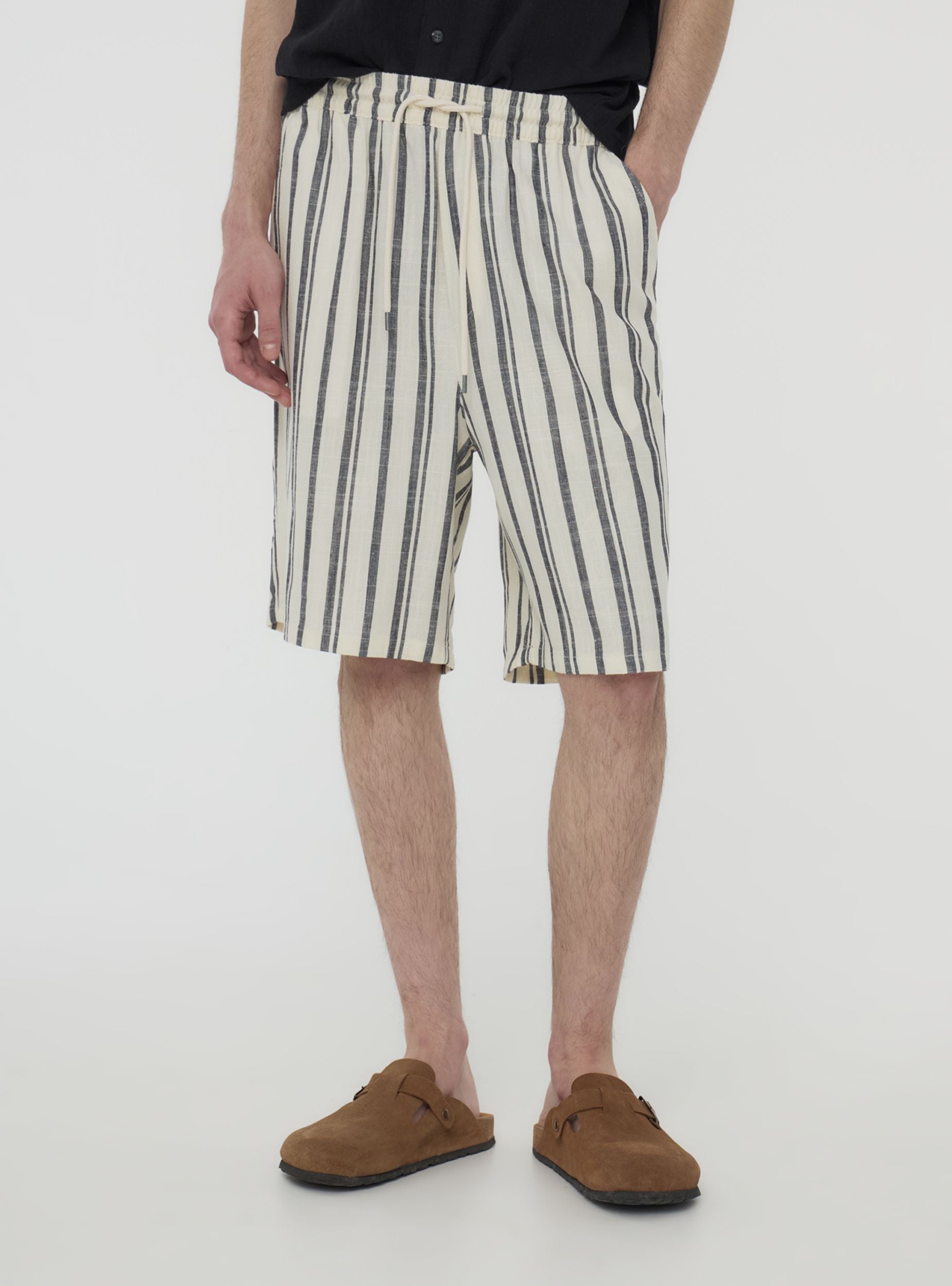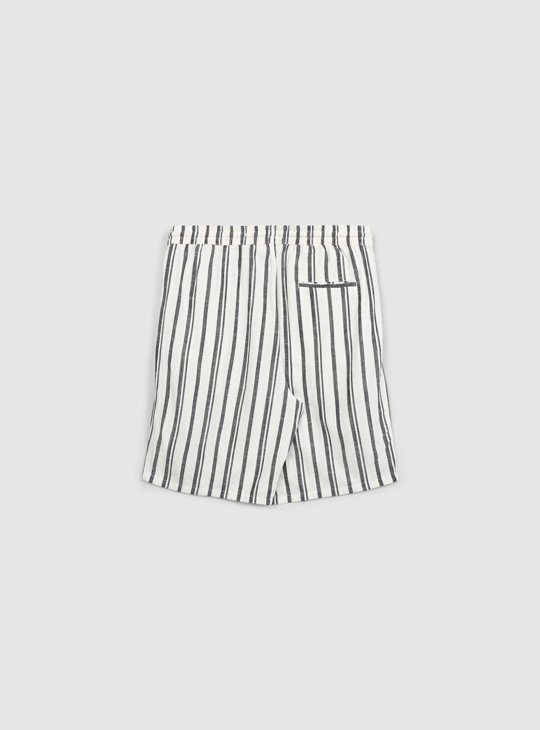 Pantaloncini corti da uomo realizzati in tessuto misto lino, sono ideali per un look casual e rilassato, e perfetti per il tempo libero o le giornate estive. Caratterizzati da una vestibilità regolare, presentano un design con righe sfalsate e una chiusura con coulisse. Dotati di tasche laterali ed elastico in vita offrono comfort e stile per ogni occasione informale.