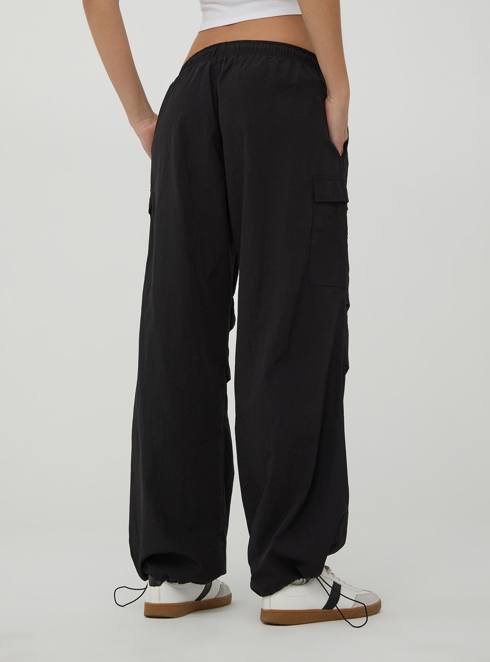 Pantaloni parachute da donna in nylon a tinta unita. Versatili per molteplici abbinamenti, offrono comfort e praticità. Presentano tasche cargo laterali ampie e funzionali, un elastico in vita regolabile e laccetti alle caviglie per una vestibilità su misura. Il loro stile ampio li rende perfetti per outfit casual.Dettagli