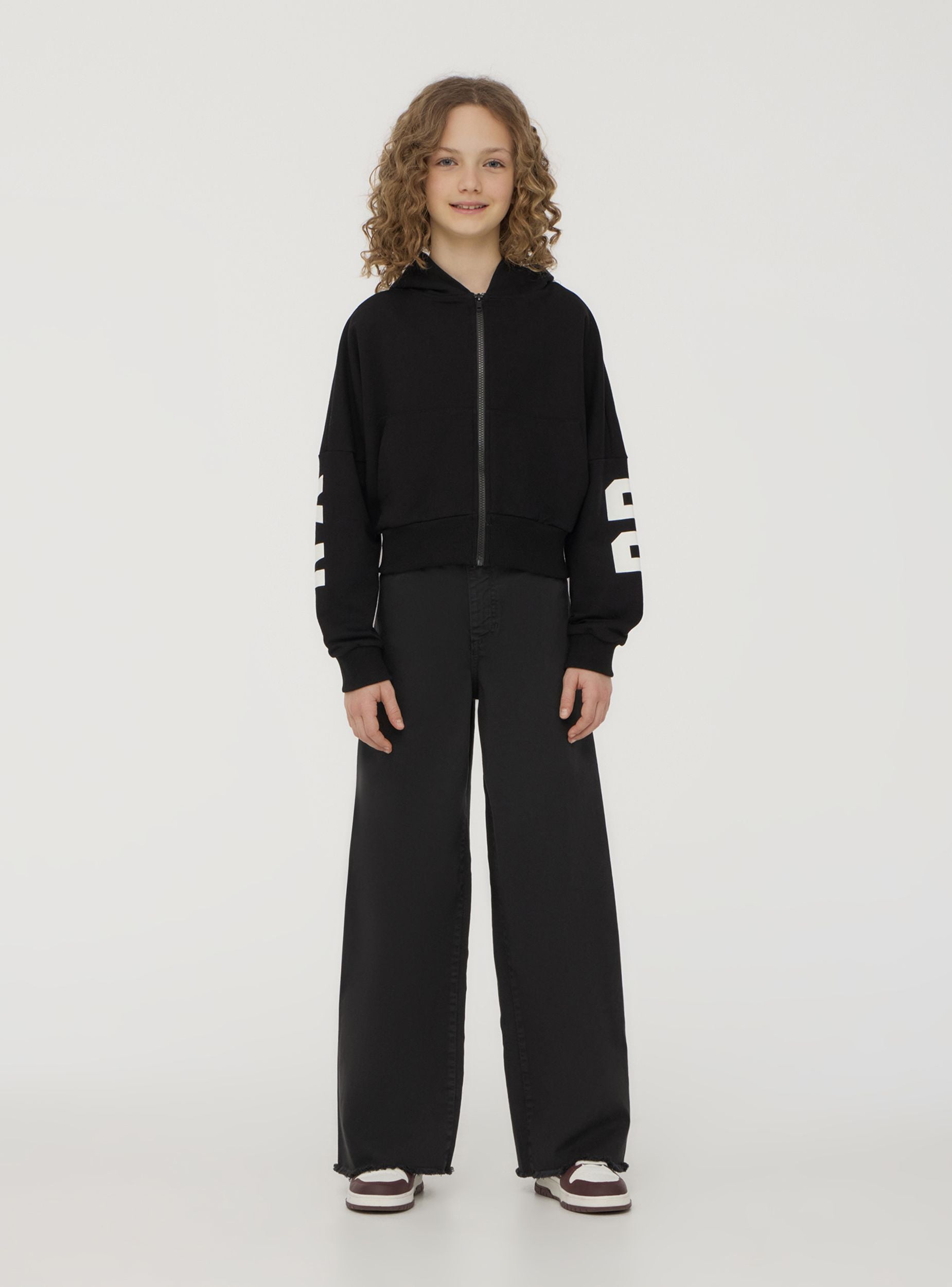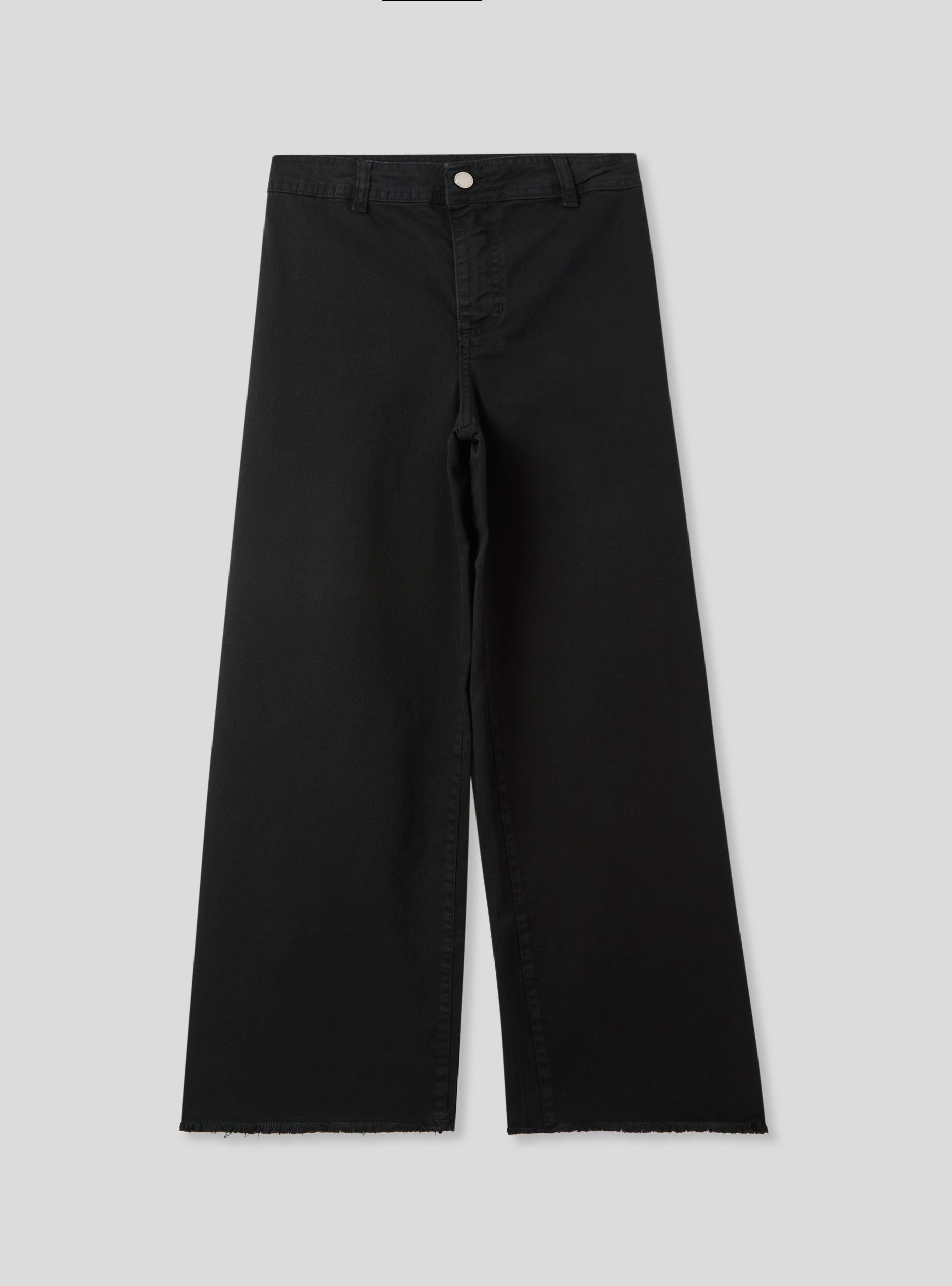 Pantaloni da bambina lunghi a tinta unita con taglio wide leg, perfetti per un look moderno e di tendenza. Il fondo sfrangiato aggiunge un tocco originale, mentre i passanti in vita e la chiusura con bottone garantiscono comfort e praticità. Ideali per outfit casual con sneakers e t-shirt o per occasioni più ricercate con camicetta e sandali.